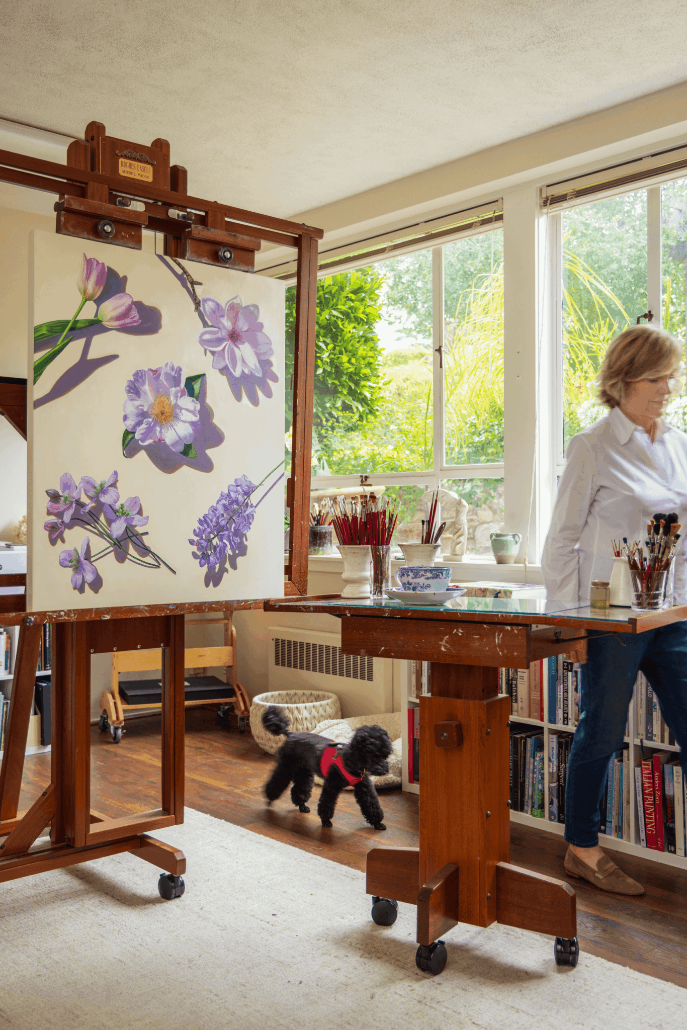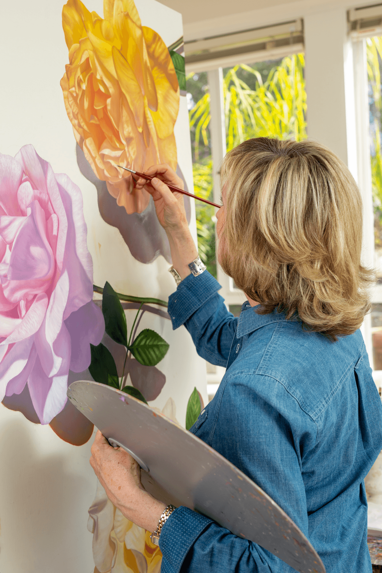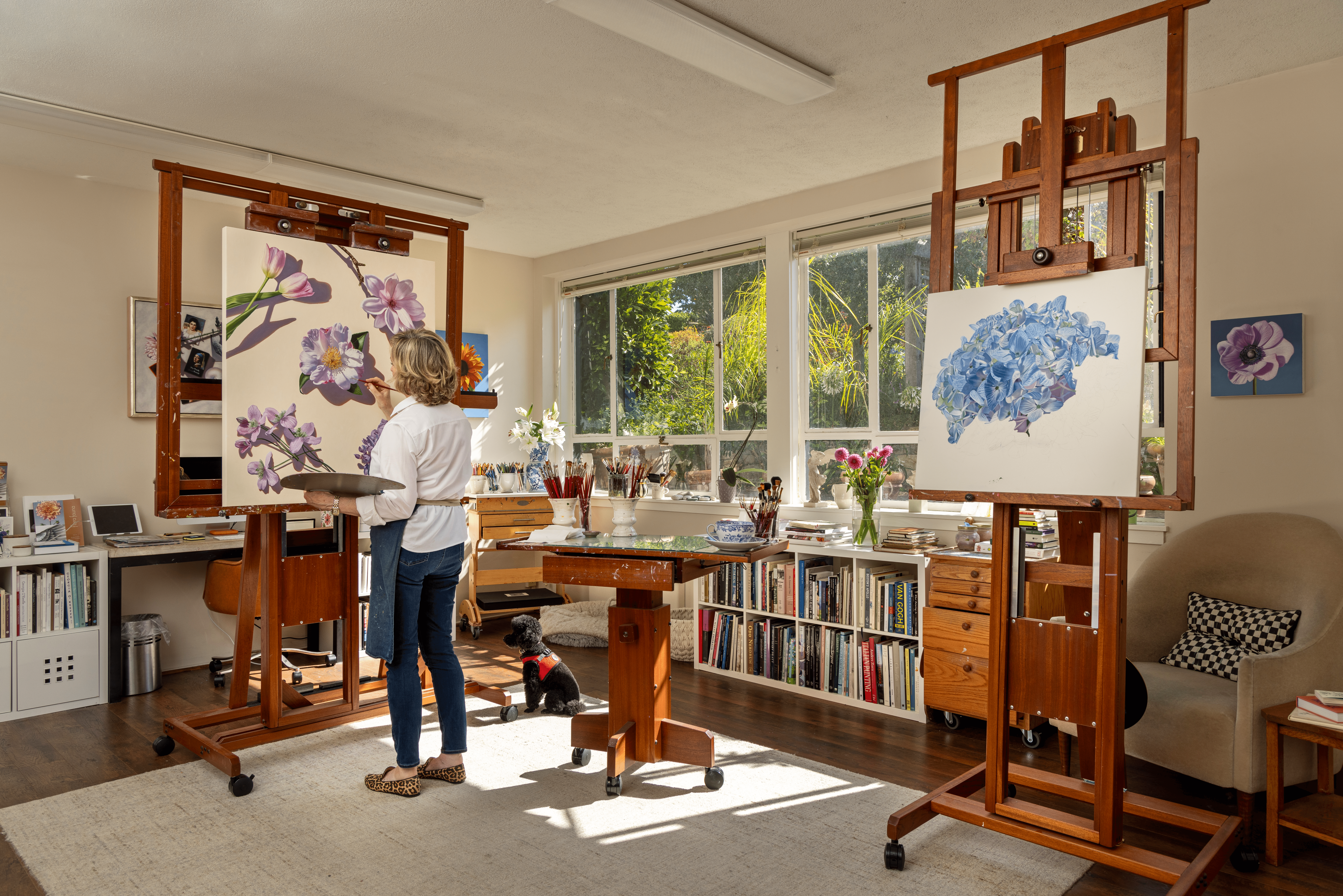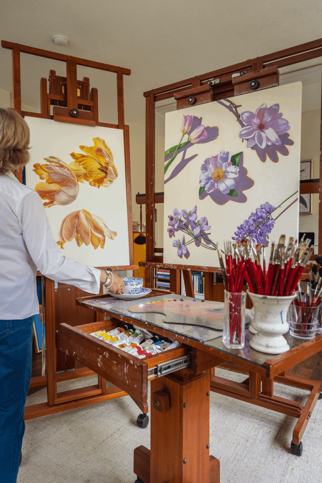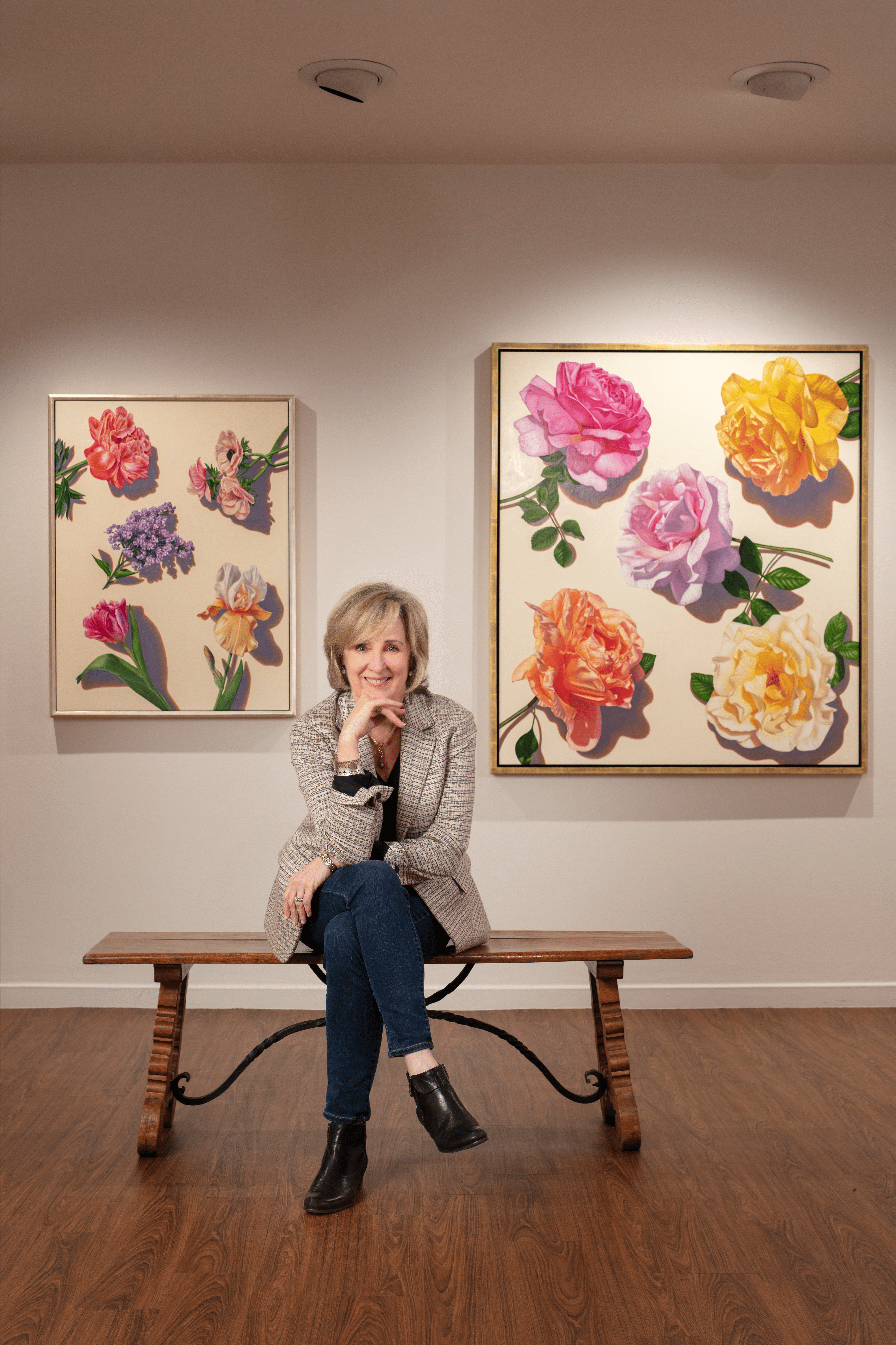 I am a contemporary still-life artist and I paint large, hyperrealistic oil paintings of flowers. When I lived in San Francisco, I was known for my Portraits in Absentia series of paintings, in which I devised an innovative approach to portraiture. In collaboration with my clients, I composed arrangements of their most meaningful possessions, such as books, shoes, personal treasures. Although I no longer create them, the Portraits in Absentia series was well-received and exhibited often.
