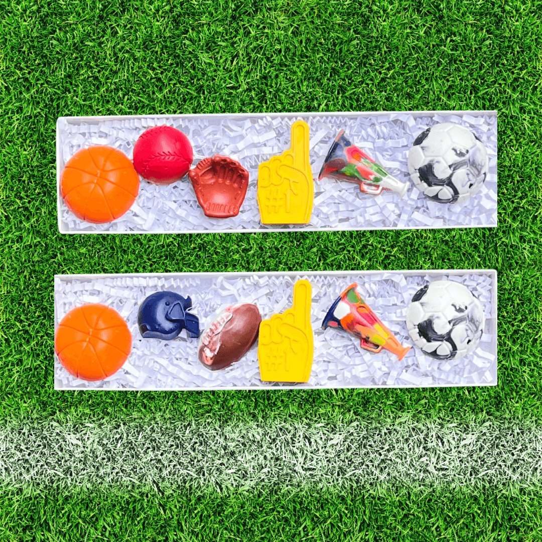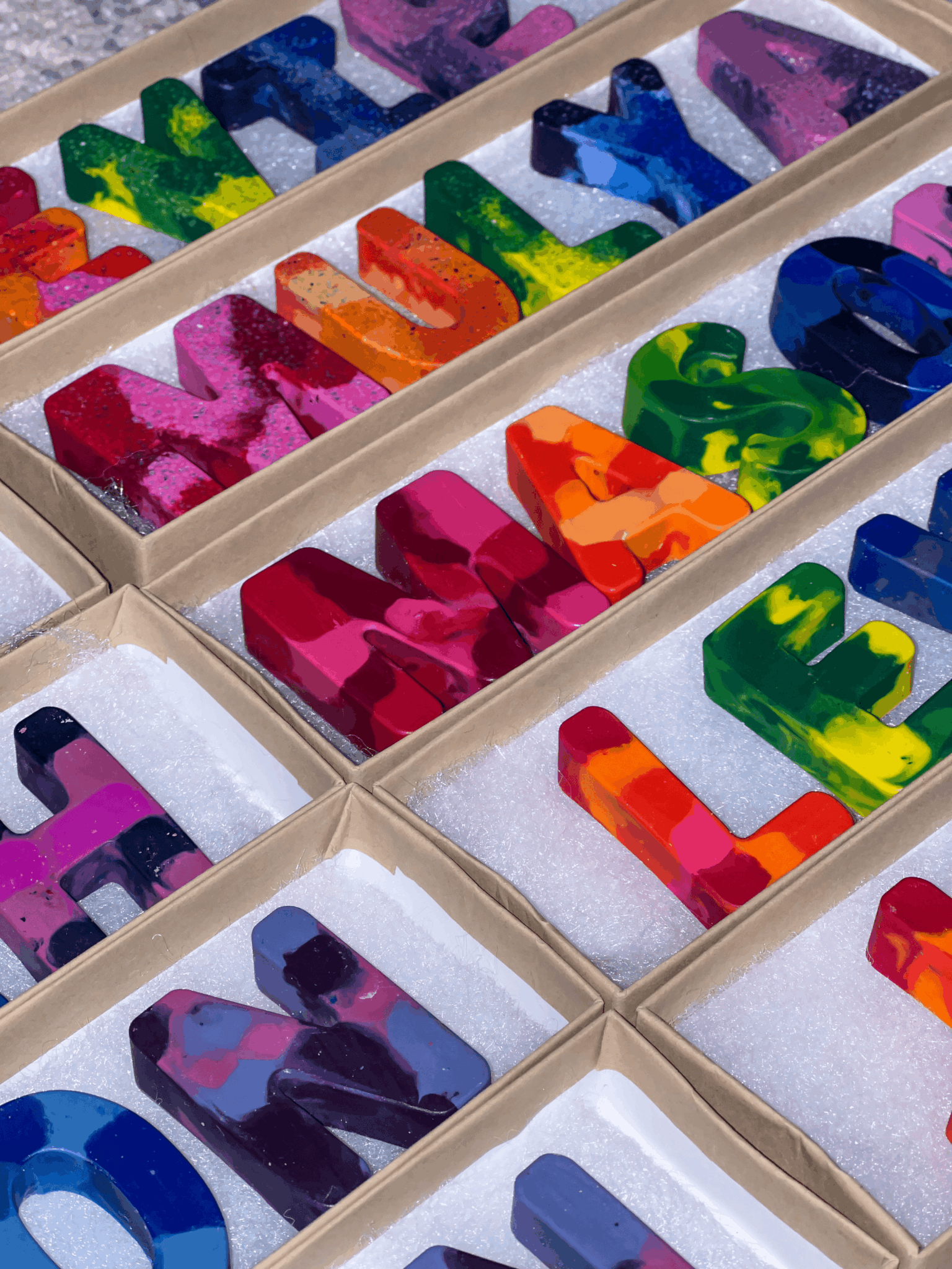 We make personalized crayons. Our rainbow colored crayons are the most popular with each letter or shape being a different color of the rainbow.