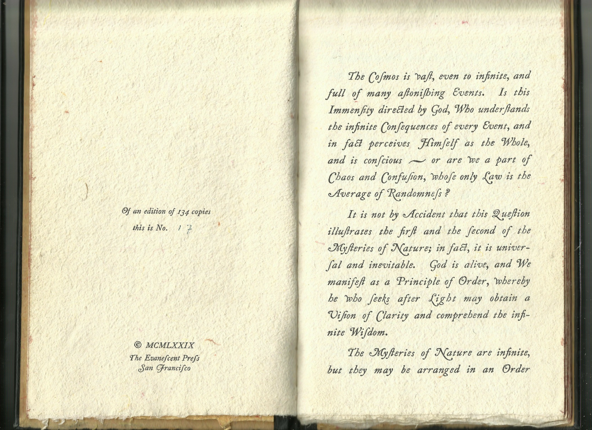 I have felt like a voice crying in the wilderness, with no one listening. Sometimes, when someone takes a look at one of my books, such as the Theophany, they look at the fine binding; they look at the handmade paper; they look at the letterpress print, and then they hand it back, saying, “Very fine, indeed ! Very nice work !” But it never occurs to anyone to actually read the book ! I remember one of the few persons who actually read the book was Chogyam Trungpa, Rinpoche, a teacher of Tibetan Buddhism, to whom I showed my book after one of his classes. He took the book and read it very carefully from beginning to end, and then he said, with some surprise, “Yes, this is right !”