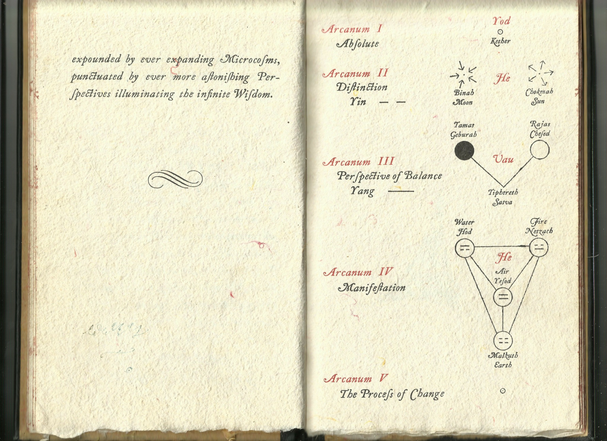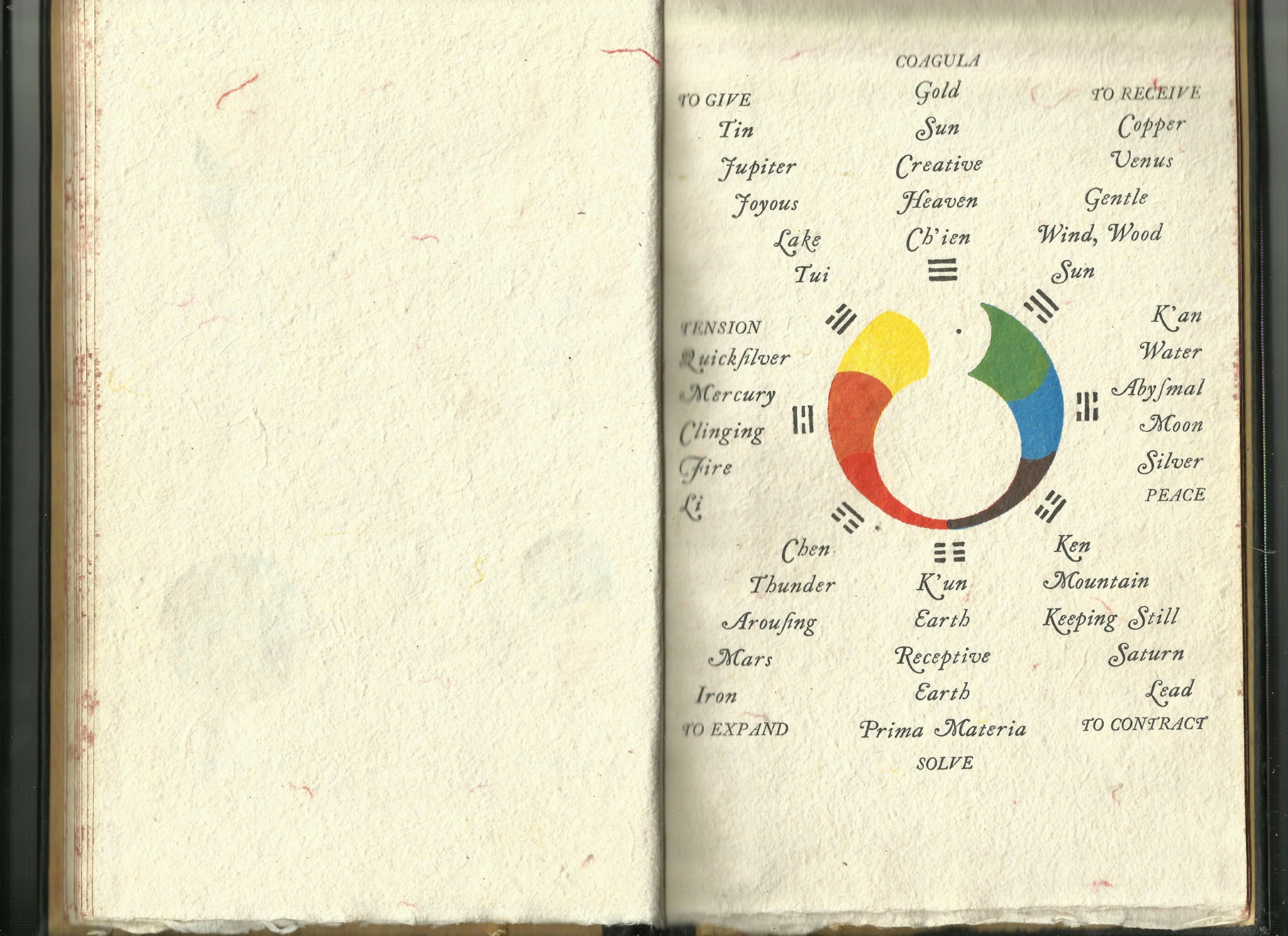 Theophany, in 1979, was a very elaborate production done on hand made paper, featuring four full color illustrations, printed by letterpress from hand set type, and hand bound over cords in leather covers, gold tooled, with gilt edges. In my description of the book I wrote: “This ambitious project follows the Lapis Philosophorum as the author’s attempt to express the primary abstract patterns which underlie the functioning of the cosmos. It incorporates a lot of new material: relating the abstract patterns of metaphysics to the Tetragrammaton and the Tree of Life from the Kabbalah, and relating the planets and metals of astrology and alchemy to the trigrams of the I Ching.