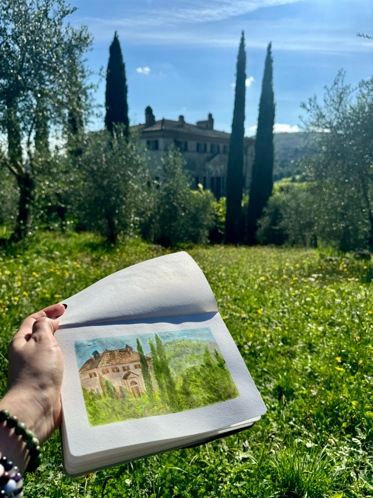 One project I’m especially excited about is a commissioned Italian watercolor sketchbook I’m creating as a wedding gift for two friends who recently got married in Siena, Italy. During their wedding weekend, I spent time painting the beautiful scenery, capturing memories of the villa and surrounding landscapes. One of the grooms saw me working and asked for a commission of the villa itself—but I had to tell him it was already part of their wedding gift! It’s been such a rewarding project, blending travel, memory, and creativity into one meaningful piece.