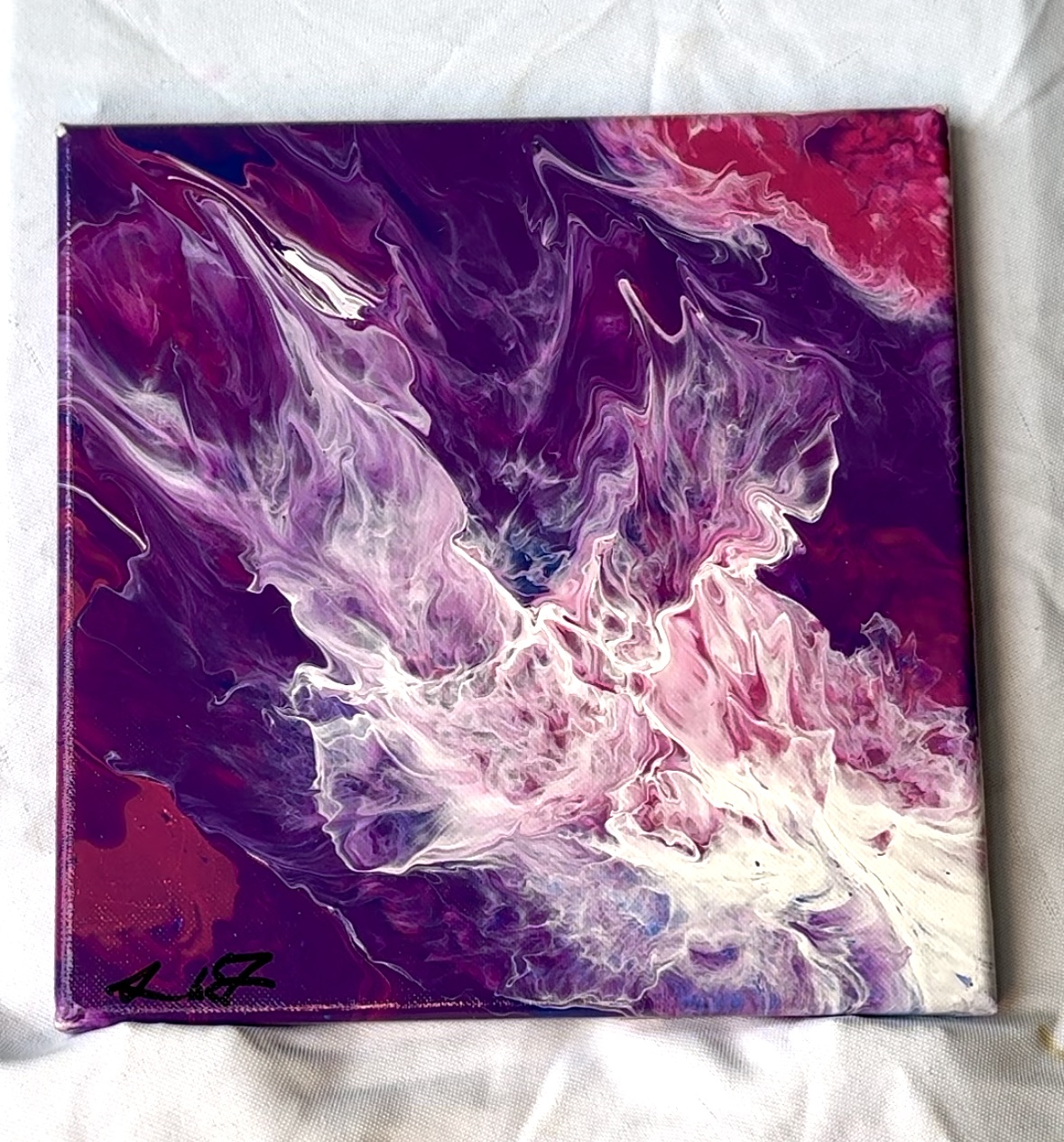 I was fortunate to have my parents’ support during that time, something I deeply appreciate knowing not everyone had that safety net. The pandemic pushed me to try a variety of things: I worked as a receptionist, server, and even a donut maker before landing a corporate job. It was also when I started painting more regularly—initially as a way to pass the time. In fact, all of my fluid art pieces were created during the height of COVID in 2020.