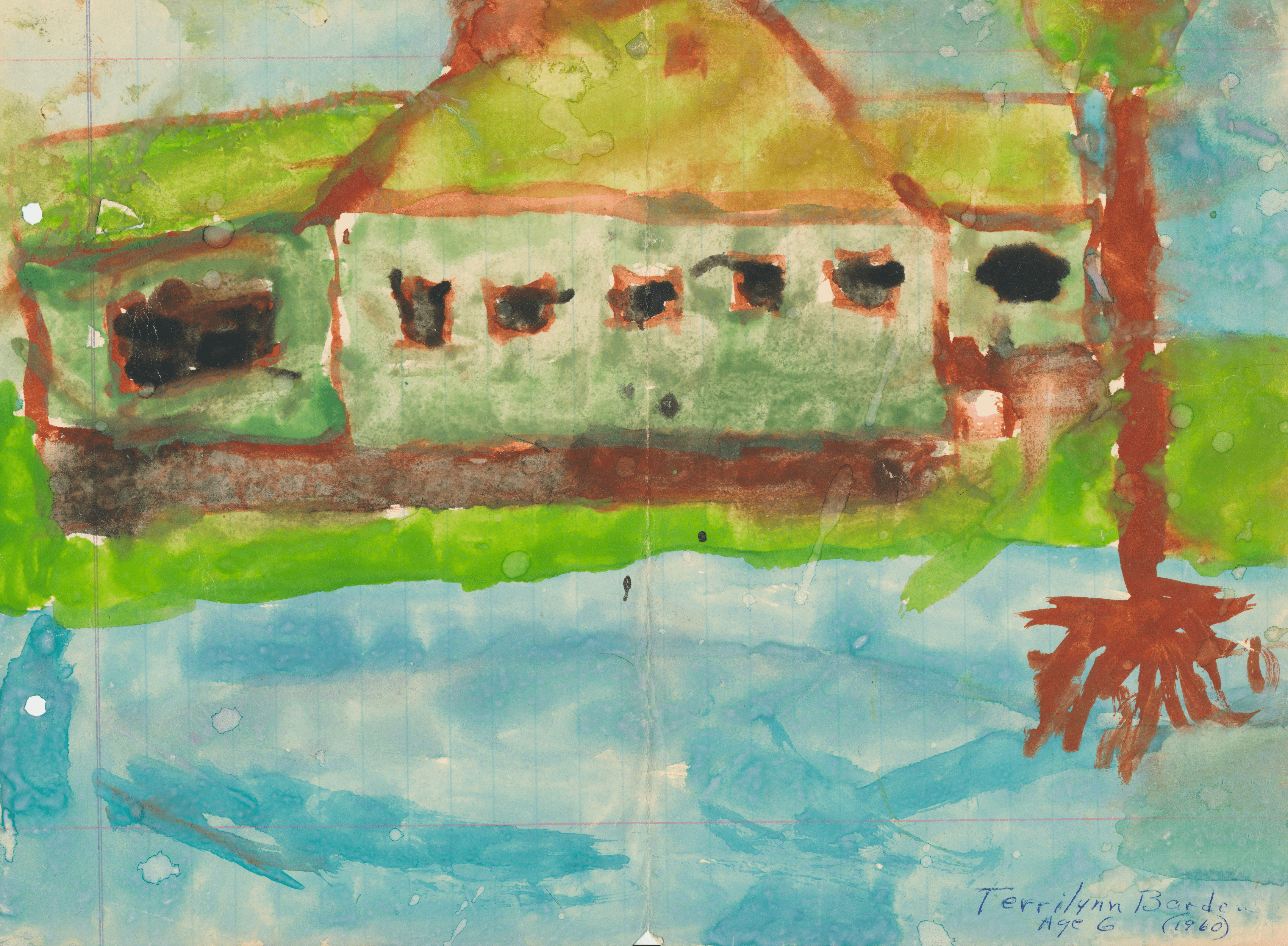 My first watercolor painting was on lined composition paper. Created when I was 6 years old. I came across it when I cleaning out my parents’ home after their passing. It is a painting of our house on the lake, from the lake view, with shadows and reflections in the water. Looking at it objectively, I’m impressed with the ability of the child.