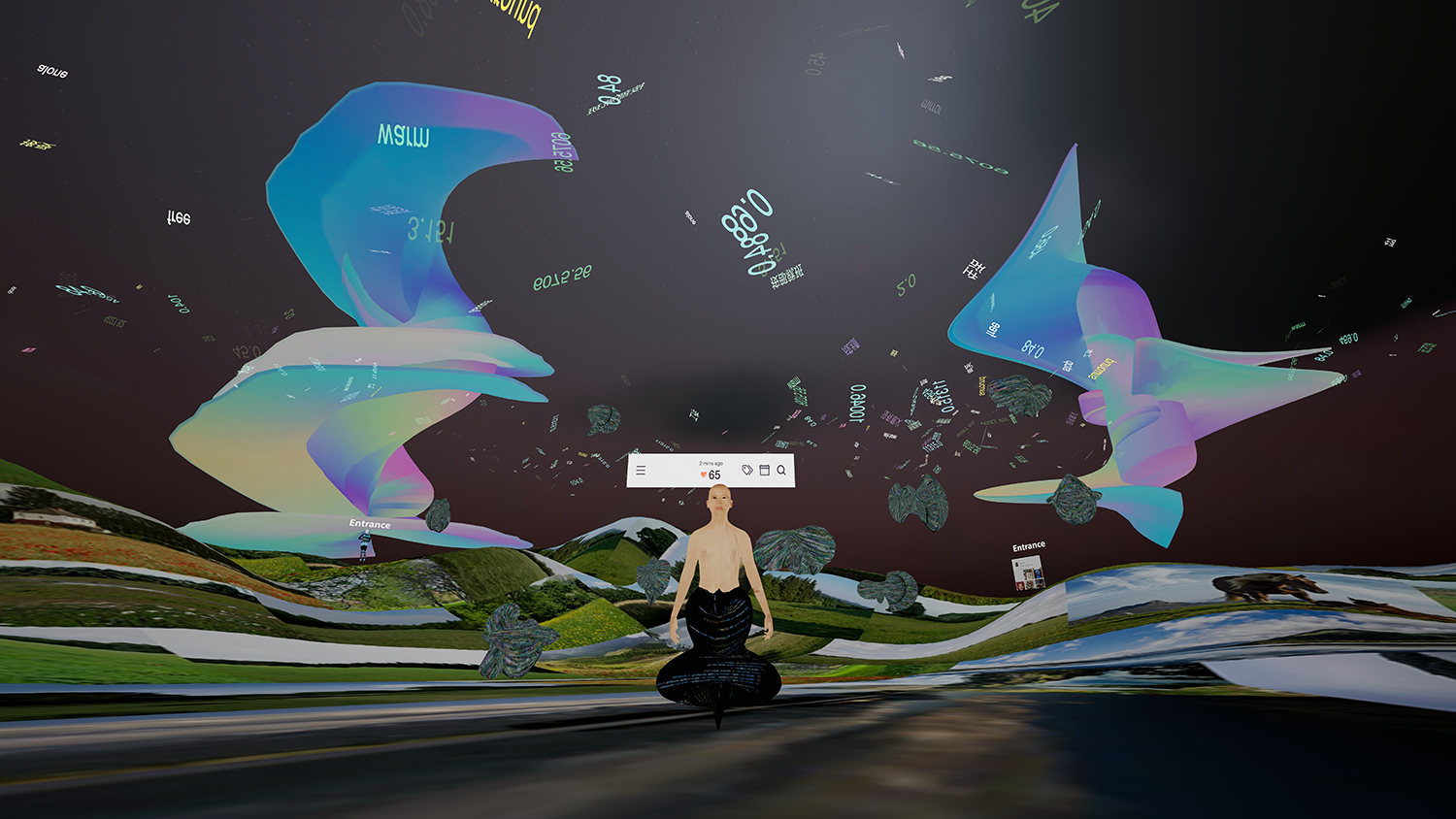 The work, Aliens of Me, is a self-exploration based on my personal data with Internet-based technologies, utilizing the web, video, virtual reality, and installation. I am using keywords from my memories shared online and figures of my health data captured by my smartwatch to reconstruct myself through virtual avatars, a story of my growth, and new bodies in which to hold these avatars and stories. This also reflects my identity as a newcomer from China, migrating to an open new world that blends analog and digital.