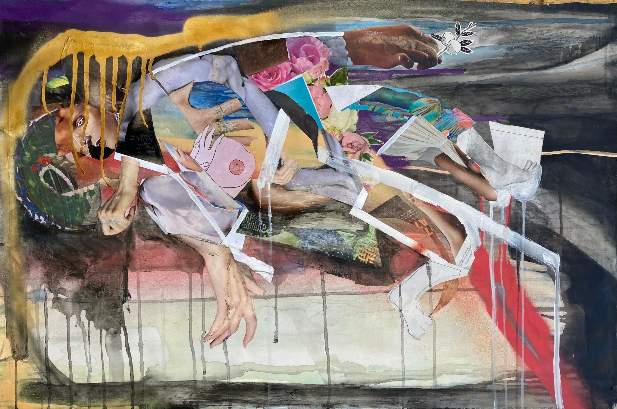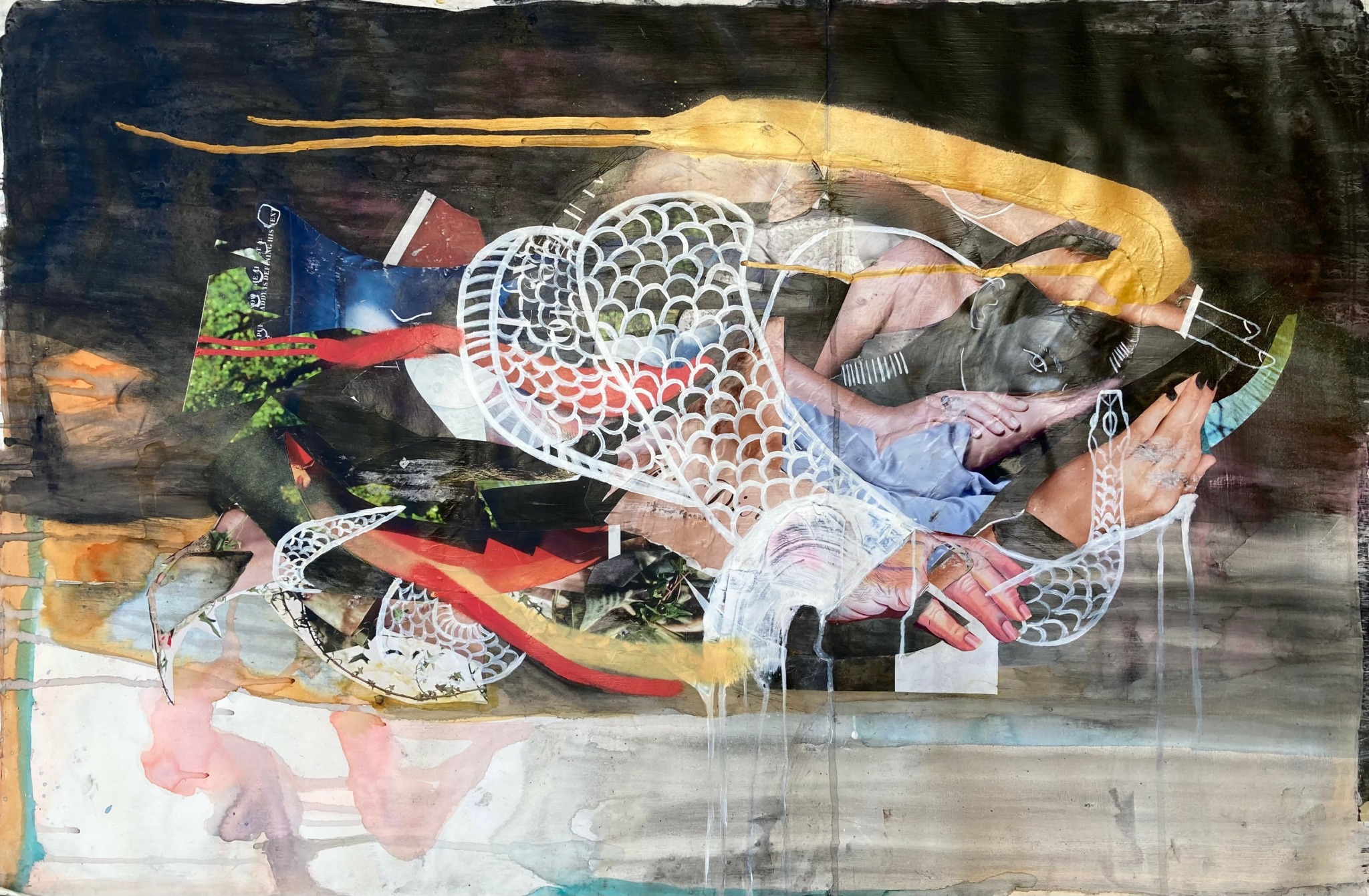 When I am making work about a particular time in history, say late 18th Century Colonial America, I have a specific idea in mind, there is a particular goal to get to. I then sketch out the composition, build it with collage and drawing, add & subtract until I get something I want to paint. I will also intentionally leave blank spaces in the composition so I have to solve it while I am painting. I like to have a plan when I work, but also have to leave space for improvisation. This often creates a lot of frustration when I am in the studio and I cant in the moment figure out how to fix the problem I have created for myself…but problem solving in the moment keeps me sharp.