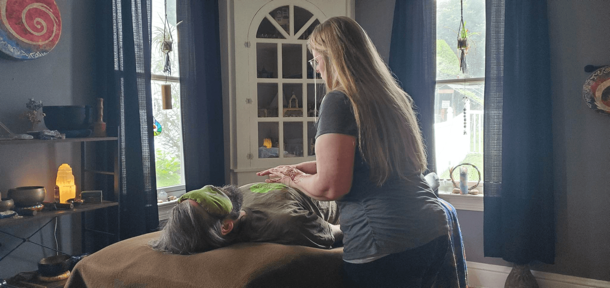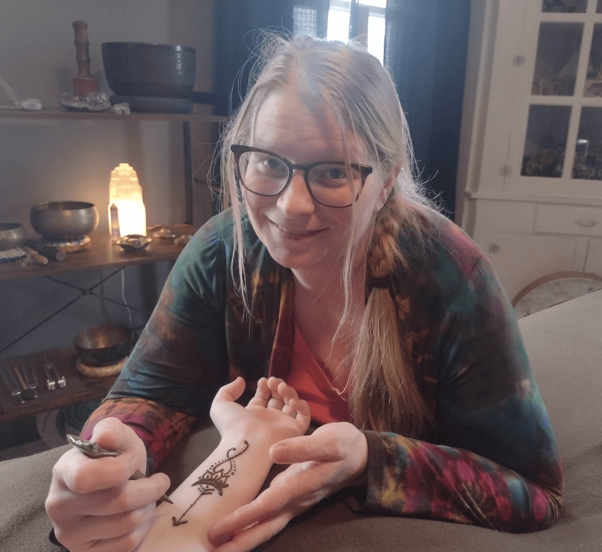 Not another single person does what I do, because what I do is a creative mix of things as unique as I am myself. I am a Reiki Master/Teacher, a sound healing practitioner, a certified reflexologist, a shamanic healer, a Mystic Priestess, a spiritual guide, an intuitive healer, a henna artist, a stained-glass artist, a painter, a yoga teacher, a tai chi instructor, a womans group facilitator, and, and, and… I have been told before that I am “A jack of all trades and a master of none.” This used to be something even I felt insecure of, though somewhere deep inside it is still what I wanted to do. Then I found out the missing part of that very quote that brought me down, “A jack of all trades and a master of none is better than being a master of one.” I am proud of the variety of things that I do, it allows me to have more options to offer people and blend things in creative and unique ways to meet each person where they are at.