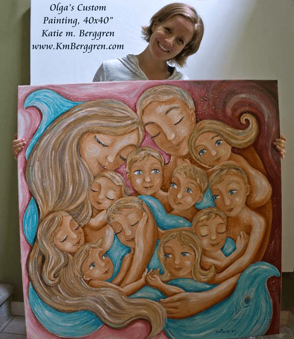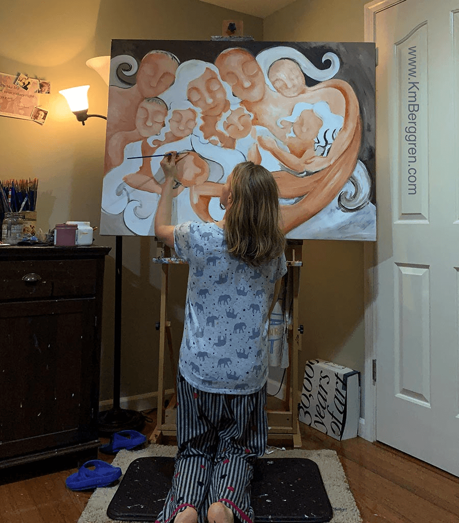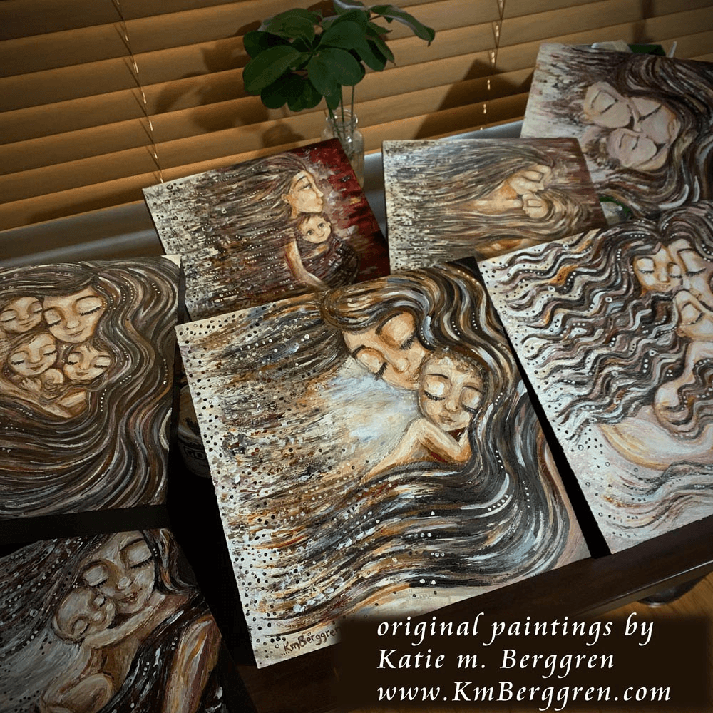How I got Started: Most artsy people, it seems, will tell you theyβve been creating for as long as they can remember, in some way shape or form. Iβve been drawing since I was 5 or 6. Through high school and college I dabbled with colored pencils, paint, digital art, pen and ink, alcohol-based markers, and pencil. My first business I started in High School, creating pencil portraits for families. My second business was as a logo and graphic designer, after college. Once I had my first baby I *KNEW* I was meant to capture motherhood β and once I put paint to his wall for a mural I *KNEW* I was meant to use paint on canvas. Thatβs how it all started ~ about 20 years ago!