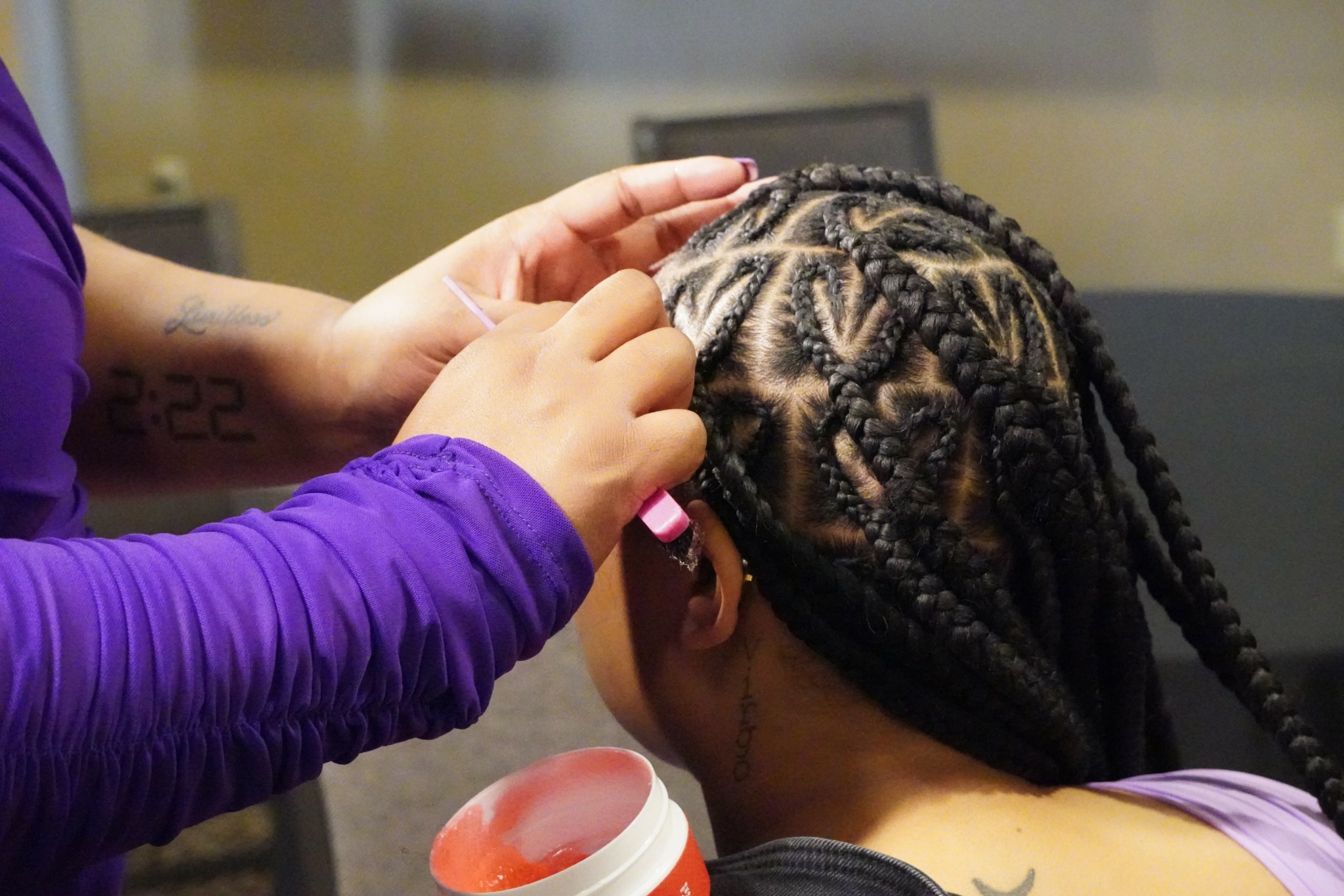 I am a licensed cosmetologist specializing in protective styles, and healthy hair. I love teaching others how to maintain a healthy routine that is suitable for their lifestyle. I love working with textured hair because that’s where I am most comfortable, however I have serviced all textures of hair. When I started doing hair, I only did braids and only considered myself a braider. After receiving my licenses, I have promoted myself to a stylist (someone who is capable of being versatile). I am well known for creating designs with my braids!! However, I have to give create to my cousin whose hair I have been doing since we were little because we literally come up with some of the dopest styles the day of his appointment.