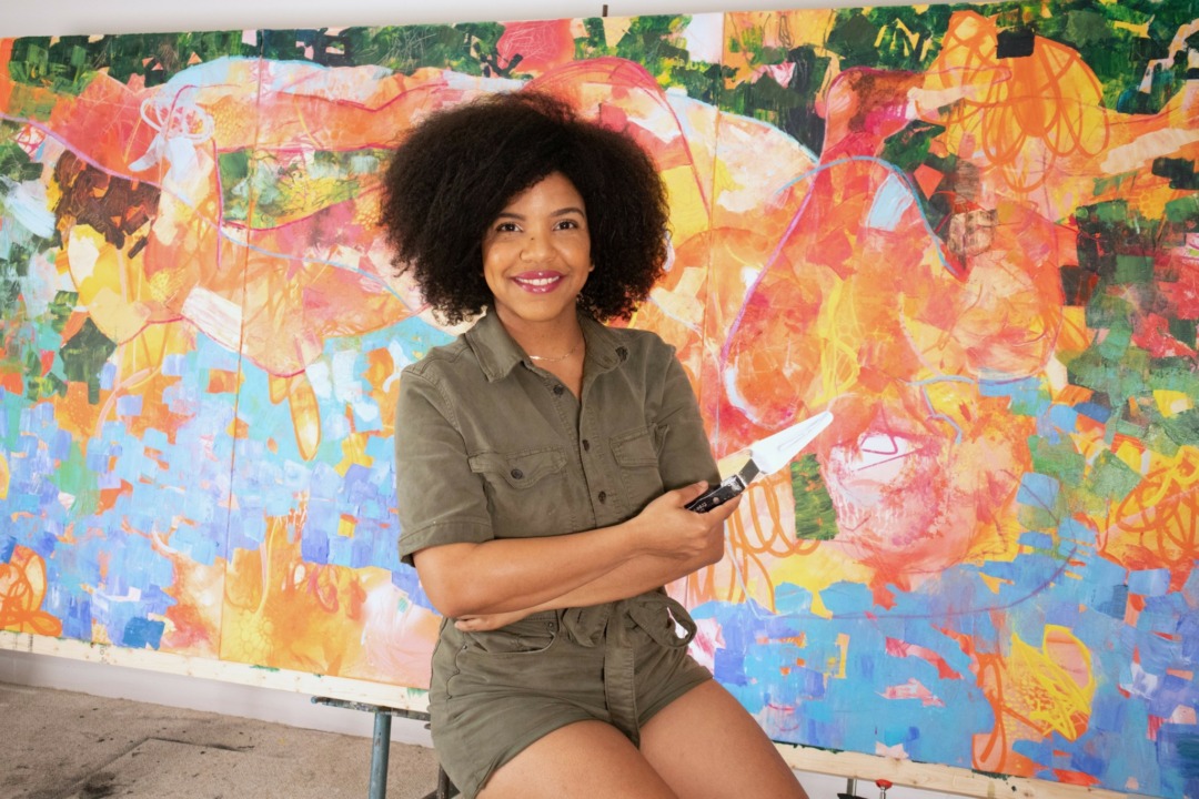 “The Uncatchable Ciguapa” materialized in 2024 after several years thinking about some of my childhood experiences—fantastical tales, memories of going barefoot to the backyard, and memories of being immersed in the sheets of laundry that were line drying by my grandma’s house . I wanted paintings that would hang just like the clothes on the line, so that I could walk through or around them. This thought turned into the idea of painting a forest. Separately, my hair, and my body were already such strong topics in my work and personal history, that all of these seemingly unrelated parts converged into La Ciguapa: I was going to paint her world, except people would walk around to see paintings all around them. Read more>>