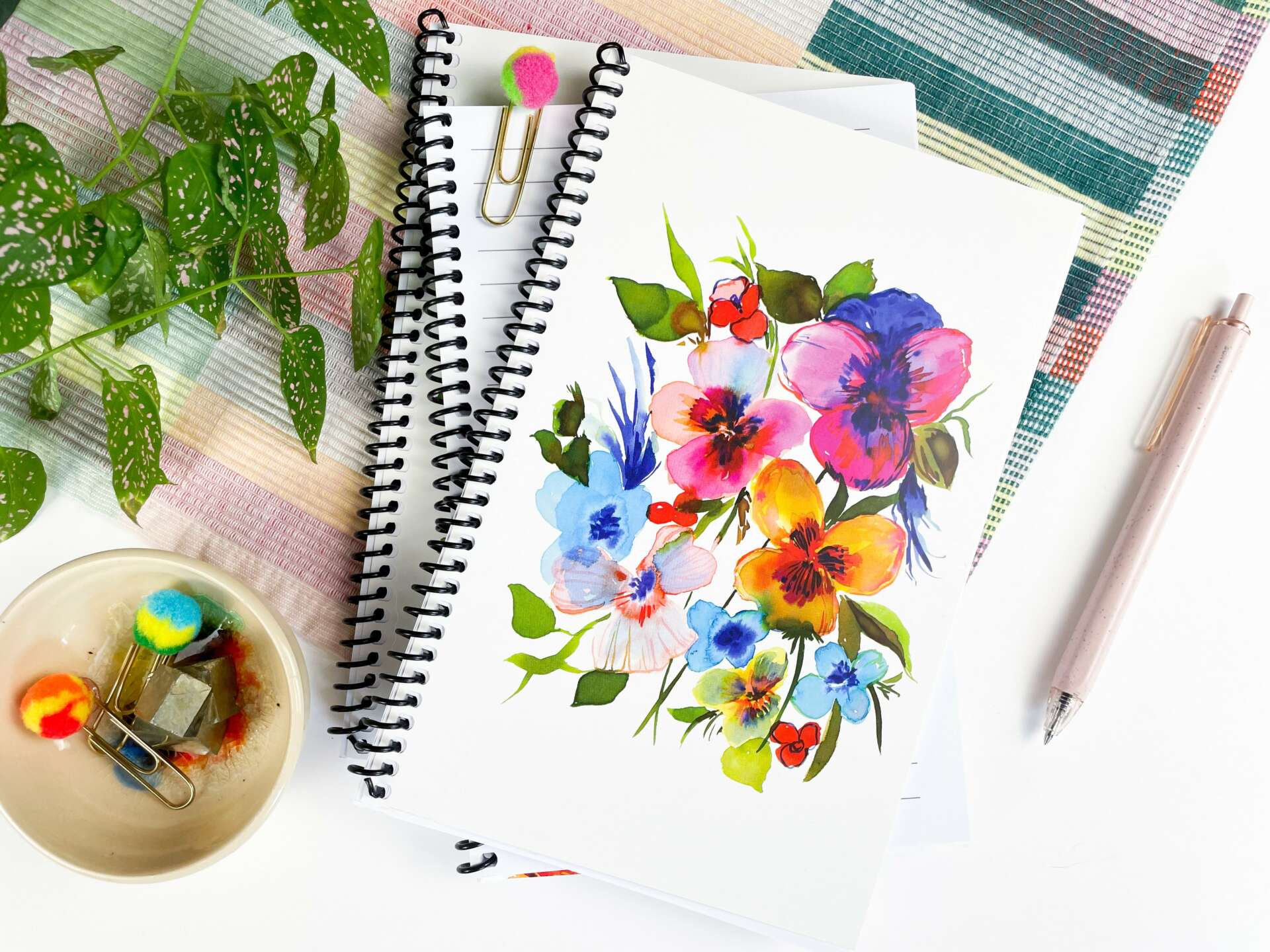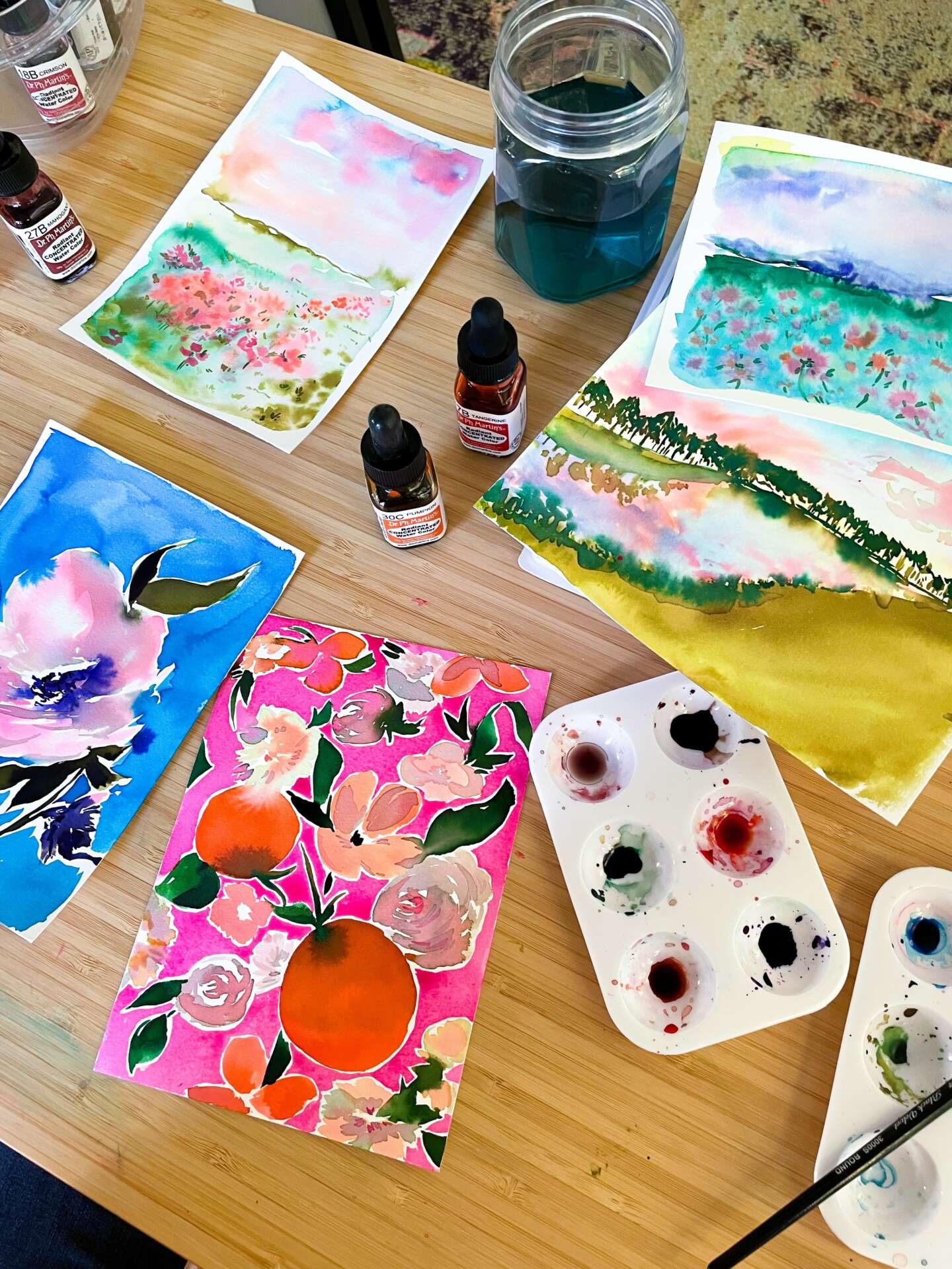 I arrived at this point in my career after 18 years of working as a textile designer, mostly in the Los Angeles apparel design industry. It took me over a decade before I began to see myself as a real artist (honestly I’m still working on this), and even longer before I developed my own consistent personal style. But after discovering the vivid magic of watercolor inks I really began to explore this medium and fell in love with the optimistic surrealism it added to my work.