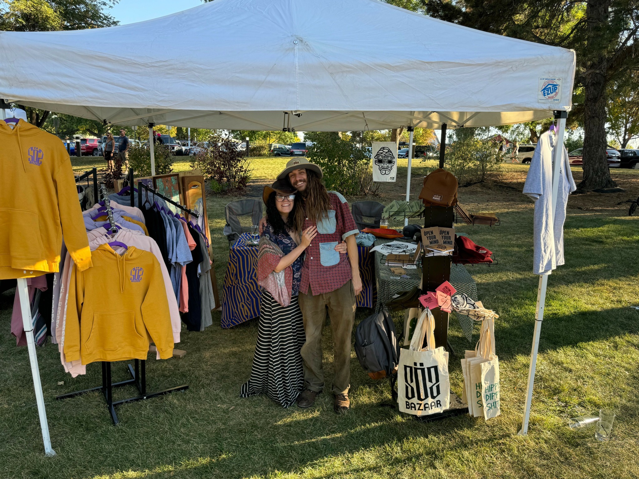During the pandemic, we took another risk, launching SÖZ Bazaar, our online market for handmade items, upcycled apparel, candles, artwork, wooden goods, and more. It felt like a natural extension of my art and a way to use our printing setup for packaging and branding everything ourselves. Recently, we started doing in-person pop-ups, collaborating with a brewery on a beer label I designed. We displayed art, set up a bazaar, and live-printed tees with the new design.