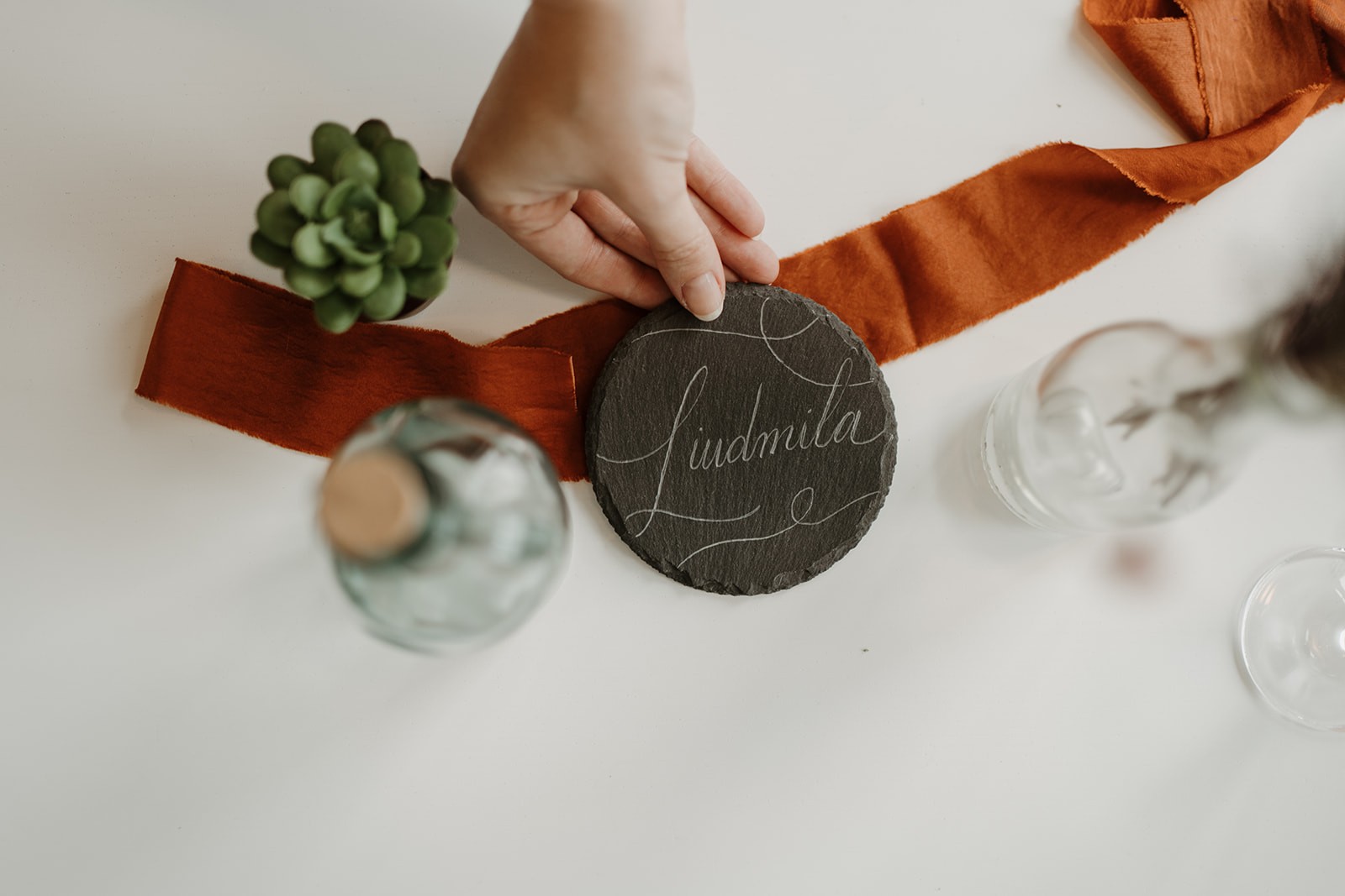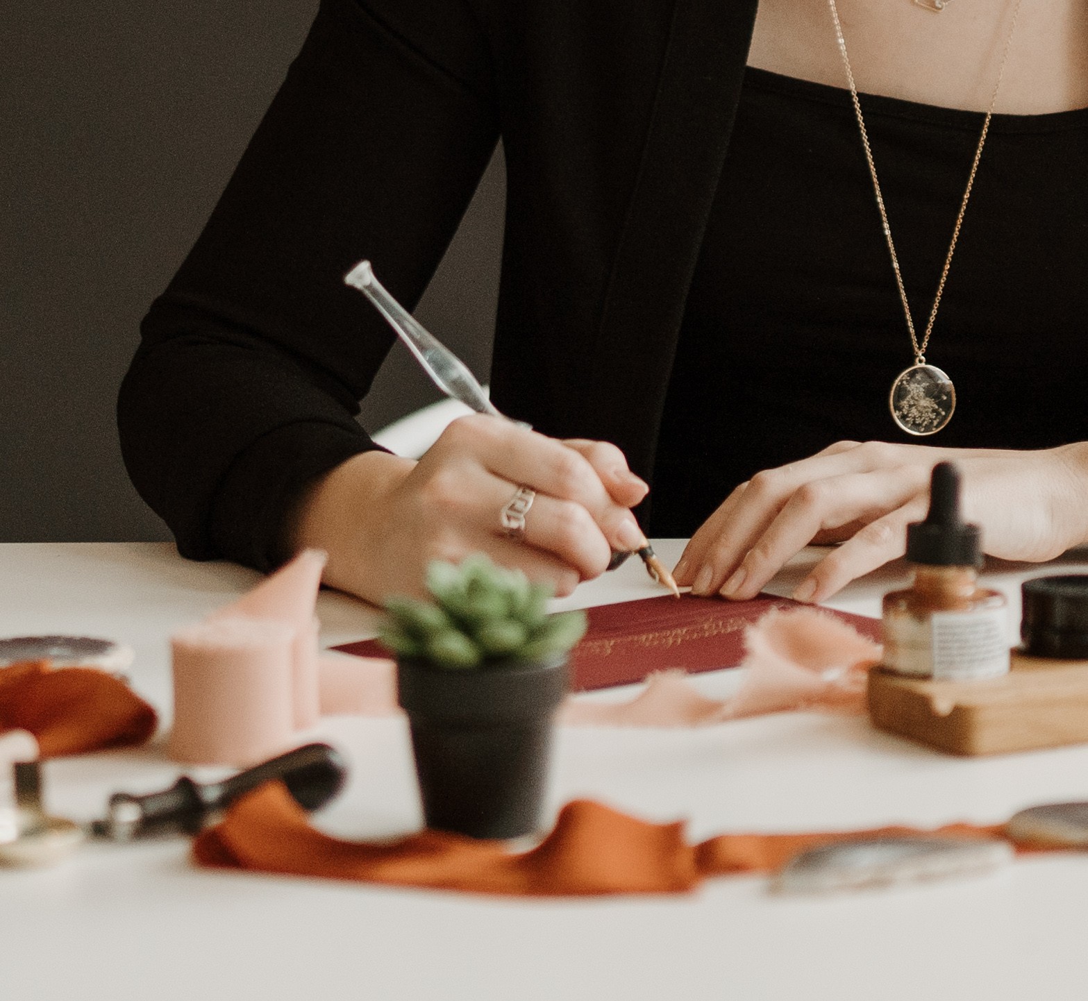 I initially specialized in modern brush style calligraphy, and over the years expanded my works to include pointed pen calligraphy, hand engraving, and watercolor portraits for wedding bouquets and house illustrations.