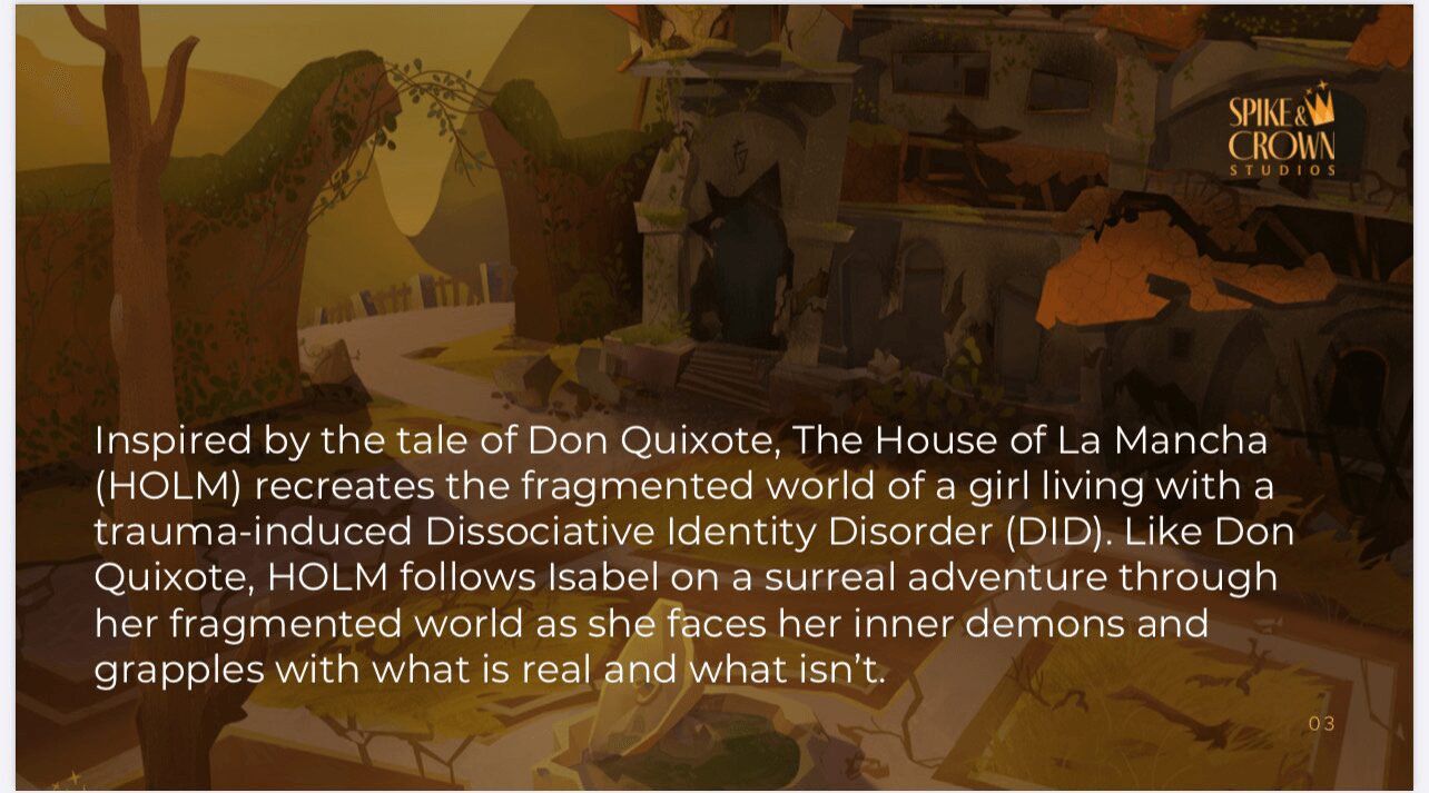 In the Spring of 2021, I co-founded Spike & Crown Studios with Director and Professor Frans Kusuma and Editor and Academy Award Nominee Edward Alva. Kim Estes also joined us as an executive producer. As the Chief Executive Officer at Spike & Crown Studios and co-writer of our first project, *House of La Mancha* (HOLM). (HOLM), is a 3D animated short that recreates the fragmented world of a girl, Lucinda, who suffers from trauma-induced dissociative identity disorder (DID). Unlike Marvel characters with similar profiles, she is neither insane nor a sociopath, and unlike those Disney has created, she is not a helpless, hopeless victim. This project stands apart from those the major studios have produced primarily because it gives voice to the one in four adults in the U.S. who experience mental illness. The storyline is both identifiable and encouraging. With PTSD, most of which begins in childhood, being the cause of 80% of mental illnesses and with twice as many women than men being diagnosed with PTSD and nine times more than men with DID, Lucinda’s story, her struggle, is more common than we perhaps care to admit.
