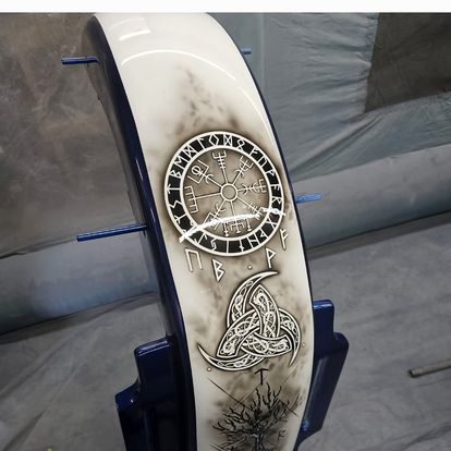 I have been an artist most of my life I was always drawing as a kid. As I got older I would put it down from time to time but always come back to art. Working in and auto parts store with a paint department I began learning the ins and outs of automotive paint. In my spart time I would go to a local slot cart track. As new cars would come out I noticed that they where only offered in 2 or 3 different liveries and I wanted mine to be different so I began using the airbrush to paint my cars differently. For graphics I primarily use water slide decals or basic masking. One day while waiting for paint to dry between coats I tried to “color” one of my drawing that was close by and it just felt right. Now I perform basic bike paint services as well working closely with the clients to create a full one off custom work of art that not only turn heads but will be an expressing of them selves. When not working on bikes I still make time for my fantasy art passion that has been with me my entire life by painting dragon. As well as doing the occasional pet portrait to keep the bills paid. I have had the honor of having my work showcased in many publications and won numerous contests but the achievement I am the most proud of is the step-by- step articles I have created and have been published in industry magazines. It is a great feeling to know I have been part of something that is helping others follow a path that could bring them the same joys I have found.