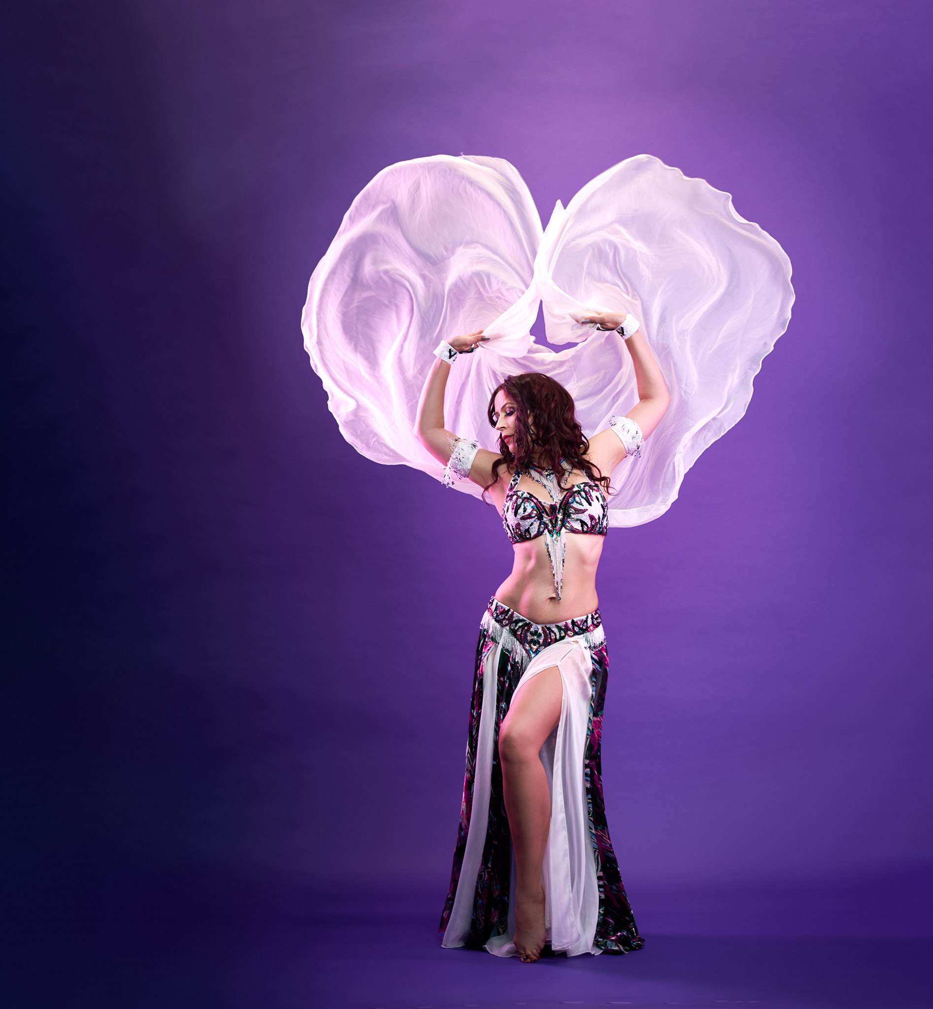 Later on, after auditioning and becoming a Dancer for several of Jillinas BellyDance Evolution theatrical productions, I developed a love for theatrical Belly Dance style and props. My current addiction is working and dancing with veil poi and glow poi.
