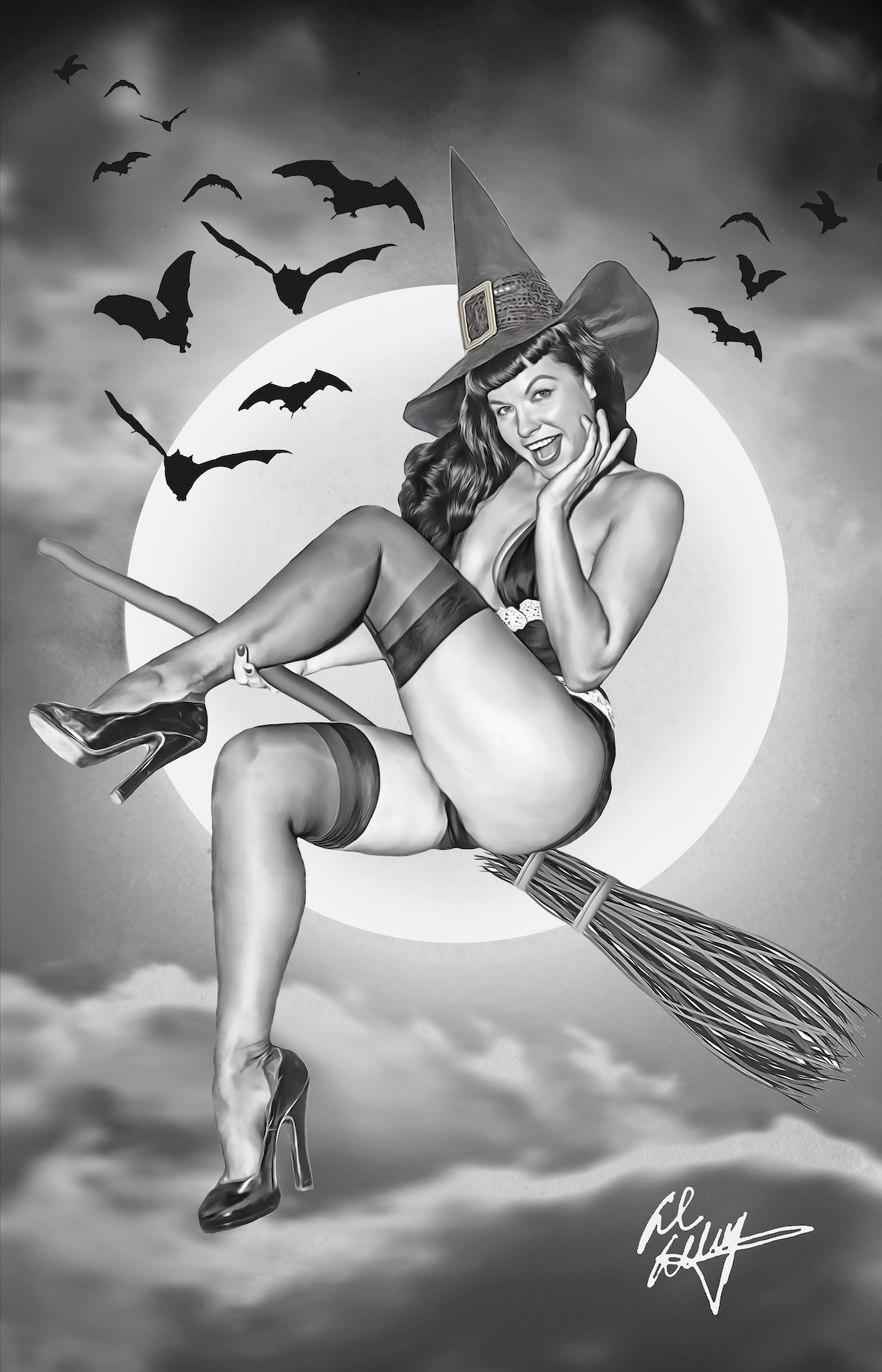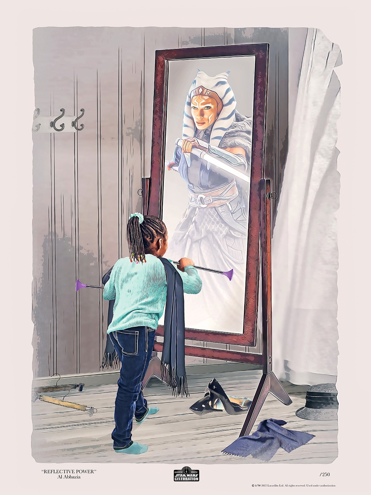 I have always been drawn to (no pun intended) retro styled artwork. I currently do official lithographs for Star Wars/Lucasfilm with Acme Archives. I have also done official work for Bettie Page, going back to my pin up roots. My other work includes promotional art for movies and merchandise for Disney, Warner Bros., DC Comics, Universal and Coca-Cola, as well as more pin up work for various signs and calendars internationally. I was flattered to be one of the artists picked this year for the Star Wars Celebration Art Show in California. My piece that was chosen was from an idea my daughter had years ago. It was an image of a little girl looking in the mirror and imagining herself as Wonder Woman. Since then, I updated it and it was shown live on DC FanDome by Wonder Woman director Patty Jenkins and the cast of Wonder Woman 1984, including Gal Gadot, Chris Pine, Pedro Pascal and Kristen Wiig. I took my original concept and wanted to create a Star Wars piece around it. In “Reflective Power”, a little girl is playing in her mother’s room and imagining herself to be her favorite character, Ahsoka Tano. The message of my piece was very well recieved and I even got to hear a nice voice message from Rosario Dawson, who plays Ahsoka. I am planning a follow up piece to submit for the next Star Wars Celebration in London next year.