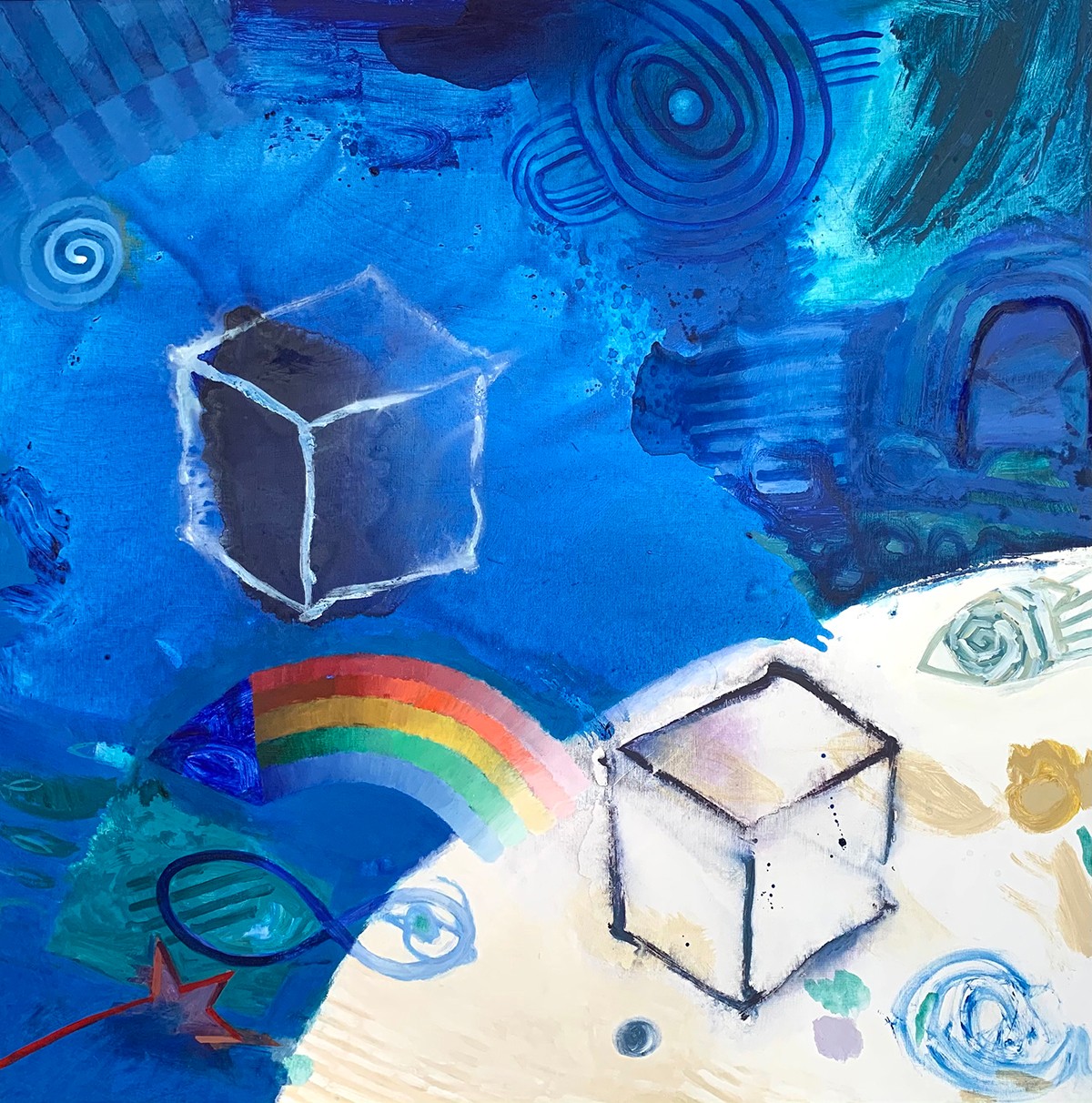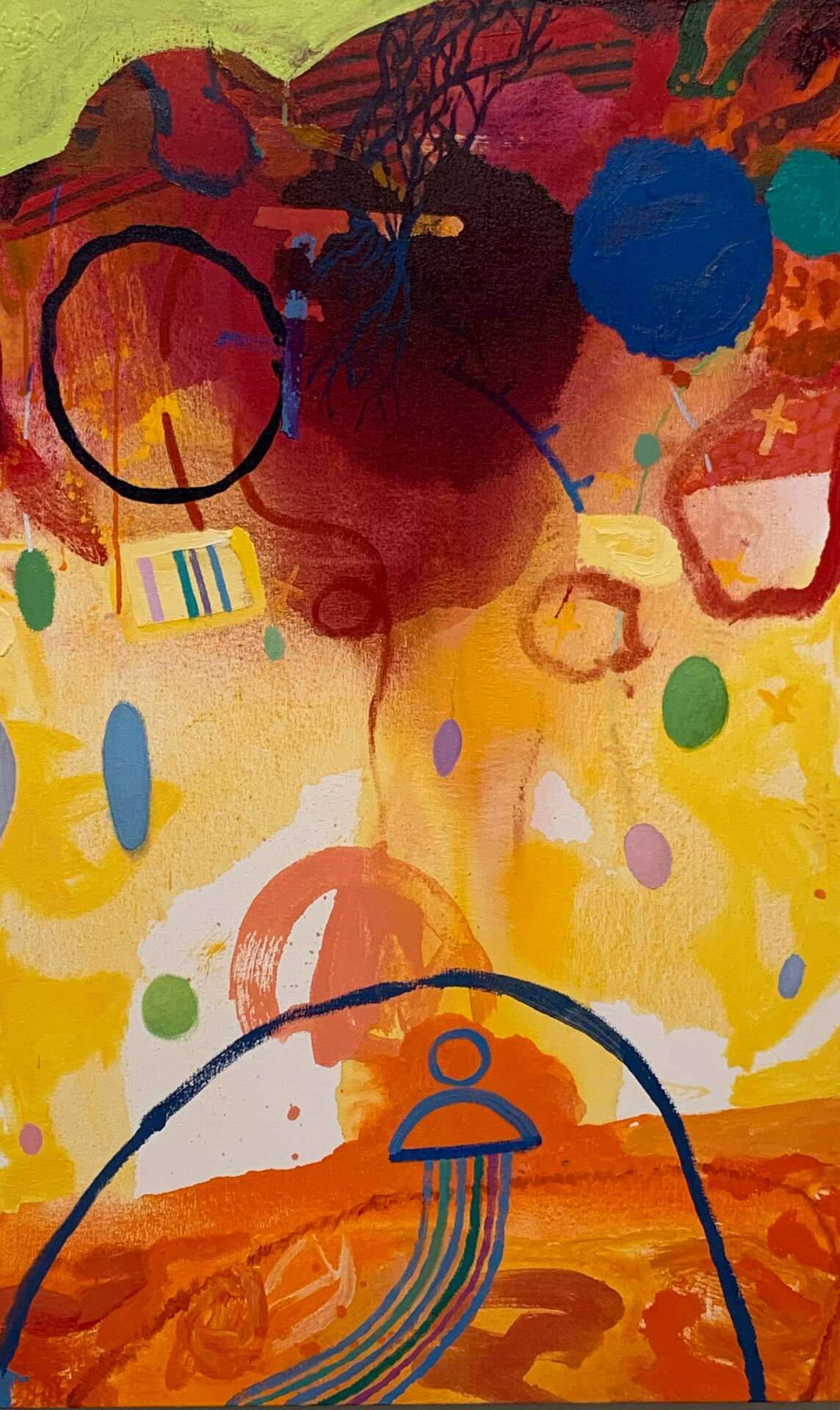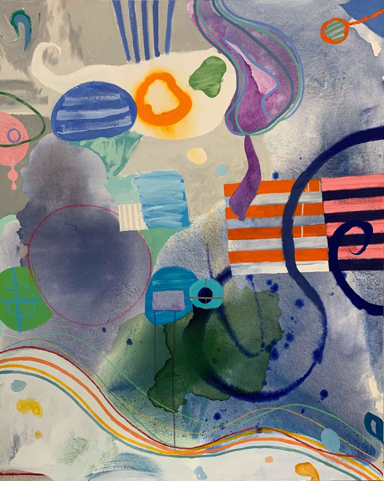 Early in my career I worked in oil paint and the imagery was geared to representational work. Surviving financially in the early days in Paris found me painting apartments, often using what are now considered to be quite toxic solvents. It was the prolonged contact I had with these solvents that rendered me ill and eventually made my ability to use oil paint impossible. At that time, a close friend and mentor, Lee Chesney, in leaving his residency at the Cité, offered me his acrylic paints so I could continue my work. The thing that fundamentally changed my approach to painting came from realizing that acrylics could easily accomplish what is much harder to do in oils, such as producing washes and transparencies. Facing blank canvas, I immediately worked these techniques into my initial actions and that practice has since become a staple in originating imagery in all newer work. Over time, my compositions have also become more specific in nature. While subject matter remains non-objective, it is delivered with a higher level of detail and specificity. And, I would be remiss if I didn’t mention my use of color. I have always responded to color and found that intense color contrasts activate the canvas in ways that are transcendent.