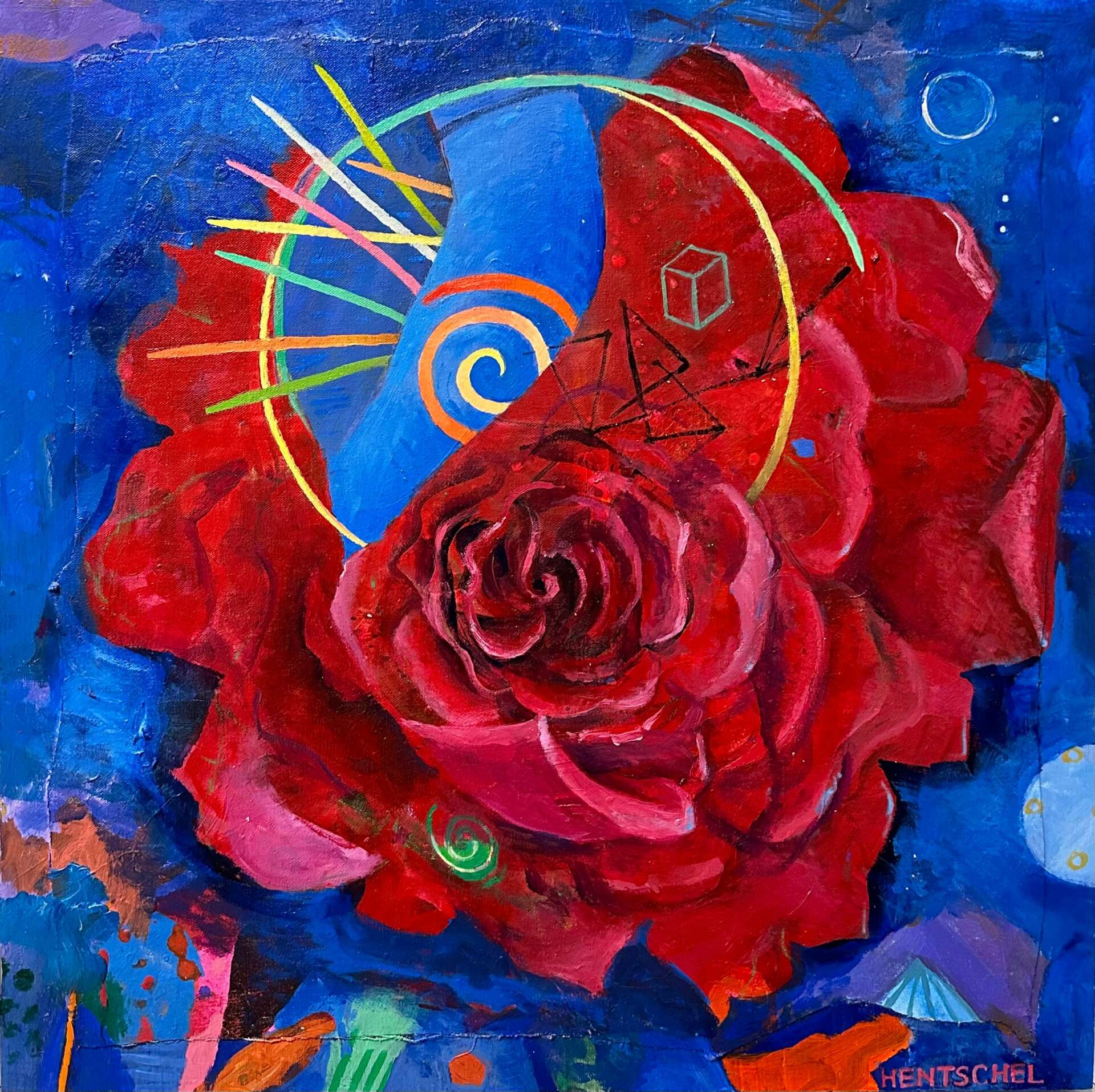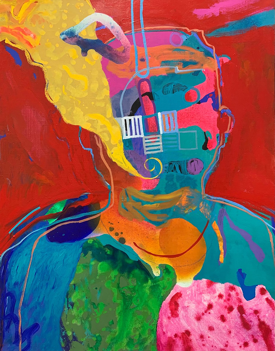 Early in my career I worked in oil paint and the imagery was geared to representational work. Surviving financially in the early days in Paris found me painting apartments, often using what are now considered to be quite toxic solvents. It was the prolonged contact I had with these solvents that rendered me ill and eventually made my ability to use oil paint impossible. At that time, a close friend and mentor, Lee Chesney, in leaving his residency at the Cité, offered me his acrylic paints so I could continue my work. The thing that fundamentally changed my approach to painting came from realizing that acrylics could easily accomplish what is much harder to do in oils, such as producing washes and transparencies. Facing blank canvas, I immediately worked these techniques into my initial actions and that practice has since become a staple in originating imagery in all newer work. Over time, my compositions have also become more specific in nature. While subject matter remains non-objective, it is delivered with a higher level of detail and specificity. And, I would be remiss if I didn’t mention my use of color. I have always responded to color and found that intense color contrasts activate the canvas in ways that are transcendent.