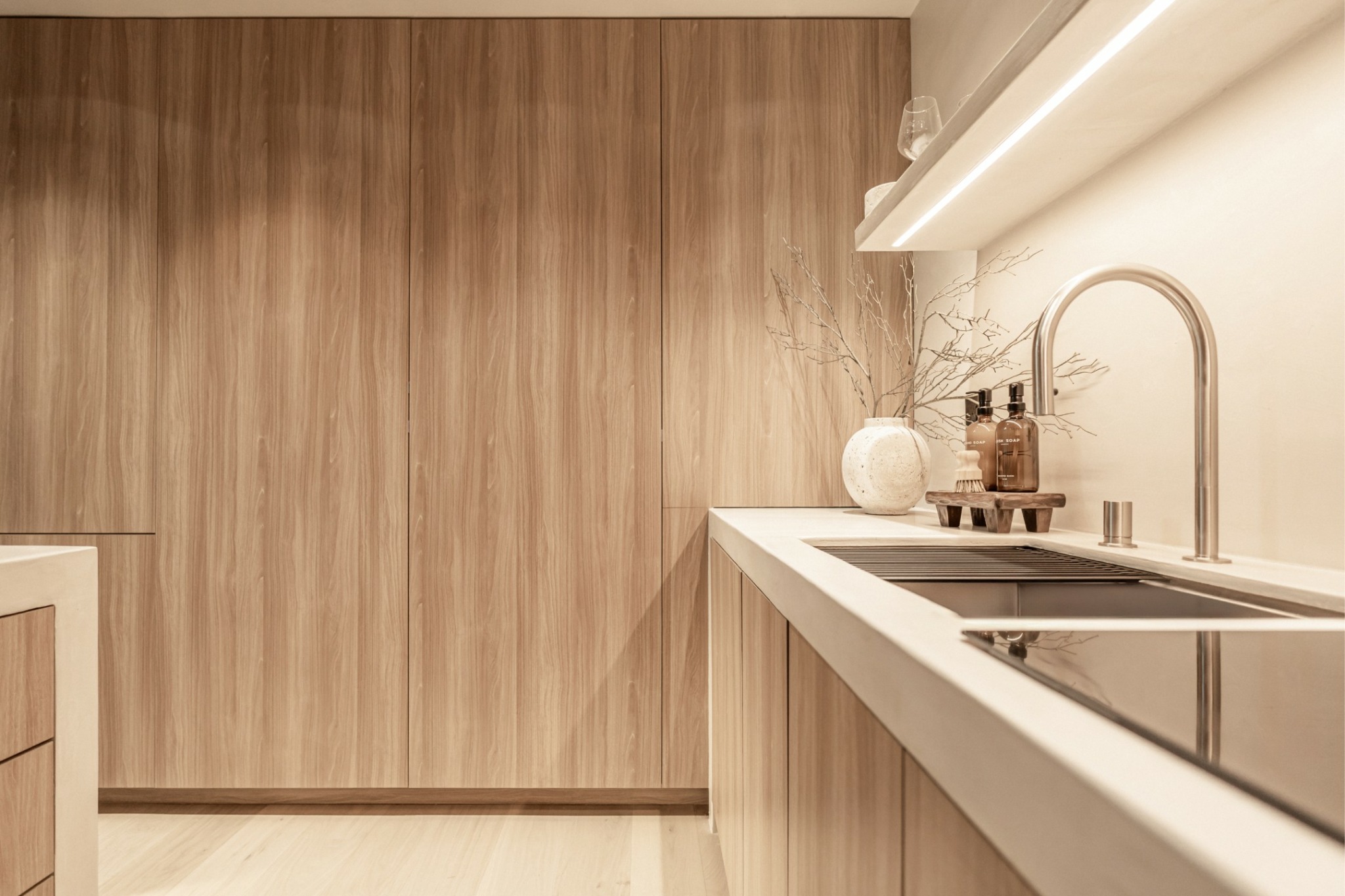 We didn’t want a standard kitchen, so we opted for custom floor-to-ceiling cabinetry that adds warmth and maximizes storage in our tiny home. We also layered lighting throughout the space to enhance the ambiance and highlight the beauty of natural materials. One of our most unique features is a hand-chiseled stone sink from Turkey, adding a touch of craftsmanship and character.