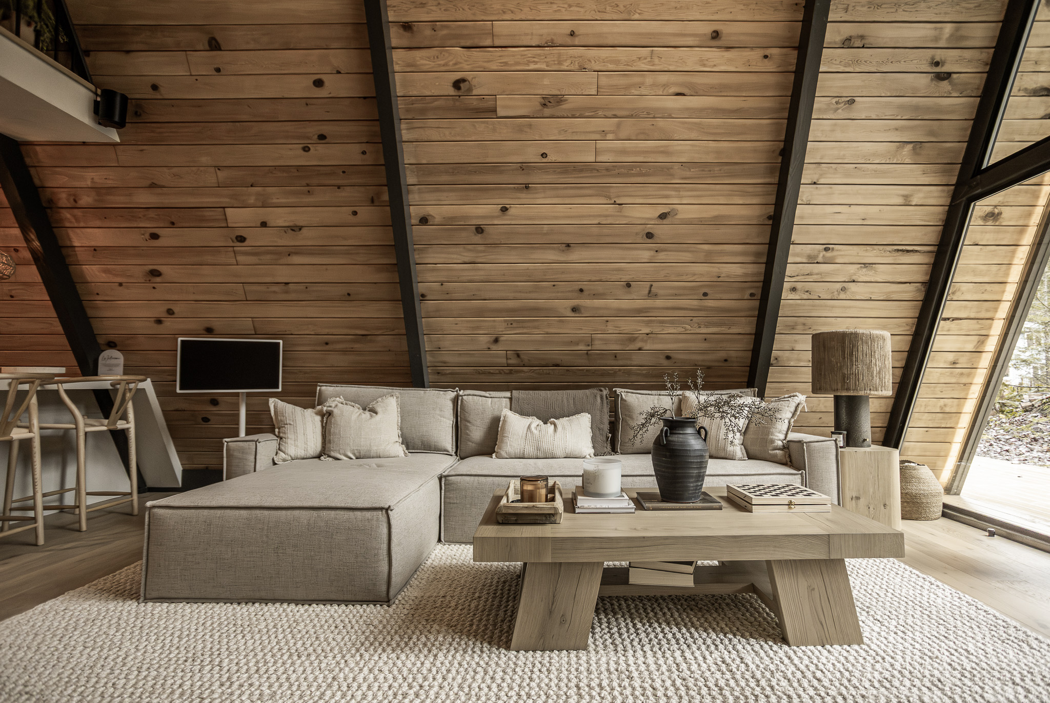We bought the A-frame in 2024, spent a year making it our own, and launched it in 2025. We’re both perfectionists when it comes to our vision, so for us, this wasn’t just about creating a space—it was about crafting a design project that reflected our passion for beauty. My husband, with his tech design background, and I, were both obsessed with making this cabin something truly special. Our philosophy is simple: you feel as good as the space you’re in. The more beautiful and nature-inspired it is, the easier it is to unwind and clear your mind.