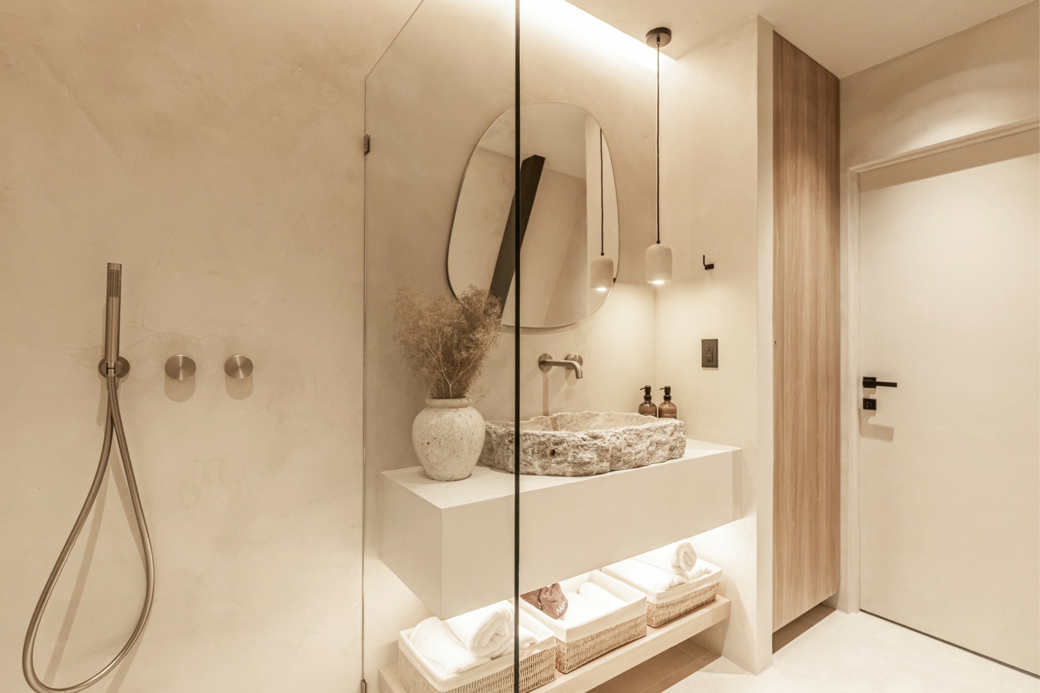 While most cabins in the area embrace a “cabin feel” or “modern” aesthetic, we wanted to create something unique—something we hadn’t seen in Washington. Inspired by the Japanese concept of wabi-sabi, which celebrates natural imperfection, we designed a space that’s both grounded in nature and elevated. We were captivated by natural stones, so instead of typical tile, we worked with one of the few companies in Washington that creates a seamless microcement look for the bathroom and kitchen—despite the higher cost.