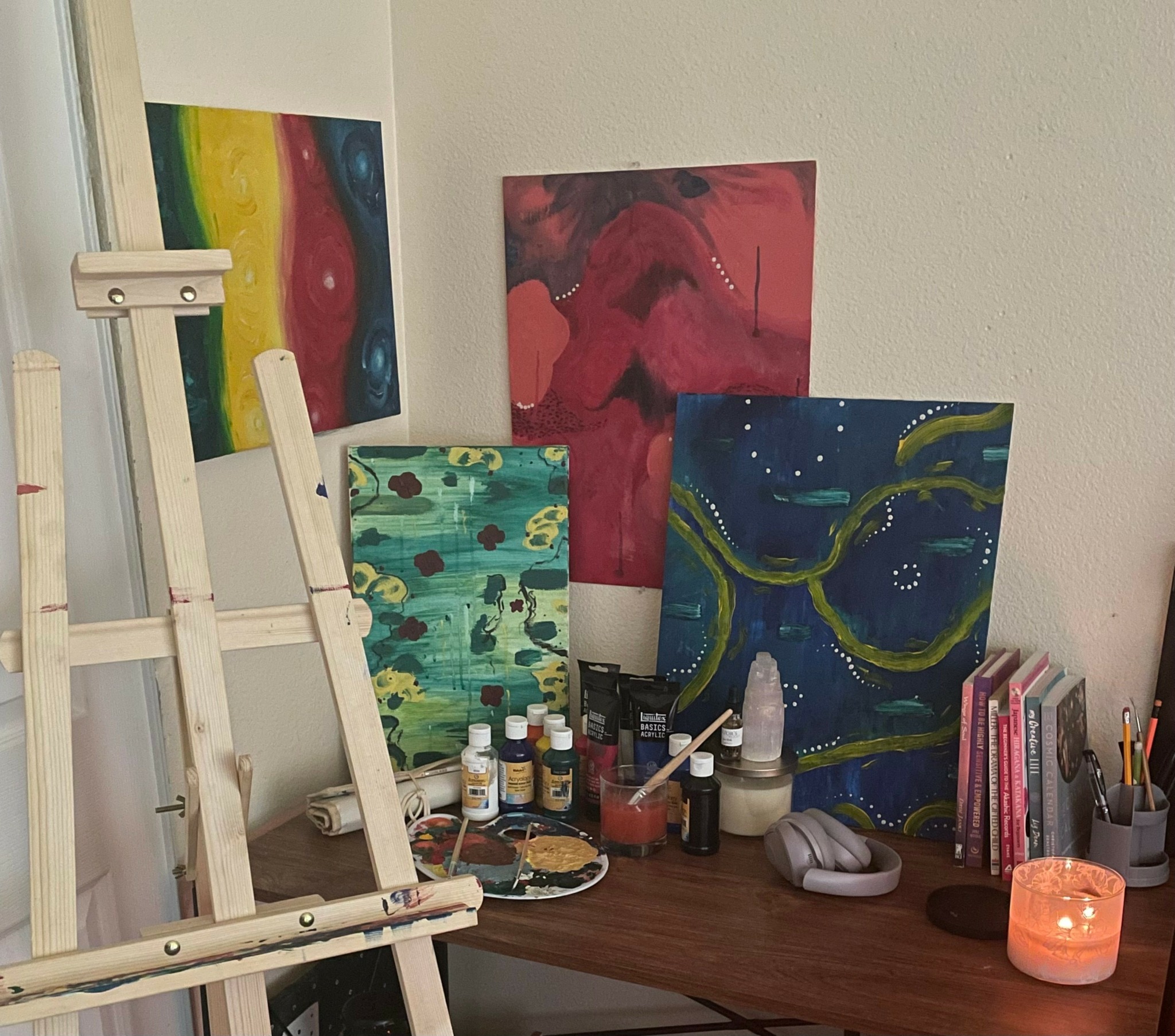 Everything I know has been self-taught through curiosity, trial and error, and the encouragement of my art teachers over the years. I specialize in acrylic paintings, with a focus on emotional, abstract works that are deeply personal and uniquely one-of-a-kind. My art lives mostly on canvas, but I have dreams of exploring oil painting, gouache, pottery, and even graphic design in the future. There’s a whole universe of creativity I want to explore, and DreamHaze is only the beginning of that journey.