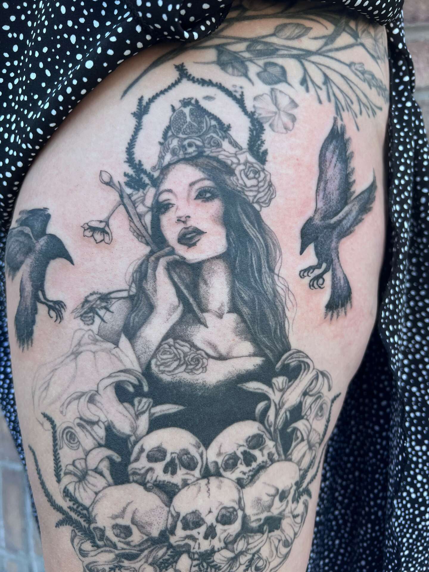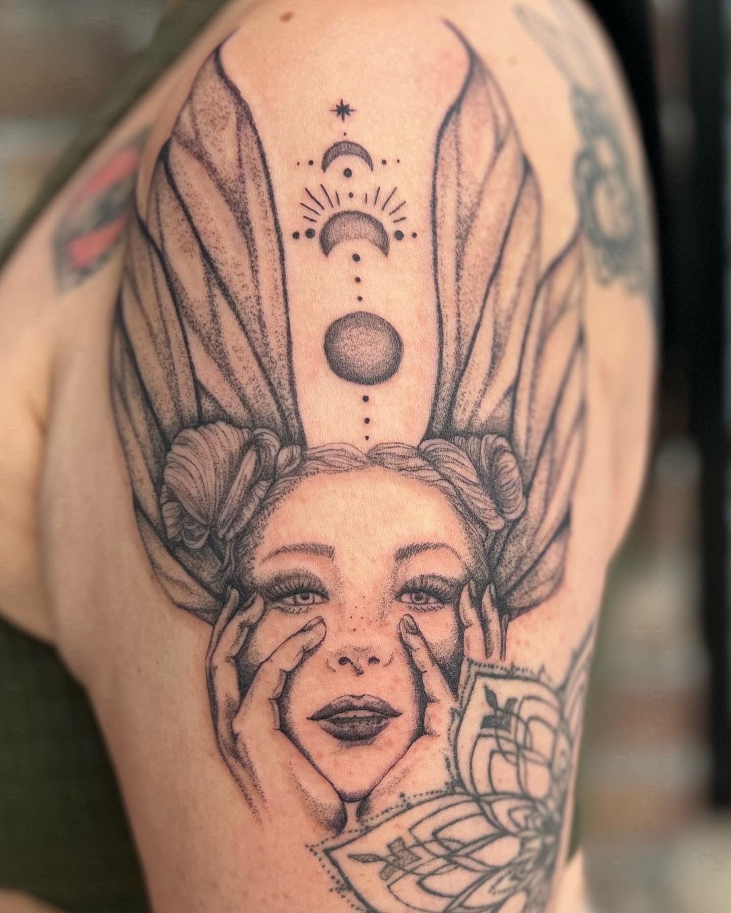 I am a tattoo artist and visual artist. For as long as I have memory, I have loved art and have had an overwhelming desire to create art. One of my earliest memories is of a drawing of a wolf that my mom was working on, I was spellbound and for years tried to capture the detail and emotion she was able to in that drawing. I this piece is very important to me and hangs in my bedroom to this day. Naturally, I wanted to get into some sort of creative line of work. When I was coming of age in the 90’s tattoos were suddenly on my radar. I remember a day in freshman year of high school circa 1994, discussing with my girlfriends what tattoos we would get as soon as we were old enough. Then a friend suggested i design them since I was an artist, then another excitedly popped up with “you should do our tattoos!” and it was a magic moment that defined so much of my artistic life from there. I began studying tattoo magazines and drawing what I saw in every style trying to understand what was different translating from skin to canvas. I started visiting tattoo shops as soon as I was of legal age and asked how to get started tattooing. I ended up working as the receptionist in a local shop in my early 20’s and although I was not an apprentice, the artists and owner were supportive of my dream and gave me lots of advice, it really felt like apprenticeship was on the horizon. Then I had a panic attack, which was unfortunately common at the time, and I left because I was scared. At the time I didn’t realize I was afraid of success, I learned that in hindsight. I lost my spark for a while, and in my 30’s a friend asked if I had ever considered tattooing since I loved it so much. I was convinced I was too old, and was corrected quickly by more friends. At this time, I was a single mom and was working as a hairstylist in Portland, Oregon. Oregon is one state that requires school rather than apprenticeship and when I looked into it, I realized that there was actually a way to make my old dream a reality. The time felt right and I went for it in January of 2019, and am so proud of myself for not giving up. I feel that my brand is a blend of beauty and darkness. I am drawn to the macabre and balance of beauty and grotesque in nature. I try to bring this to my designs and execution of my work. My style in the industry is called illustrative, which definitely fits. I also add elements of realism, surrealism and fine line work. I do both black and grey band color work and love to do both. I always aim to listen deeply to what my client wants when I am designing a custom piece, and I enjoy adding ideas and brainstorming with all my clients. I want my clients to feel safe, comfortable and wholly accepted as they are.