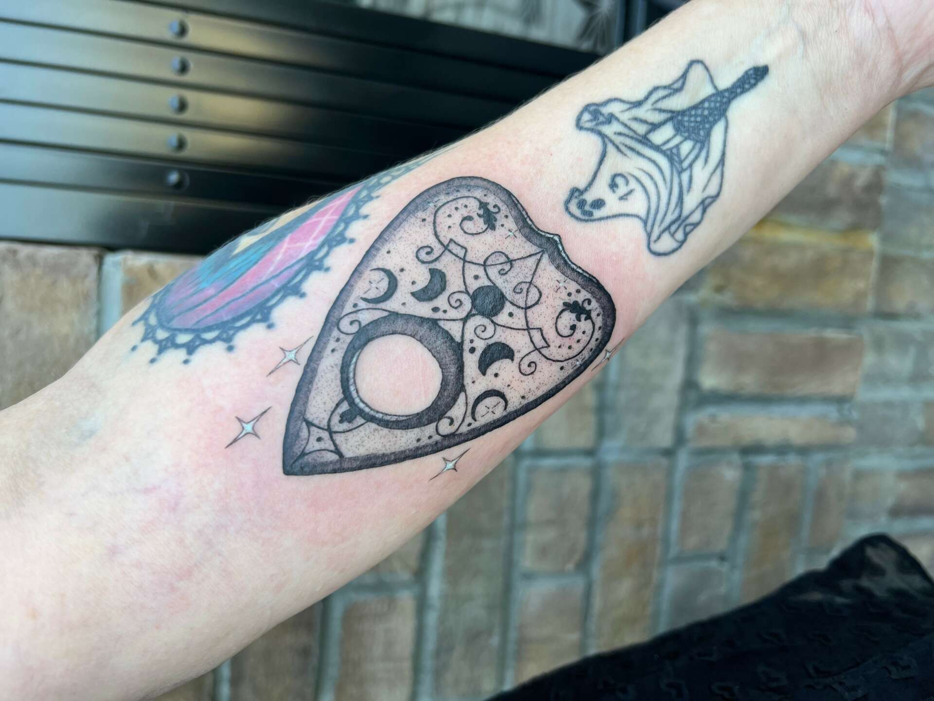 As an artist, I love to infuse meaning into my projects to give extra texture and connectivity to the viewer. I believe that even when the meaning is not obviously spelled out, you can feel it there. Meaning enhances the emotion that we connect to within a piece of any style of art. When I design a tattoo I approach it the same way whenever the client allows for my input. Recently, I designed a cover up tattoo for a new client and was thrilled to be so in sync with her when we began discussing the piece and cover up possibilities. Our conversation veered into mental health and reclaiming oneself through a tattoo cover up to replace something that no longer represents who we are today. This client is a horror fan and mentioned a movie I had not heard of, so I looked it up. I was struck by the imagery, and more so by the meaning associated with the film. If your curious, the movie is The Babadook by Jennifer Kent, definitely worth looking up. After learning the association with mental health and the film, a little about my clients likes and dislikes and also that she is a self proclaimed cat lady, I had a vision for the piece. I designed a black cat with the Babadook in her mouth. The black cat symbolizes reclaiming your personal magic and healing, so pairing all this together tells quite a story. She loved the design and we have completed the first session.