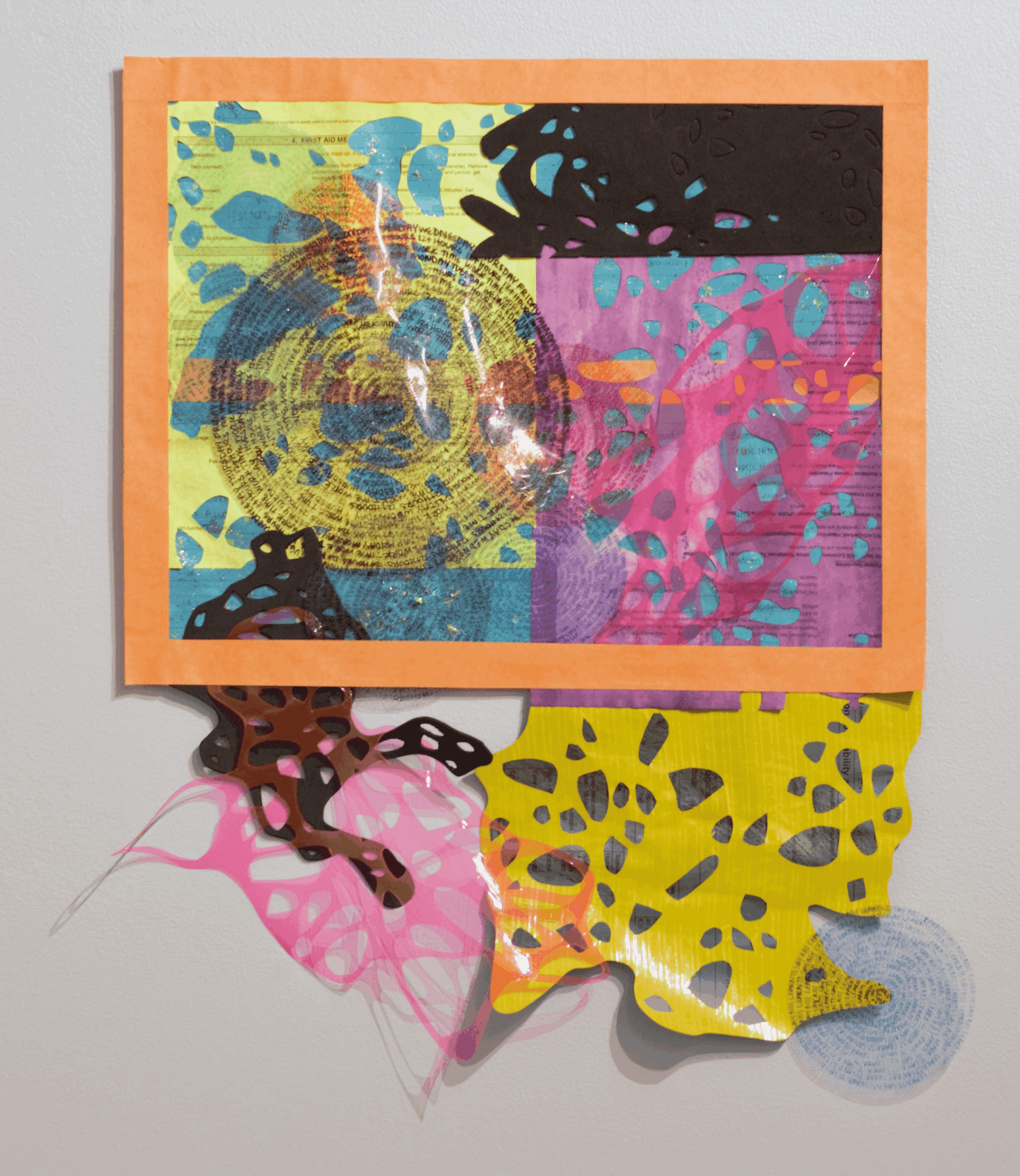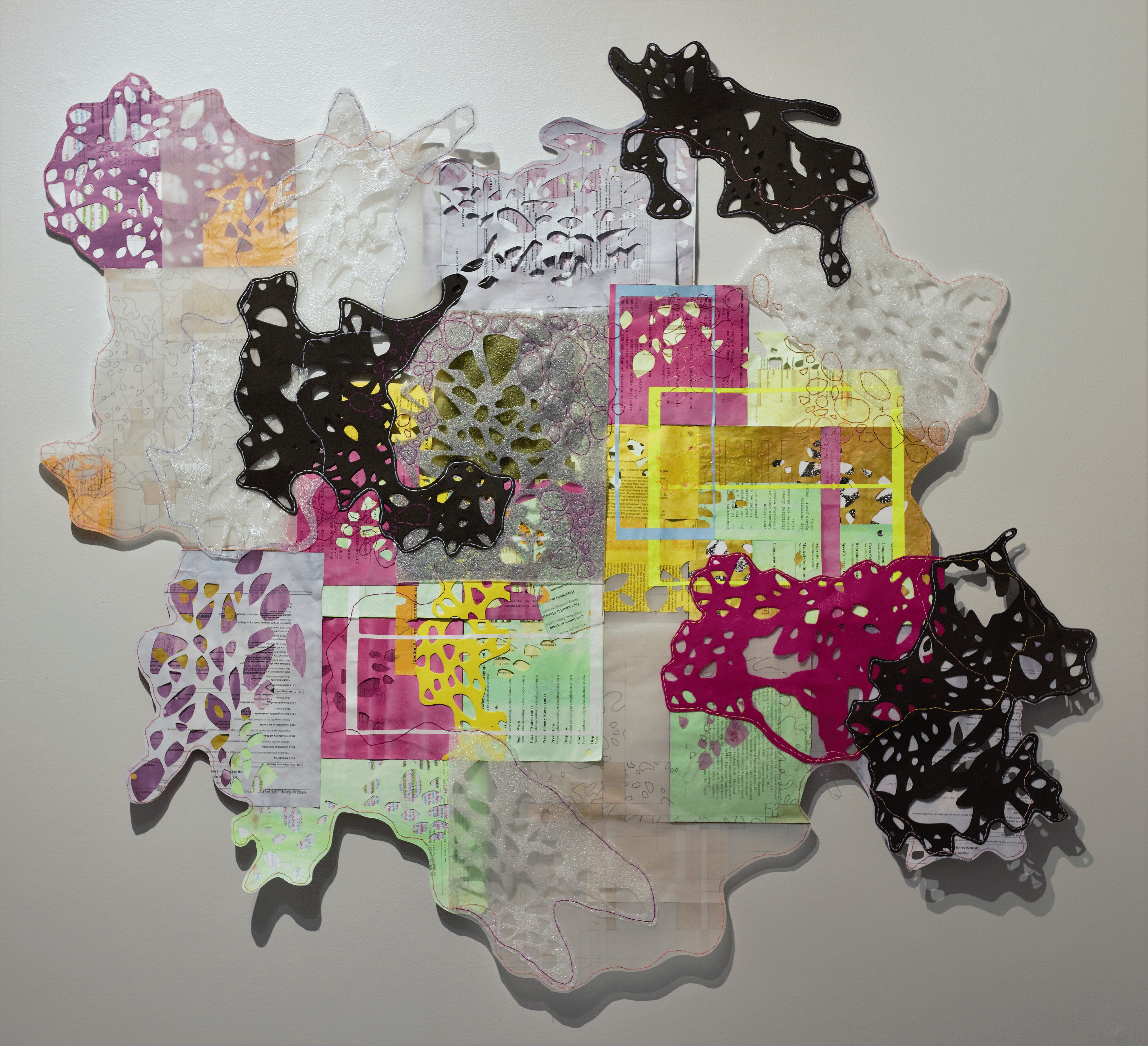 For my current materials, I’m using the things around me, often scraps or discarded notes and personal papers that I would typically throw away; by dying these materials or cutting my patterns into them, only tidbits of text and information remain. My pieces have become an emotional outlet for the stresses of daily life; sometimes the text from the notes is slightly visible while other times it is through my color choice that I’m trying to evoke a certain feeling or emotion. My titles typically provide a clue to the meaning or a personal connection to the work that hopefully the viewer can connect to.