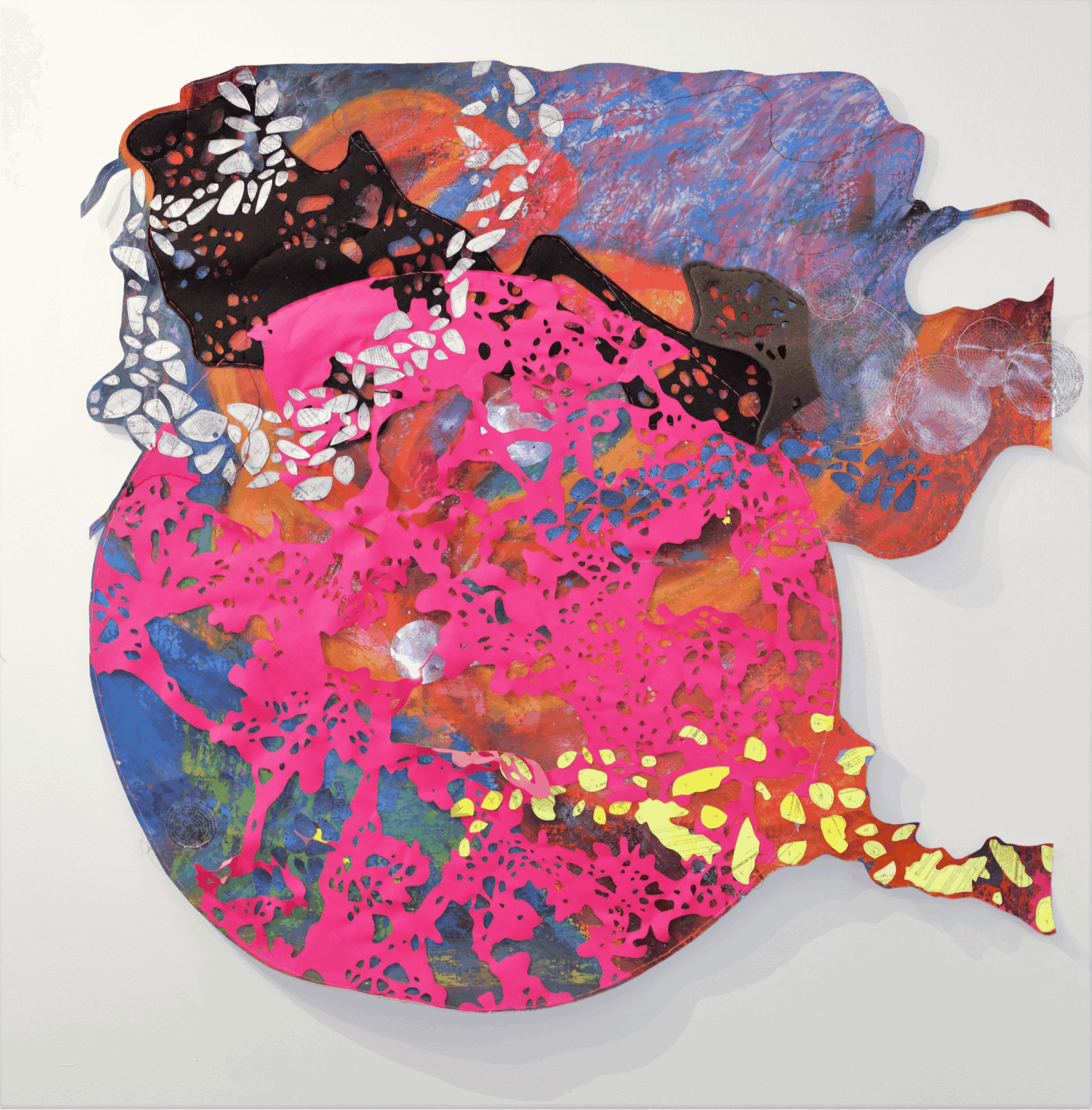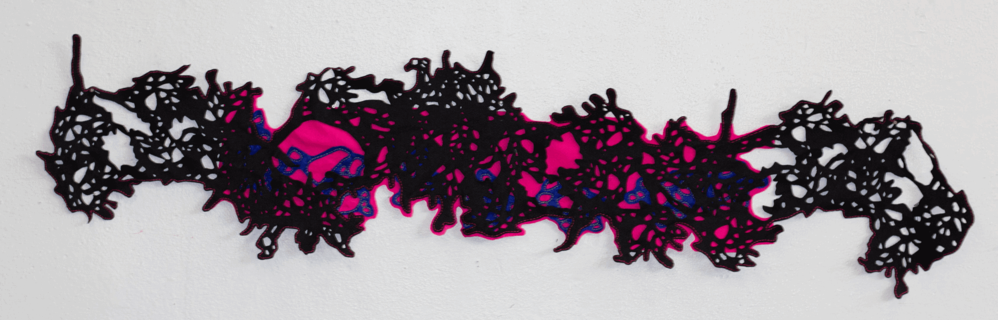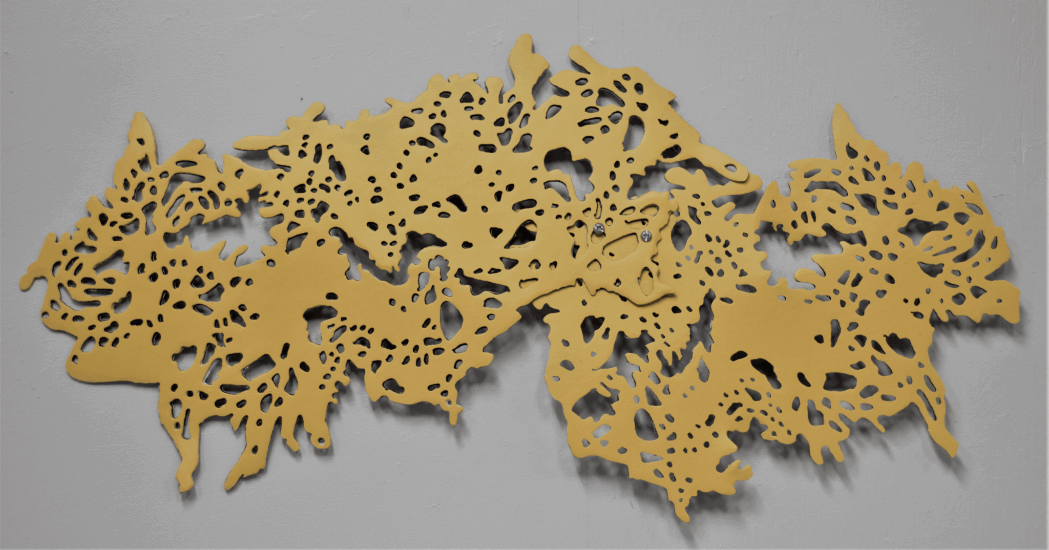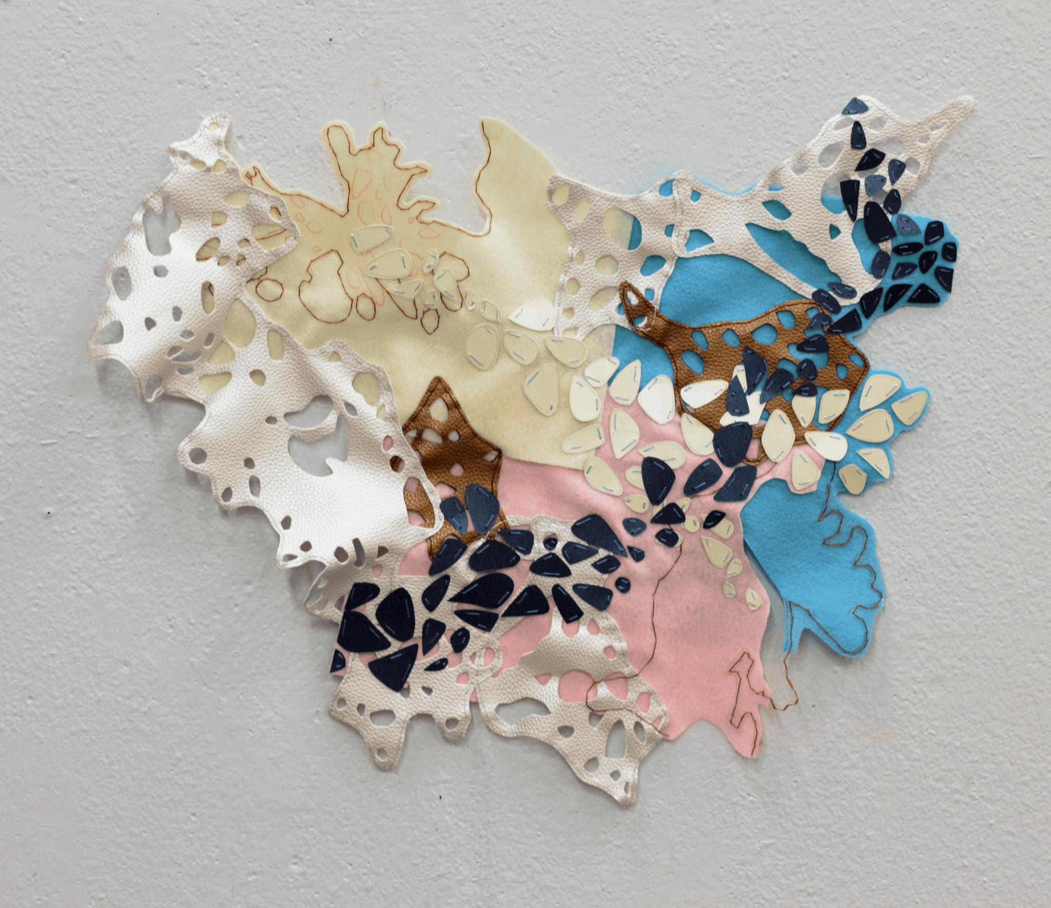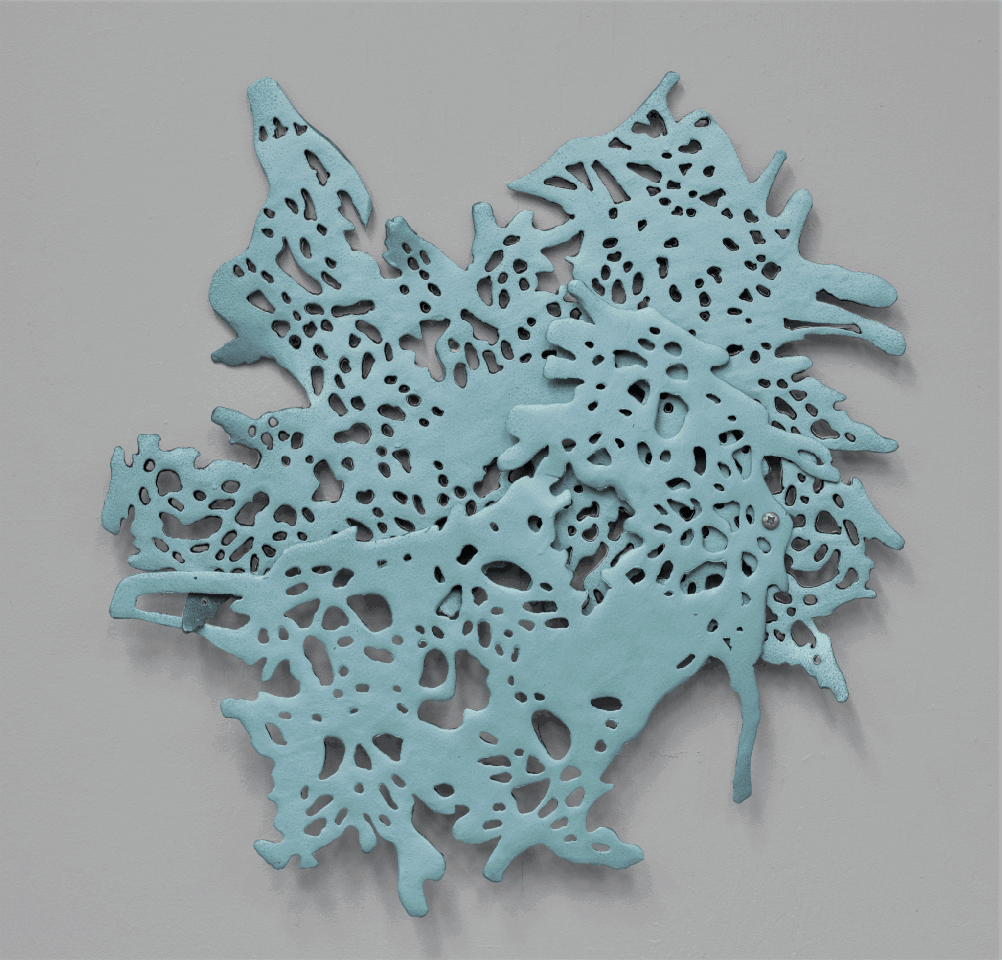 The work that I create is typically abstract and has varied from 10 foot steel sculptures to 5 x 7 inch felt pieces. In college, I was very interested in geometrical forms and the way that they can interact with each other to create interesting shadows; my early work had linear elements that often referenced grid lines. As I began studying my work in graduate school, I traced the shadows created by my cast pieces and then used the shadows as my new forms to cut out in wax. Over time, the linear pieces developed into the lacelike forms that I started cutting out of sheet steel. I began combining my shadow forms together to create larger templates that I could cut out and transfer to my final materials. As a very process-oriented perfectionist, taking myself out of the drawing process allowed me to create flowing forms that were all slightly unique and very abstract. I was also researching ocean life, specifically nudibranchs and coral reefs at the time; the patterns and shapes of their tiny bodies were fascinating to me, and I loved the range of bright colors amongst the reefs that were often jarring when placed next to one another. These patterns and colors heavily influenced the surface treatment of my work.