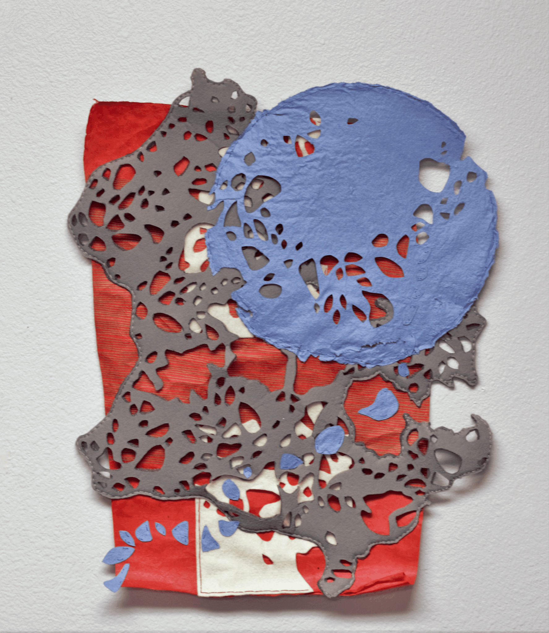 When I graduated from graduate school, the real test began as I needed to continue creating and developing my body of work while also supporting myself and my artistic interests. I began experimenting with new materials that I had on hand and could use without needing a welder or a furnace. My work has continued to transform to what it is today through my experimentation and need to adapt to my available surroundings and equipment. Currently, my work is mostly two-dimensional as I’m using materials that I can safely work with around my three young children (and often after midnight when I have spare time). Even though the final product is two-dimensional, I’m using materials that still have a three-dimensional feel to me. While subtle, there are various layers within my pieces that add to the depth of the work as well as a variety of textures to distinguish between different parts. In order to adhere the layers together, I typically sew my pieces with a needle and thread by hand. Each of my pieces, whether fabric, paper, or steel are also cut by hand (maintaining a little of that control!), so even though they are two-dimensional in the end, there is still a shadow created that can extend the piece when displayed on the wall or give a little peek to the back of my work.