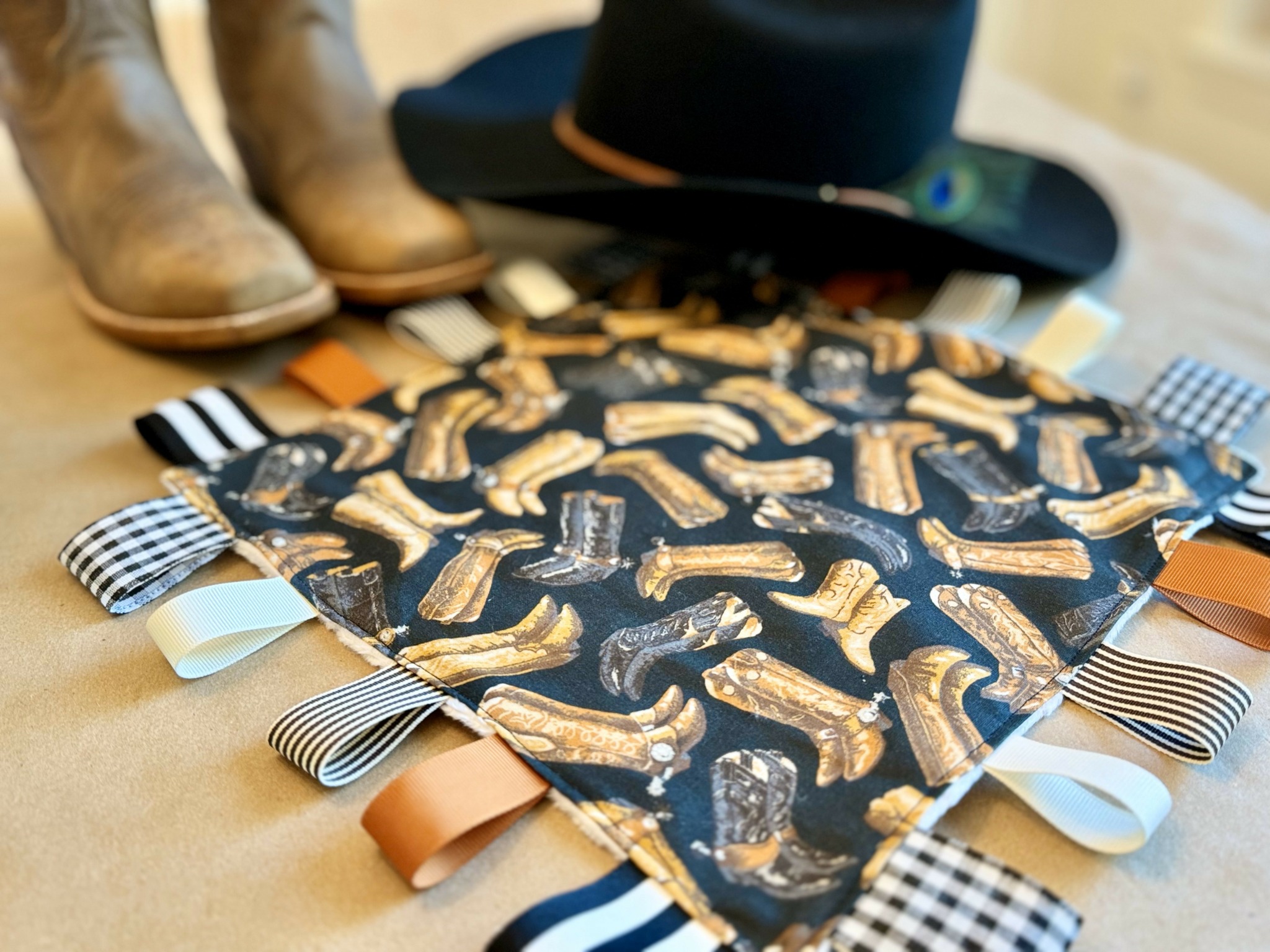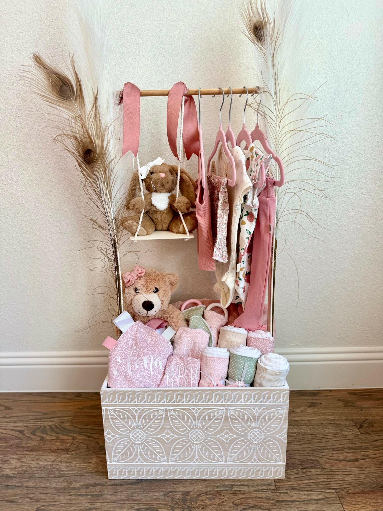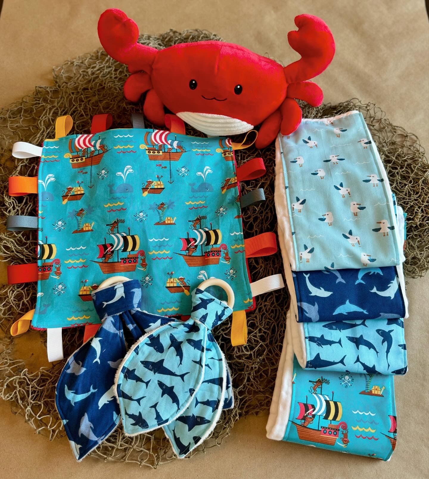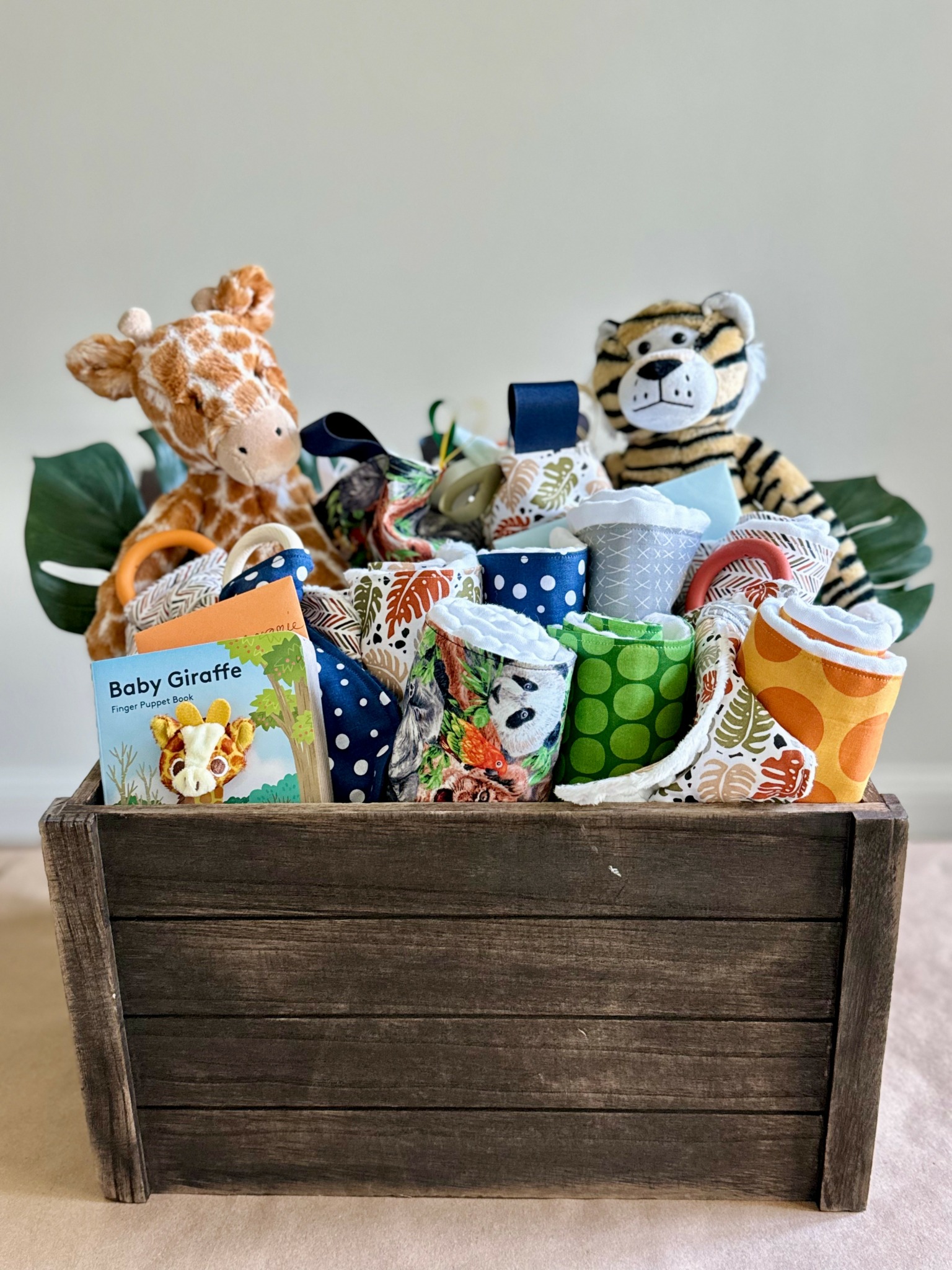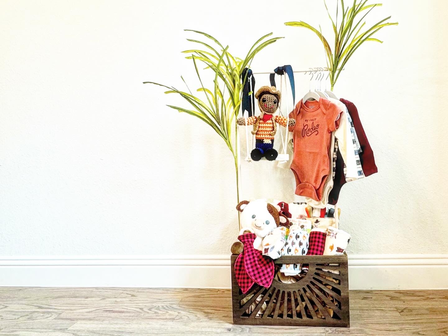 I love an over-the-top, themed gift or party. I take “extra” to another level. This inherent desire was the motivator behind my gift crates. It started when I was building my business and selecting fabrics to add to my online shop, I recognized that I could create mini collections with popular themes. I began shopping for coordinating prints to create these mini collections – for example, under the sea, country western, jungle, bunnies, flowers, etc. I would pick one “anchor” print and several coordinating prints to create a really cute set with all the baby must-haves like a coyote dressed as a cowboy for the sensory tag blanket, a red and black paisley print for the bandana bib, a sheriff star for the teether and finishing with cloth burp cloths in all of those prints plus a cowboy hat print. After sewing the individual pieces for the collections, I had the idea to put them together as I envisioned them being gifted at a baby shower. I recognized that the gifts I created would most likely compliment an existing gift from the baby’s registry or be paired with an outfit or other additional items. I headed out to buy a basket, a stuffed animal, a book, a few onesies and a pack of diapers. I jumped on my favorite idea app – Pinterest – and starting scrolling for baby gift basket ideas and stumbled upon the most adorable creations. As I traveled down this rabbit hole, my mind raced with all of the themes that I could take over-the-top and craft show-stopping baby shower gifts. My goal was to be the best gift at the shower and become the one-stop-shop for baby gifts. Where my customers knew they could come for unique, high-quality gifts. I created 4 crates to start – jungle, pirate, teddy bear (gender neutral) and a super girly pink, boho themed crate. I took pictures and added to several Facebook groups to advertise my services. My hope was that I would receive individual orders and orders from people that were chipping in on a group gift. I thought advertising these as a group gift was a great way to make a group gift more cohesive. I would handle all the individual pieces to create a really special, large gift. After a few posts, I received an unexpected message from a group member sharing that she wanted to hire me for her company’s group gifts. I was elated! She handles all of the baby showers for her workplace and wanted to hire me to handle them for her. She would share the due date / baby shower date, the baby’s registry link, any themes / colors she knew of for the baby shower or nursery, and her budget and I would take it from there. This avenue was completely unexpected, especially from a post a made in a mom’s group on Facebook, and it has been hands’ down, one of my favorite segments of my growing small business. I am humbled by her faith in me for these important gifts for her team and I love all of the new themes / patterns that I get to hunt for to make these gifts so meaningful. I am hopeful that I can grow this area of my business in the DFW metro area and beyond.