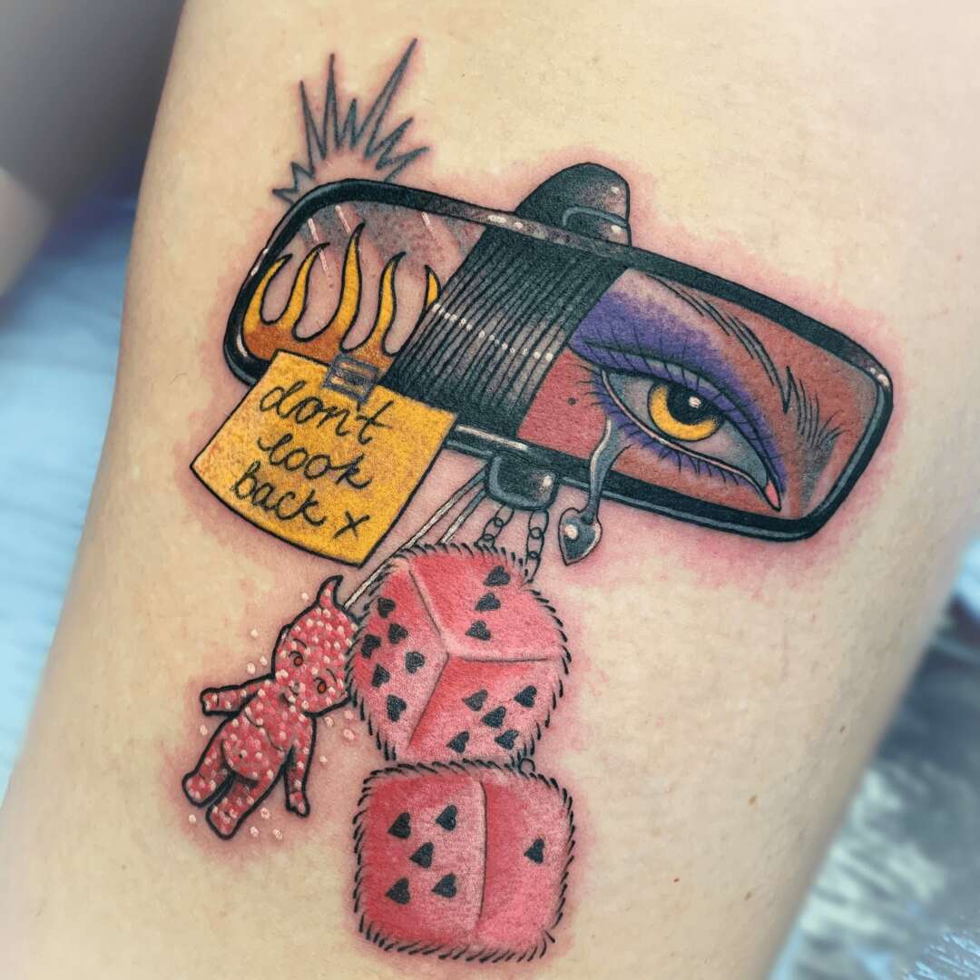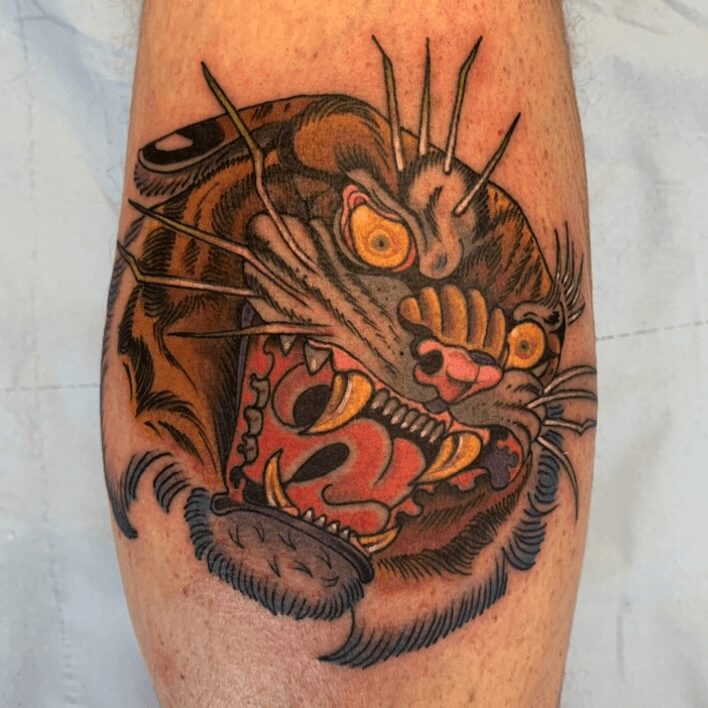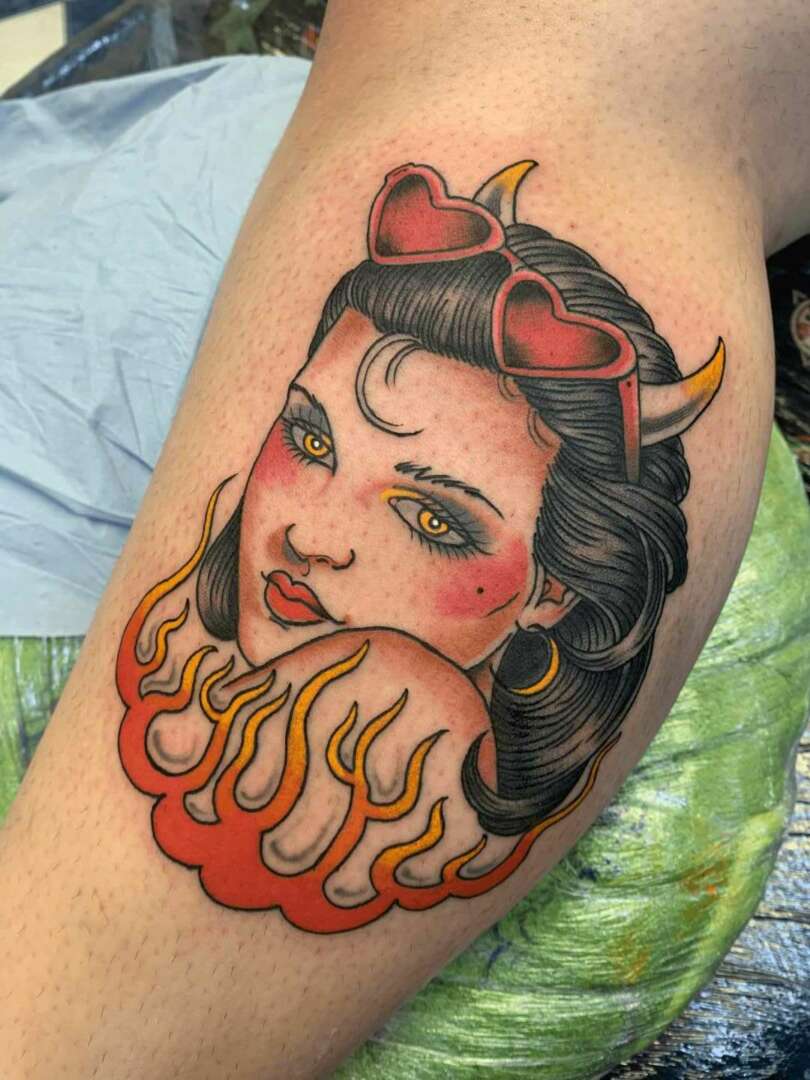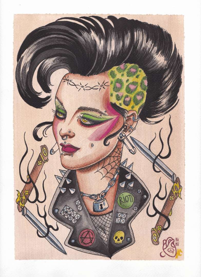 I’m also a self taught artist. I work with oils, acrylic, pencil, ink, and markers mostly. I feel the most peace and joy when I’m painting. I love the freedom of painting or drawing compared to the rules of tattooing. I would say my art is influenced by not only traditional tattoo motifs, but also horror, psychedelics, 70’s, cartoons, comics, spirituality, and camp. I find art very therapeutic as I find it hard to articulate myself in the usual ways, but I want to ultimately shift into making traditional art full time. I take on commissions wherever I can, but the fine art world still feels like an alien world to me. I’m very much inspired by other tattooists who successfully crossover.