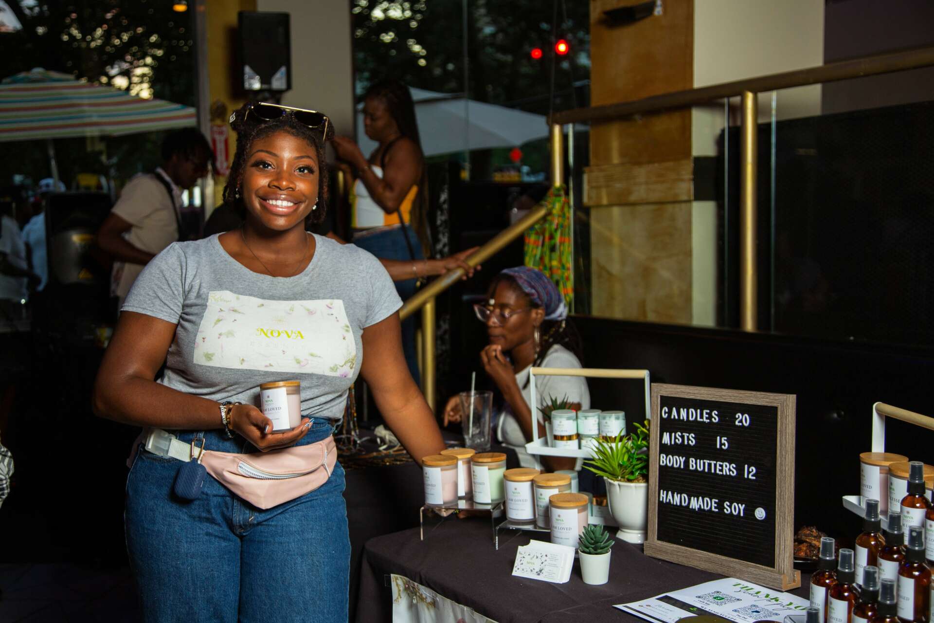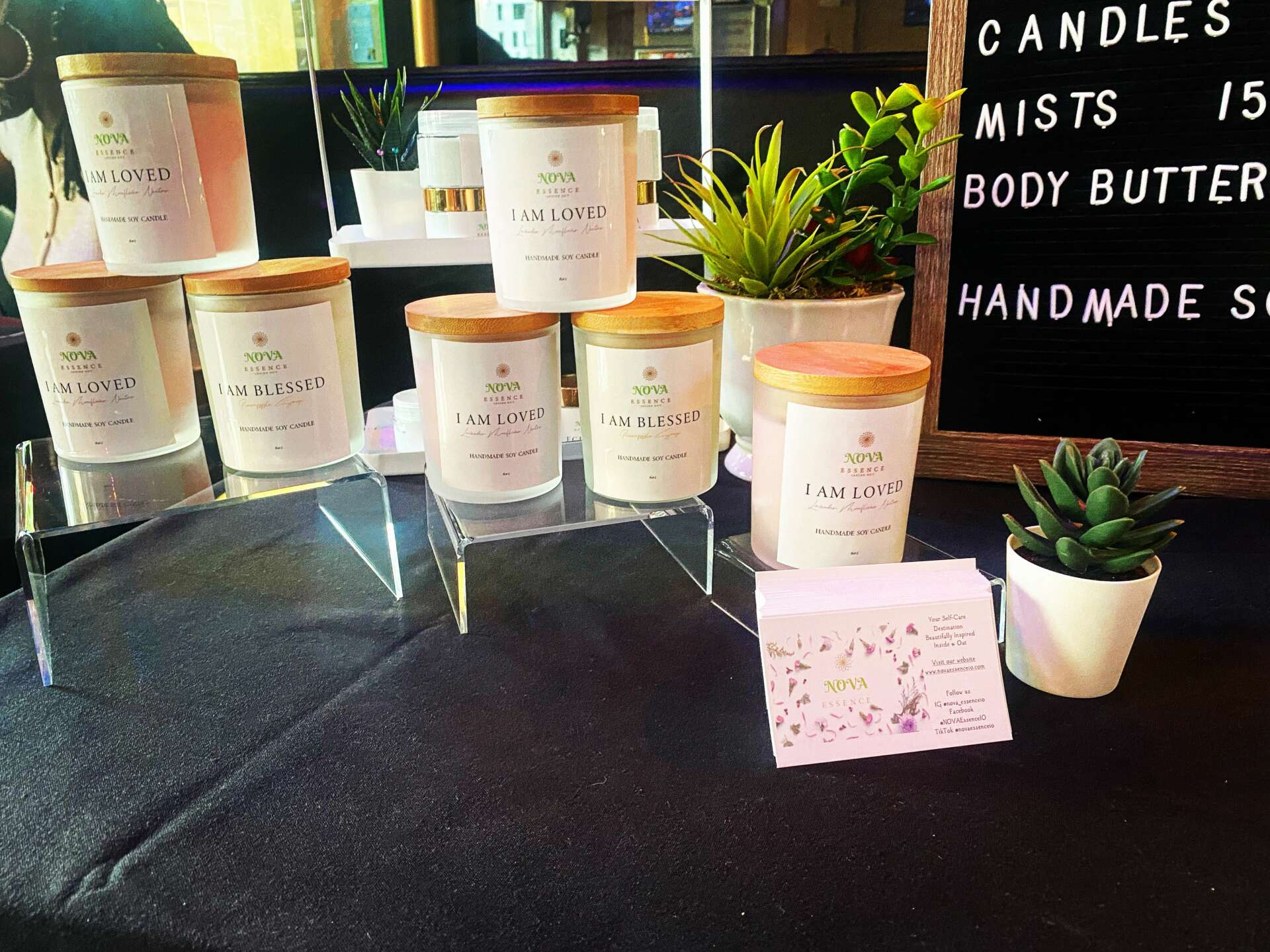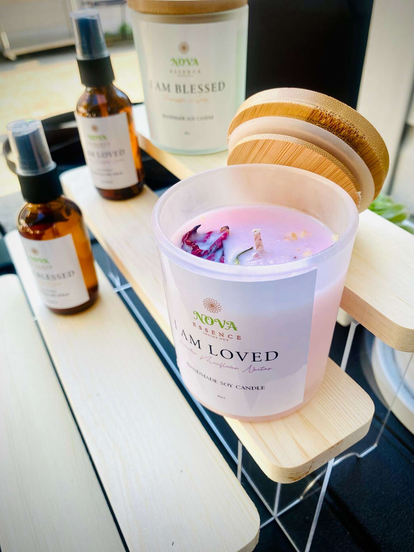 I am an Associate Project Manager during the day and a small business owner at night and on weekends. I love expressing my creativity through songs and handmade crafts like candles. I started NOVA Essence Inside Out with a passion to inspire others to care for themselves and create a self-care sanctuary where they can use aromatherapy produce to enhance their self-care routine. Recently, NOVA Essence Inside Out has extended its product offering to party favor services; where we provide customized party favors to give that special thank you to guests. In addition to that, we have been spreading affirmations everywhere we go when we are granted the opportunity to attend pop-up shops. Our main collection that encourages the self-love aspect of self-care is our I AM collection. The I Am collection offers different affirmations that help s remind people that they are worth it and that they should continually affirm who they are and speak life into themselves.