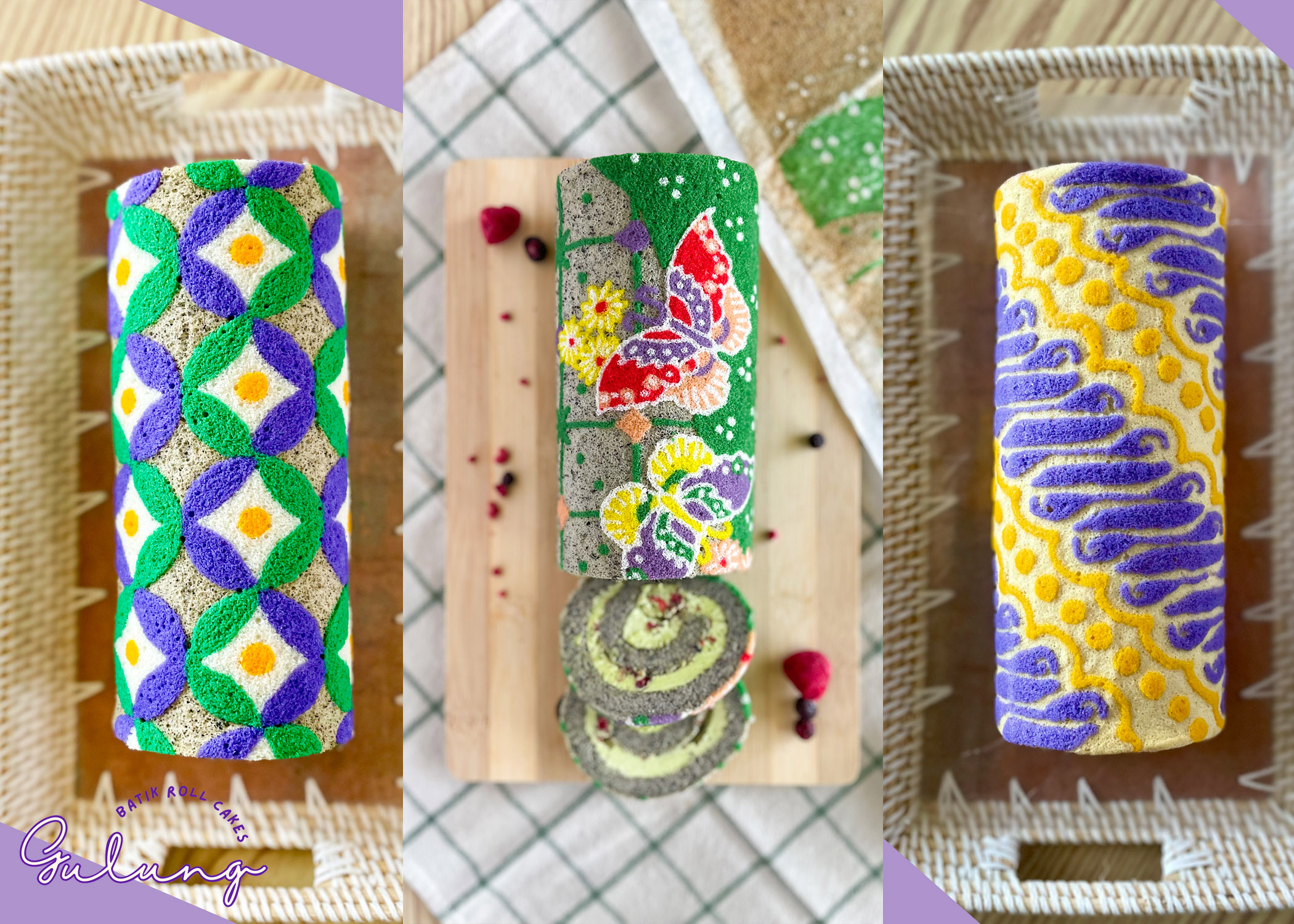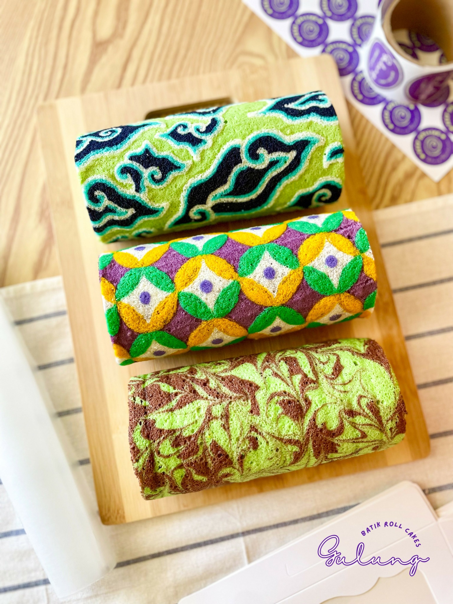 The first step was to refine the recipes. While the batik patterns were an essential visual element, I also wanted the flavors to reflect my Asian roots. Pandan and ube became Gulung Bakehouse’s inaugural flavors, as they are both beloved in Asian cuisine and offered a distinctive, aromatic profile that complemented the artistic presentation of the cakes.