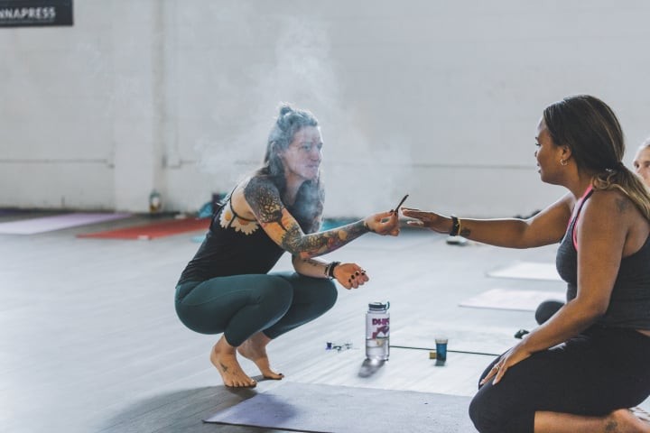 Yoga studios can be stuffy and feel unapproachable for newcomers. Especially when you roll in with glossy eyes and smelling skunky. So creating a yoga space for stoners was a no-brainer, and the magic happens pretty organically.