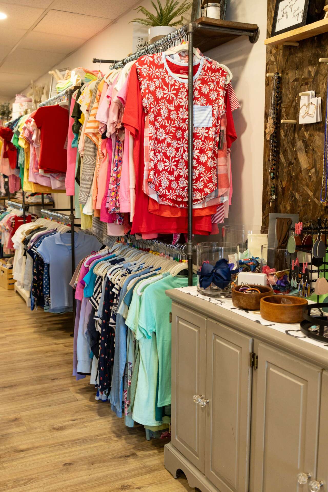 In 2019 we got licensed again in hopes of taking another placement. That summer we took placement of two siblings while concurrently dreaming and exploring other ways to support the community. I was always brought back to the day our little guy showed up to our doorstep with a single black trash bag full of ill fitting clothes. I knew through our experiences and conversations with other foster parents that Trevon’s story wasn’t unique unfortunately. And this thought of having a place that would help with basic needs wouldn’t escape me. As I was scrolling through instagram one day I came across an organization on the east coast that provided children in foster care with free clothing. A light bulb suddenly went off – and from that day forward I promised myself I was going to do whatever it took to bring a beautiful boutique to the foster care community – no matter how crazy my family and friends thought I was. If they could do it, so could I. I dreamed of a boutique full of love and dignity. A place that looked and felt like love. From the clothes on the racks and the words on the wall that read “the world needs who you were made to be” to a dressing room sign that says “be you bravely.” I wanted every inch of the space to scream LOVE.
