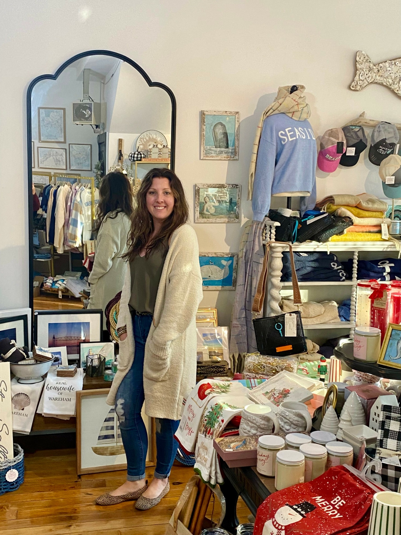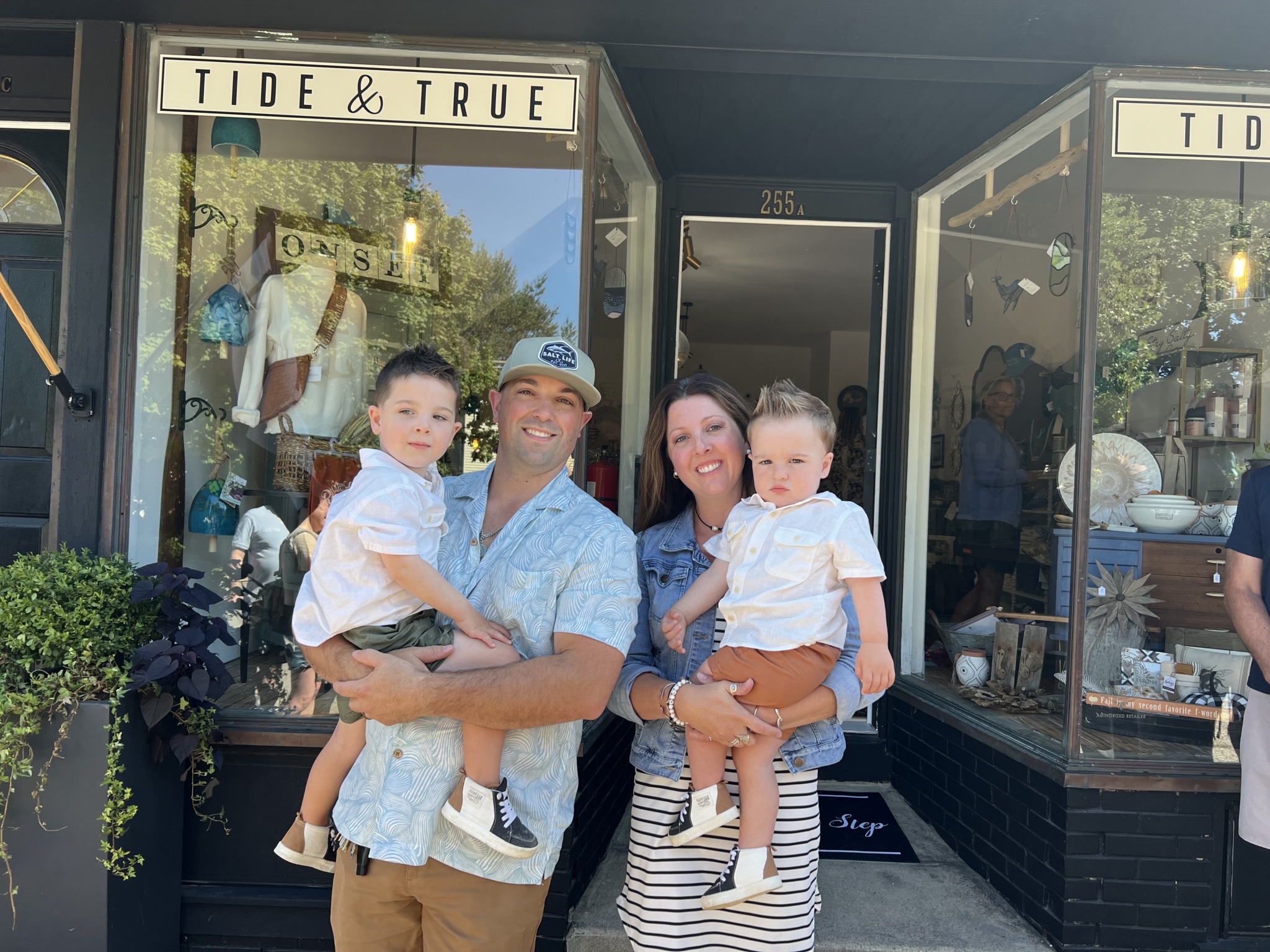 My name is Amelia Houde. I am a mother of two boys and a golden doodle named Bogey. Jude just turned 3 and Hunter who is 18 months. They keep me very busy! My husband Tim is a firefighter. We’ve been married for 5 years now. I opened Tide and True in June 2024 which may seem crazy to take on a new business while in a very busy time of life with babies/toddlers but the stars aligned and it was the right time to make the transition. I worked in marketing for 8 1/2 years and was ready to work for myself. My small town only had one gift shop which is unheard of in a beach town that nearly doubles in population in the summer. There was an opportunity to rent a retail space and I jumped on it. From January – April I worked my day job, came home and did dinner and bedtime with my boys and then worked late into the night to get everything going for Tide and True. My husband and my mom were a huge help every step of the way. By May I had left my full time job and switched gears to full shop mode. I opened the doors June 15th 2024 and the outpour of support from the community has been so great. I am offering a range of gifts, jewelry, home decor, sweaters, stationary, local art and more. The products I offer I purchase from local artists, brands and sales reps. I try to find unique items my customers haven’t seen before or have them customized to say Onset, Wareham, Buzzards Bay, the local beach names. I use social media a lot to share what’s new in the store. People have been very responsive and come in because of the posts they see. Not only do I own a shop in my community but I live there too. My commute is a mile and a half! It’s fantastic! But what I like to point out is that I’m not just some outsider or a big company coming to make money off of a beach town. I care, I live there too. I custom order things for customers, I gift wrap, run fundraisers, I give as much as I can. I like to get involved. I am notoriously “busy”.
