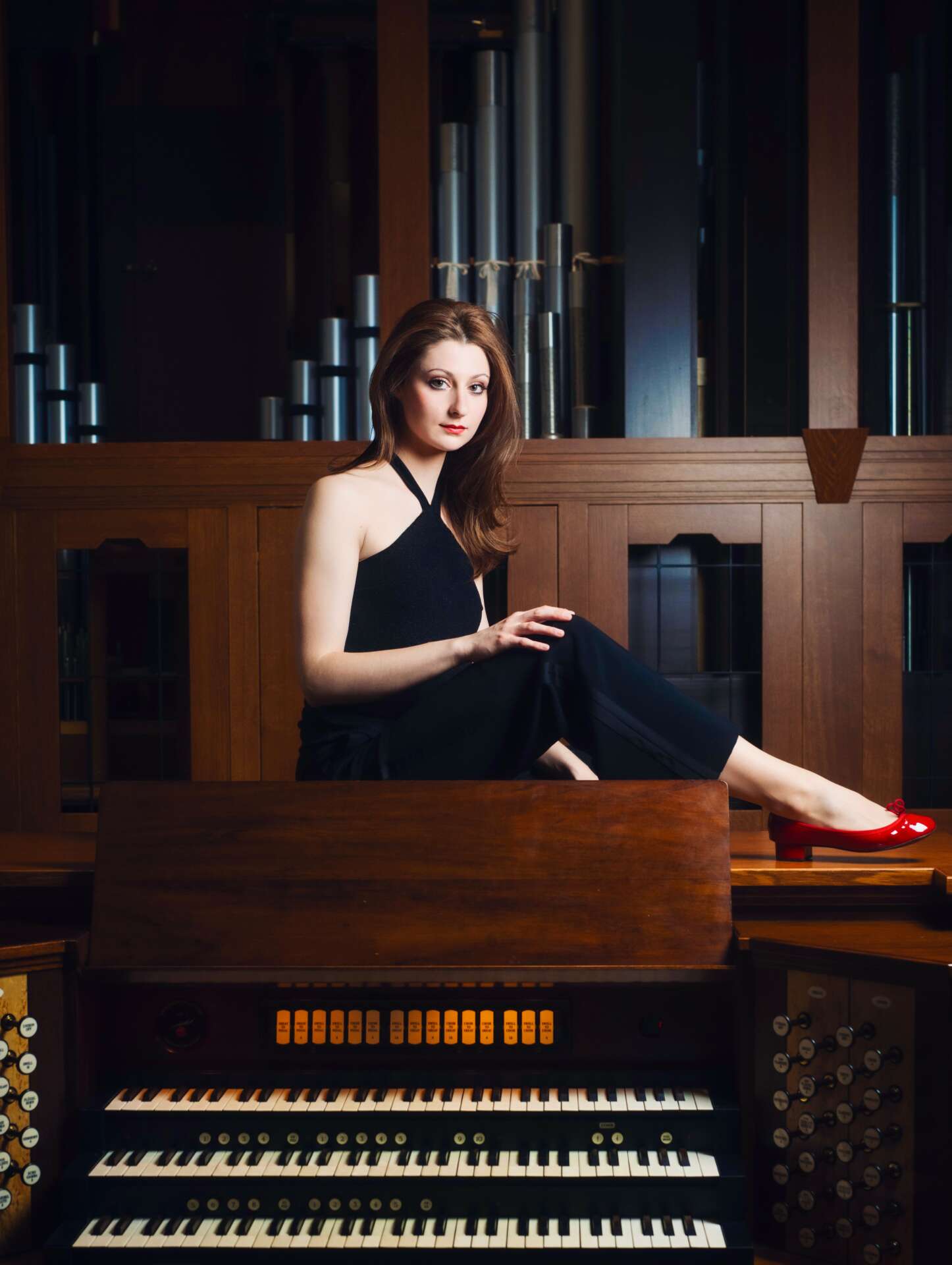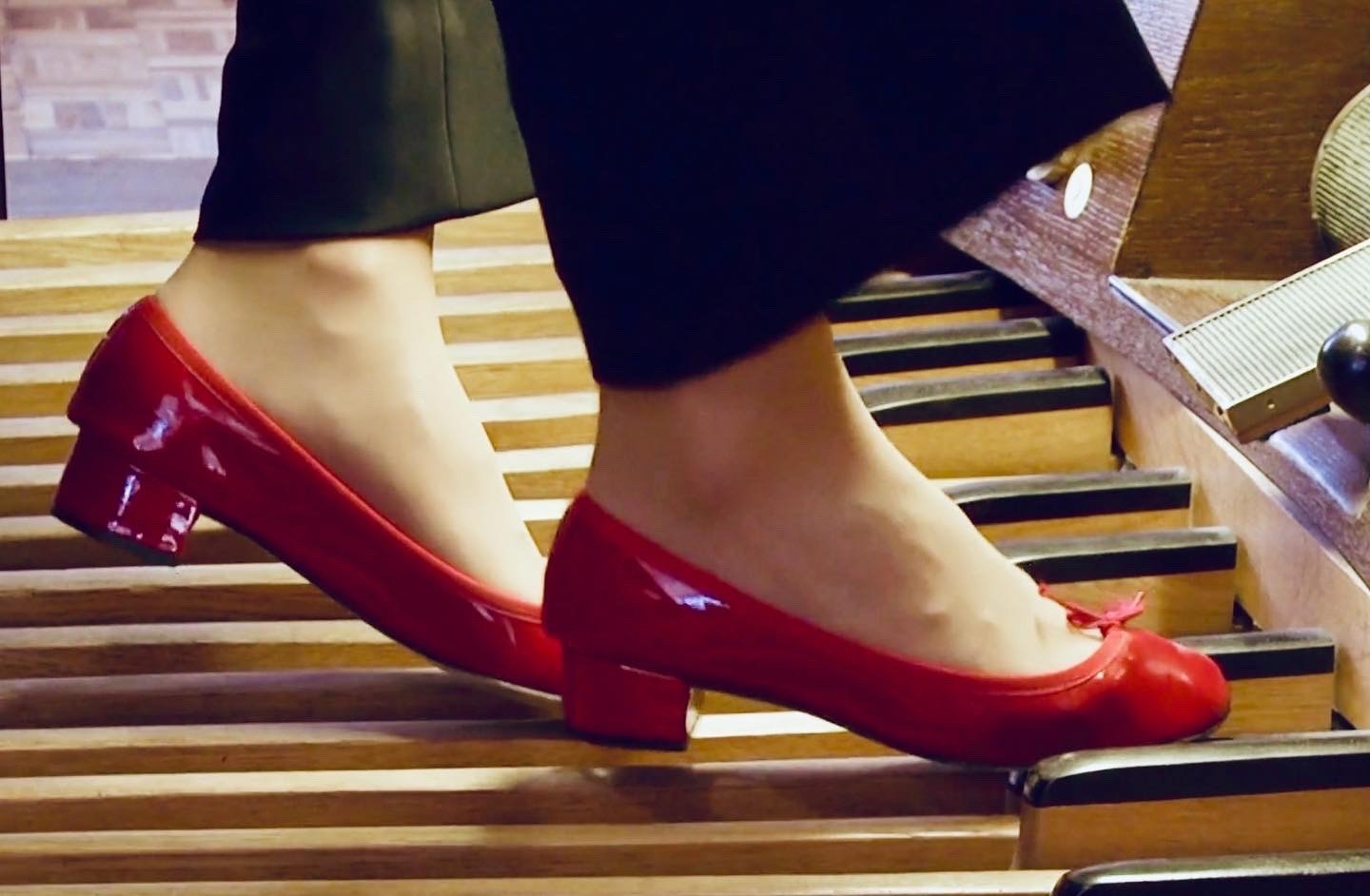 But back to the organ: Ever since I was a child, my fascination for this gigantic and complex instrument somehow never let go of me. I was about ten years old when I was standing for the first time in front of this huge cockpit-like console with its many knobs, keys and pedals, trying to wrap my head around the fact that all of this could be controlled by just one person. The organ is the only instrument that can go from super soft sounds to ear-blasting frequencies, all in just under a second! It is the only instrument that has just as many sound colours as an entire orchestra, and even more! In fact, as an organist I could be my own ‘one girl orchestra’ and I just loved this idea! So much, that I spent nine years of my life studying at different music conservatories in Germany, France, Italy and the US and had the chance to learn from the very best performers and pedagogues of our time. Now it is my turn to pass all the knowledge that I gained during those years on to the next generation and anyone interested in discovering the organ. Thankfully, my job never gets boring, because no two instruments on this planet are the same, but every organ is a unicum. Unlike pianists or any other instrumentalists, we need to newly adapt to each and every instrument every single time, finding the best sound colours and getting used to the different measurements of each organ, which in fact makes us organists the most flexible musicians out there! But sadly, my instrument is being underrepresented and underestimated in so many ways… So now it has become my job and responsibility to make the instrument and all of its repertoire cool again! By the way, all organists need special shoes for playing: Mine are ruby red and have by now become my signature trademark.