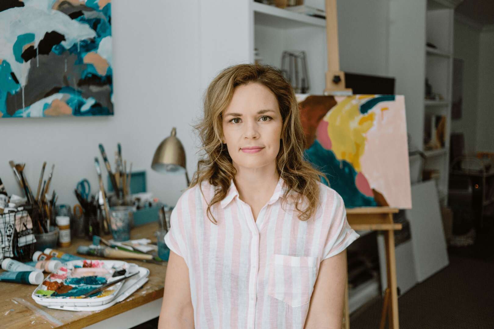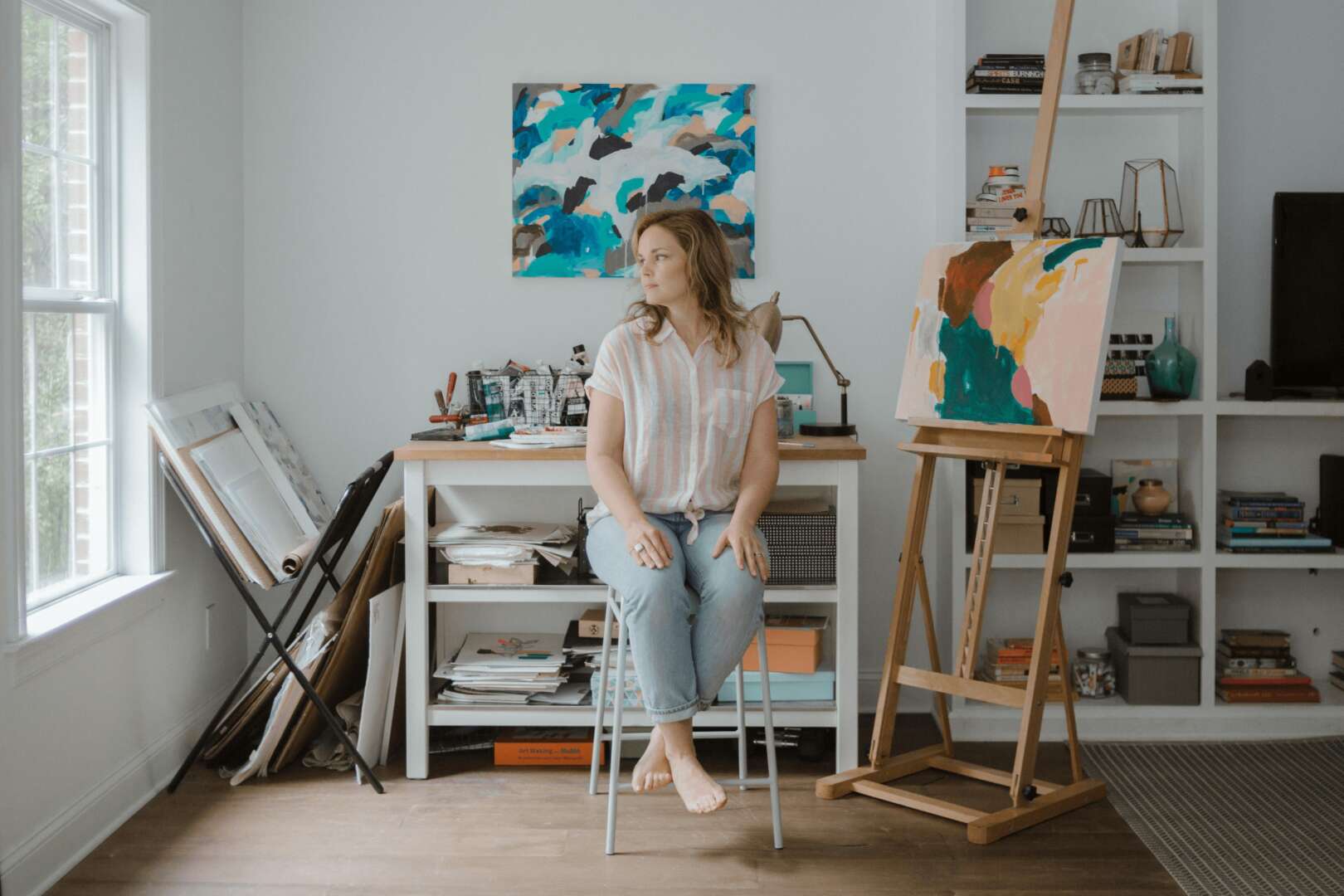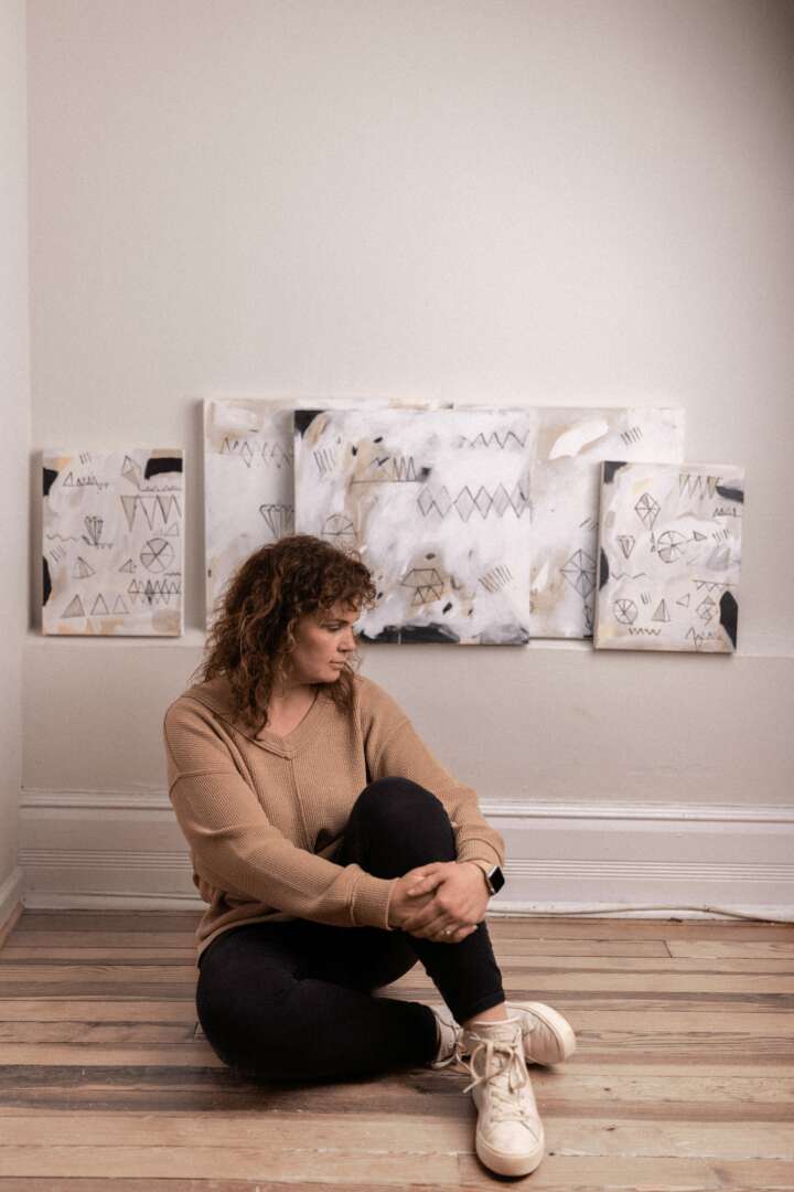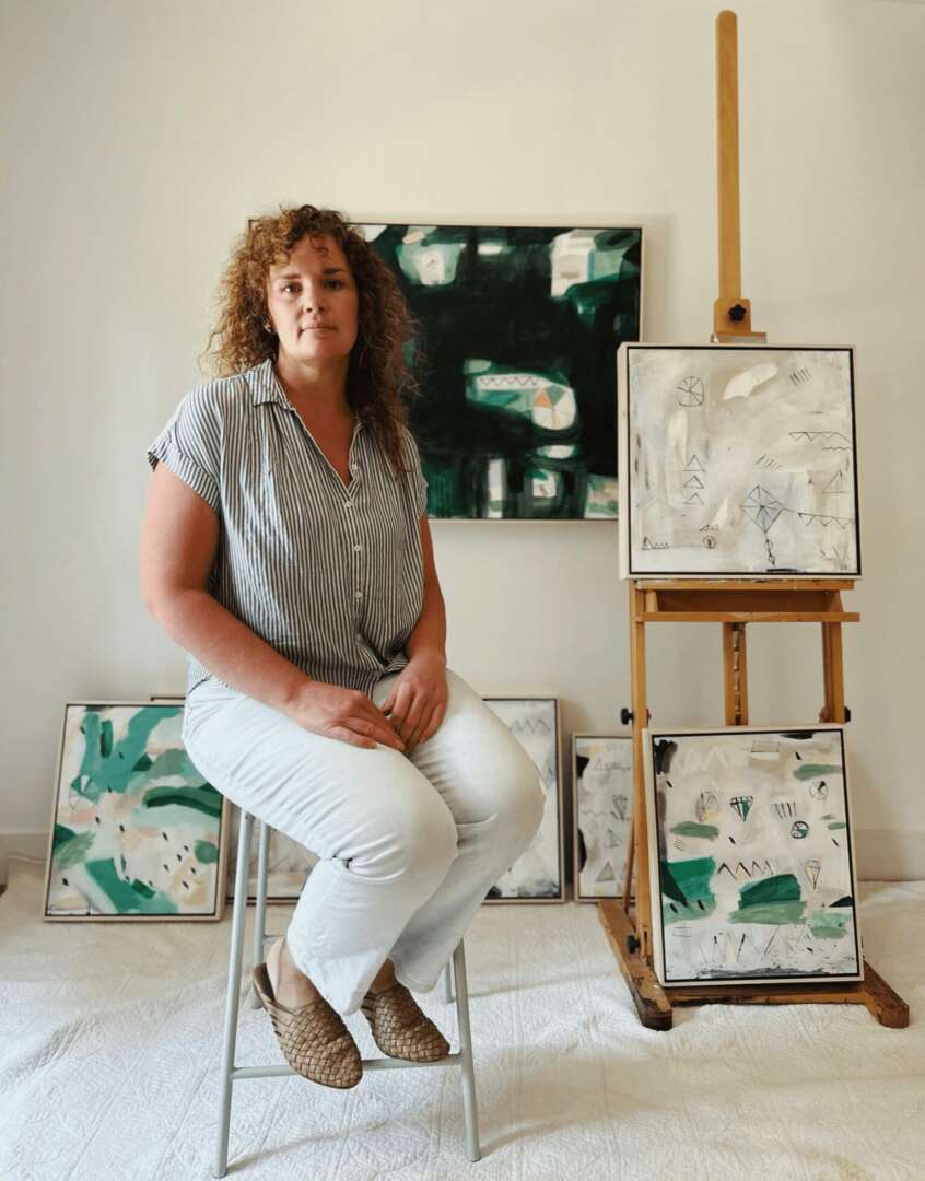 The first time I knew that I wanted to pursue an artistic path professionally was after I faced a terrible, life-altering loss of my husband of twelve years, to cancer. Let me explain. I have definitely always been interested in creative pursuits. In my younger years, it was always experimental–crafting, singing, being creative in general. In college I learned a lot about photography, particularly composition, yet I decided the technical side of photography was not for me. I discovered this after I got married and I worked for a photographer for a while. I enjoyed it, but not as much as I thought I would. It was a natural end to photography when I started my life as a mother. I began my job as a stay at home mom. My husband Chris was the first one who started dabbling in the painting medium. He learned some technique from an artist friend and his art started taking off. I began painting some on top of my photos, with some mixed media experimentation. My husband started questioning his day job and really began to pursue his art dream on the side. I painted some as well, but never fully owned it, as I was a busy mother. We had two kids together, with one on the way when his health began a major decline. We were blindsided. While I was pregnant with our third my husband Chris passed away. I never thought this would be my story. As a single mom with 3 kids, I had a lot of choices and such a different life in front of me. I discovered creativity was a big way I could process my grief. One thing that rose out of those ashes was my own creative spirit. I knew that I was supposed to pursue art also. I knew that the greatest way to honor my husband would be to live life fully. I began painting in my dining room with drop cloths everywhere, and just leaving it out so I could paint in my spare time while raising kids. Art started to spill out of me and the courage to go on with life kept growing. I remarried a music producer, and we have gone on to have 3 more kids. I am an artist today because I said yes to the life that was in front of me. I said yes to creative pursuit in all the ways! I am so thankful for the opportunity to create and live this beautiful life.