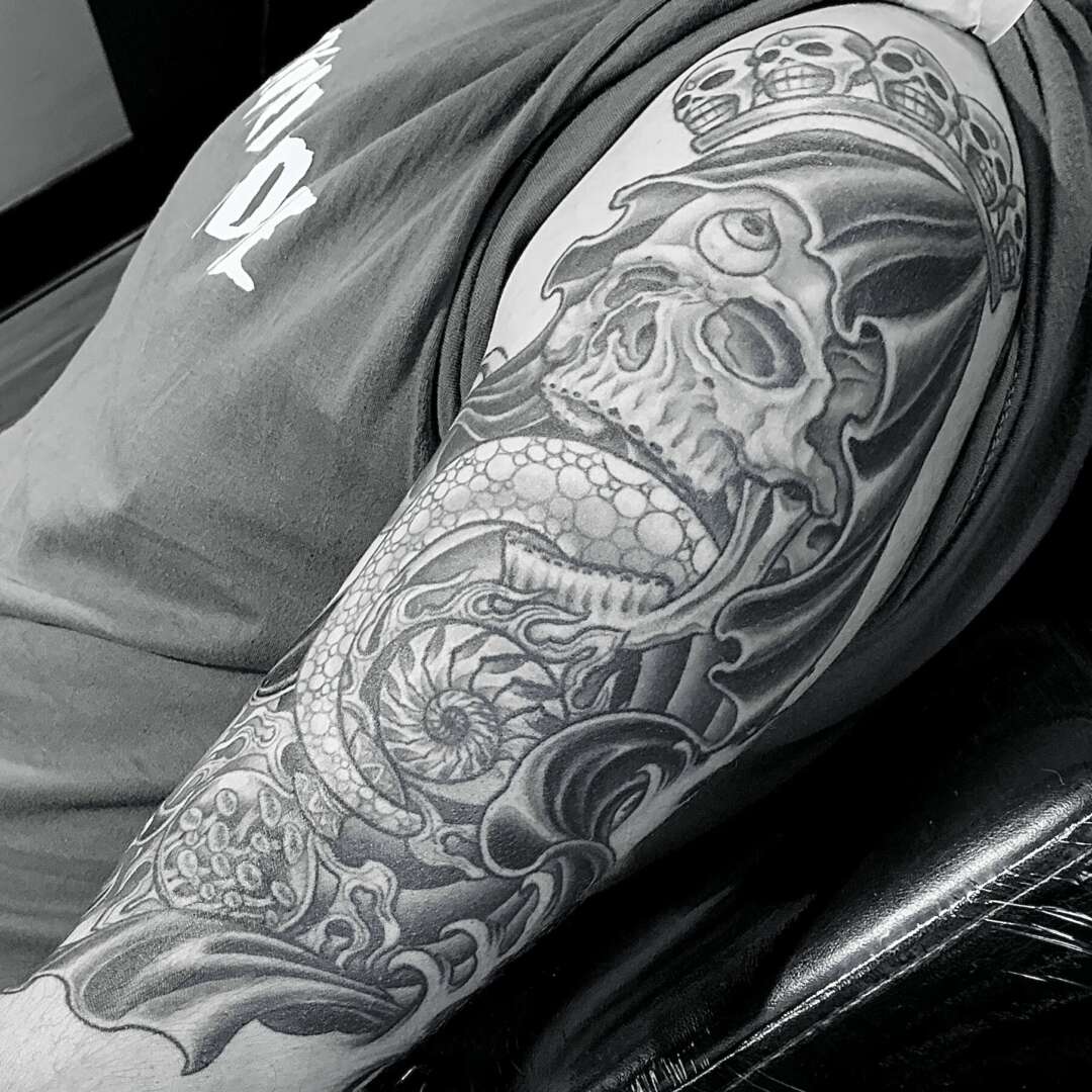 To me, being a versatile artist means you ought to know a lot of things. Understanding a vast array of subjects, their intricacies and symbolism is paramount. Naturally, I’m no human encyclopedia, there’s only so much one can hold up there, so I tend to do frequent and extensive research for most of my tattoo creations. Taking a deep dive into ideas can often help me through a creative block and can assist clients in seeing their creative visions reach full potential. For me personally, it creates a stronger connection and a deeper interest in their tattoo ideas. Knowing a little more than how to draw what the client asks for also makes for great conversation where both parties have a vested interest in the subject matter.
