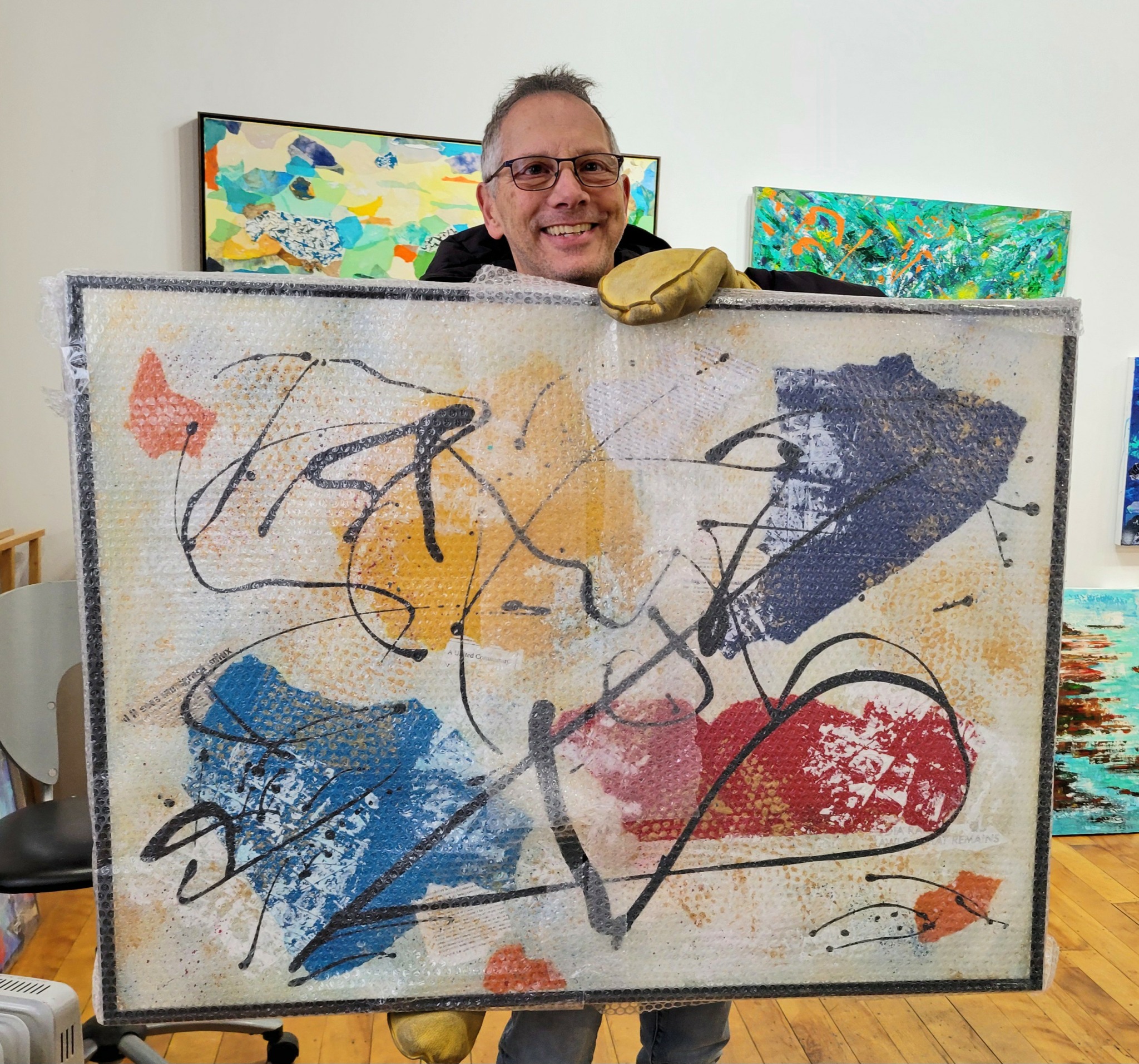 Moving seriously into art: In my late 60s, as I experimented more and more with acrylics, I realized that my home basement was inadequate as a painting studio, and sought more functional space in one of the Minneapolis art district studios. I had been sharing space for display and sale of photography and was able to move into a larger studio to support the actual work of painting. In addition to work and display space, this move also provided me with a community of artists working in all mediums. This has been invaluable in many ways, particularly having “colleagues” to share ideas and methods, as well as the opportunities to participate in “open studio” events throughout the building and throughout the Arts District, and enabling me to sell enough work to pay the rent. I can not imagine making this work if I was not already receiving my retirement income. My situation allows me to concentrate totally on the art I want to create regardless of sales, to set my own schedule, and worry (less) about critical response to my work. I do apply to juried shows, submit proposals for exhibits, and participate in a number of nonjuried exhibits as opportunities to share and promote my work. I don’t do it for a living but I do it seriously. This is not a hobby. This is my current life. And it is a business as well– using social media and more, promoting events, finding some way to bring people into the studio including those who are not likely to be major art buyers (making notecards and handpainted flower pots, hosting guest artists, etc.)