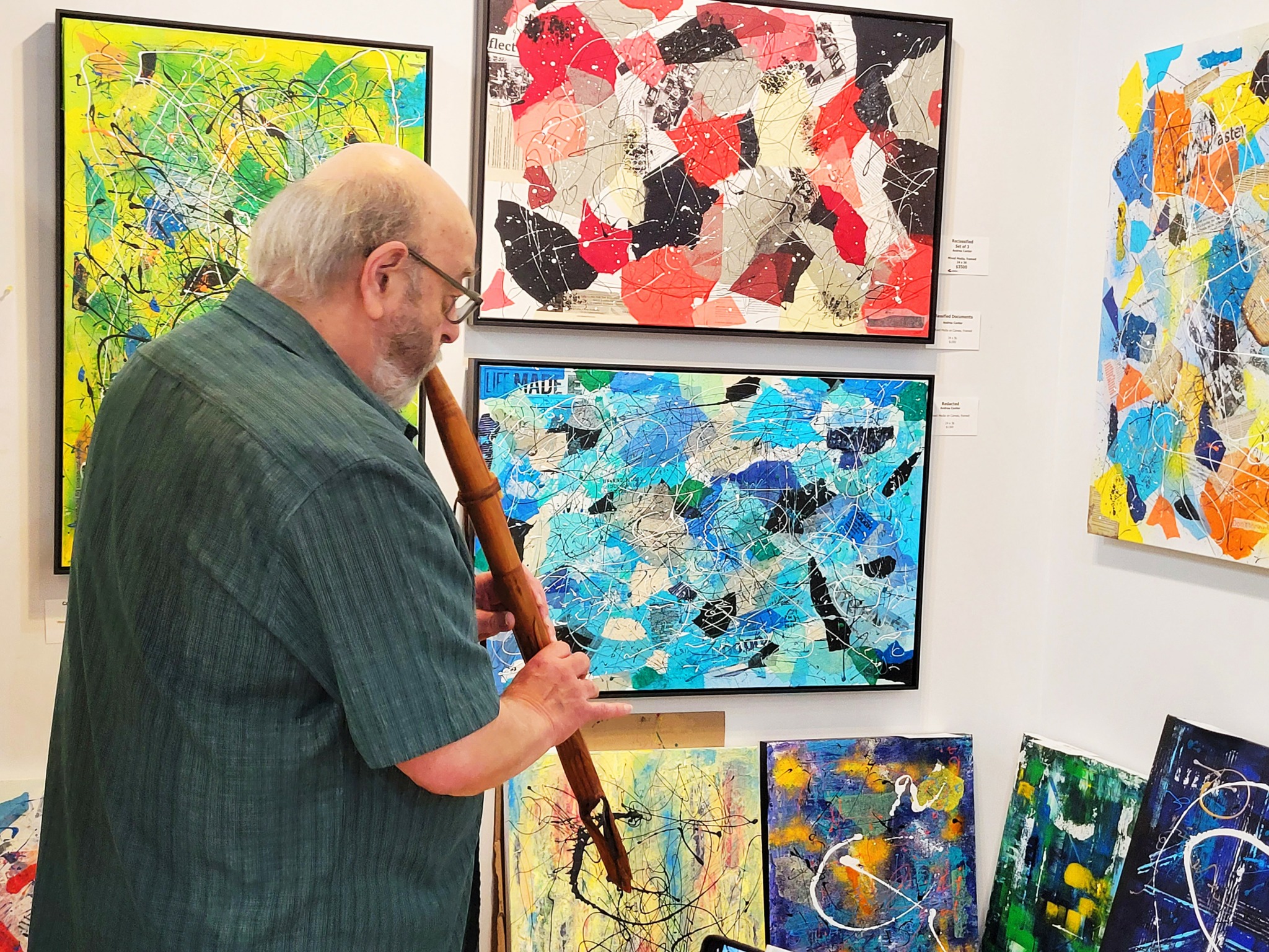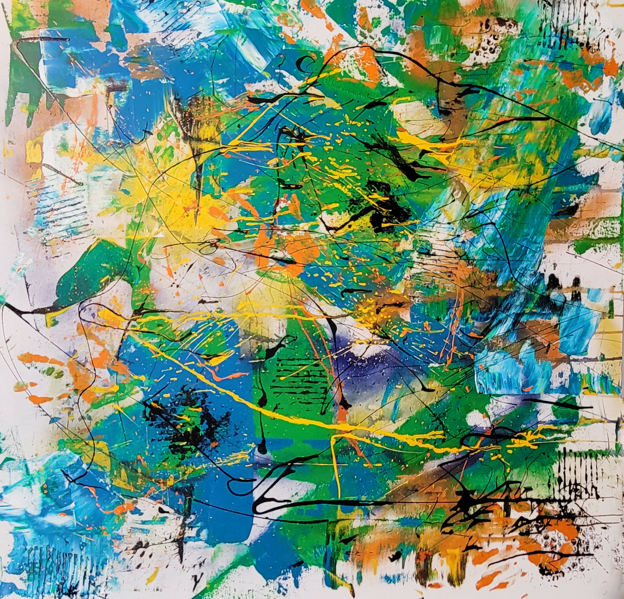 My work follows an abstract path and one portfolio (“Urban Abstraction”) might be labeled “abstract expressionist” while another strand of my work (“Imaginary Landscape”) might be labeled “contemporary impressionistic.” (Some one once told me that my work suggested the product “if Monet and Miro had a baby….”) My “urban abstraction” work combines acrylic in various forms (heavy body paint, fluid acrylics, latex housepaint, etc.), monoprinting, and collage using various papers and other materials. It can be very physical—I will drip, spatter, and throw paint as well as use knives, hard rubber “shapers,” and rarely, brushes. My other portfolio of work (“Imaginary Landscape”) also includes straight acrylic and collage approaches, is also abstract, but draws often from impressionism. My works generally range from moderate (24 x 24) to large (30 x 40, 36 x 48); the largest work I have completed so far was 48 x 60. I love working large but handling a canvas that size is really difficult at this age!