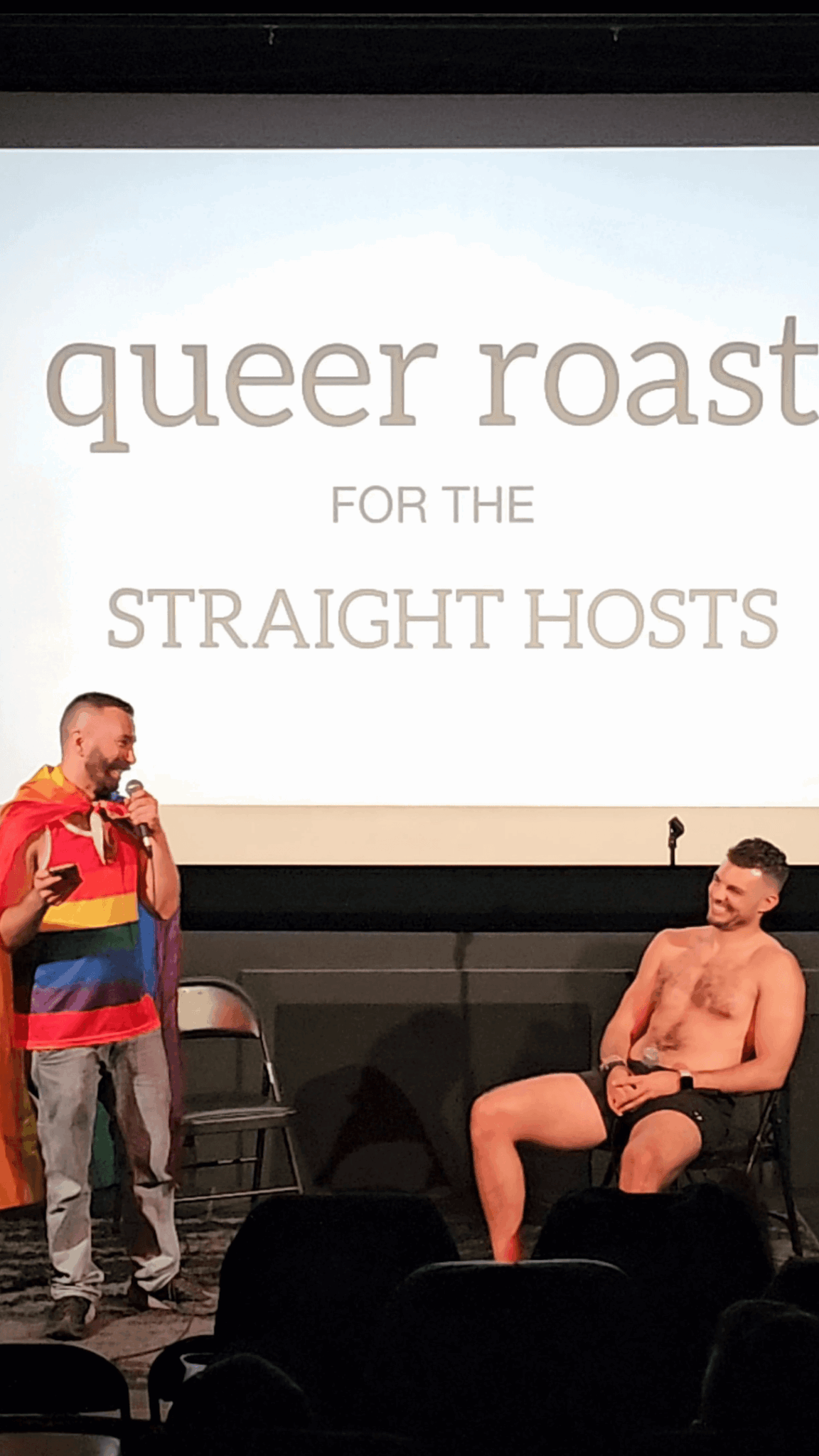 The show is really fun, funny, high energy, and occasionally unhinged. It’s 3 straight comic, 3 queer comics, and in between standup sets, the queer comics roast the straight comics (the straight comics do not roast back). The straight comics are also challenged to a gameshow-like dare, usually parodying a Queer Eye makeover with a ridiculous lesson- for example, we made Sam Salem perform jokes in a bathrobe and a face mask.