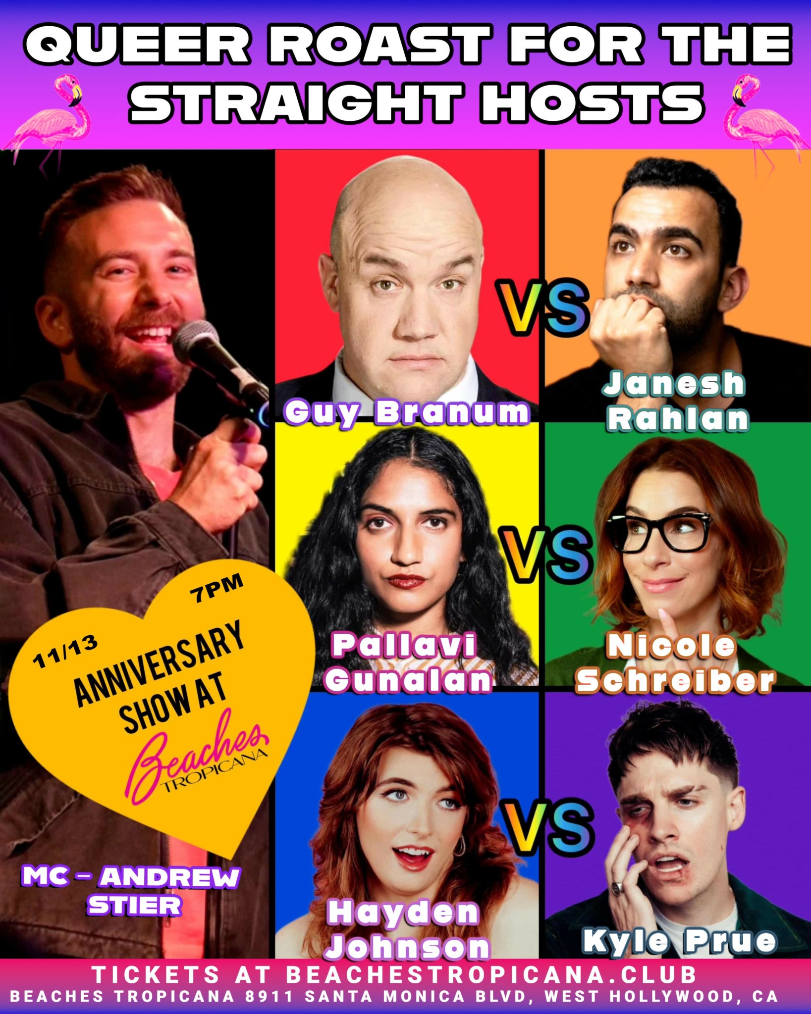 Queer Roast for the Straight Hosts, the fun and hilarious (if sometimes chaotic) standup comedy show where queer comics roast straight comics, is celebrating its one year anniversary! I started this show a year ago as a way to get more involved with the LA standup community when I moved here from the Seattle standup comedy scene. I specifically wanted to do a standup show that platformed queer comedians, because I have always found us to be underrepresented in comedy. However, I also did not want to silo myself and my community from the rest of the standup community, so I also wanted the show to involve straight comedians. Thus, I decided on a roast show format as a natural way to pair gay comedians and straight comedians together!