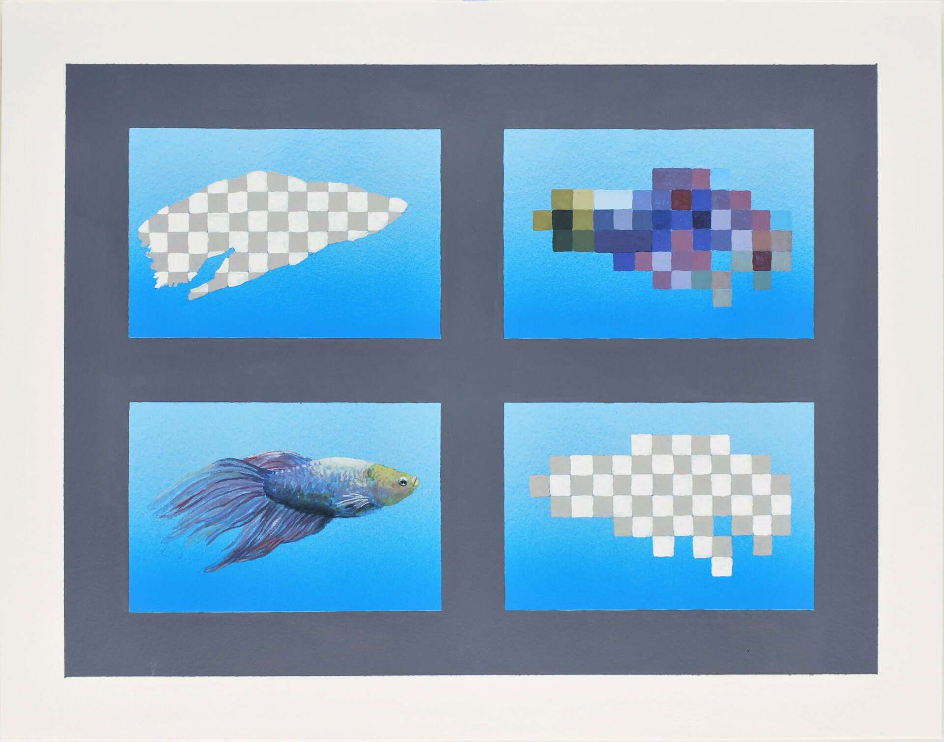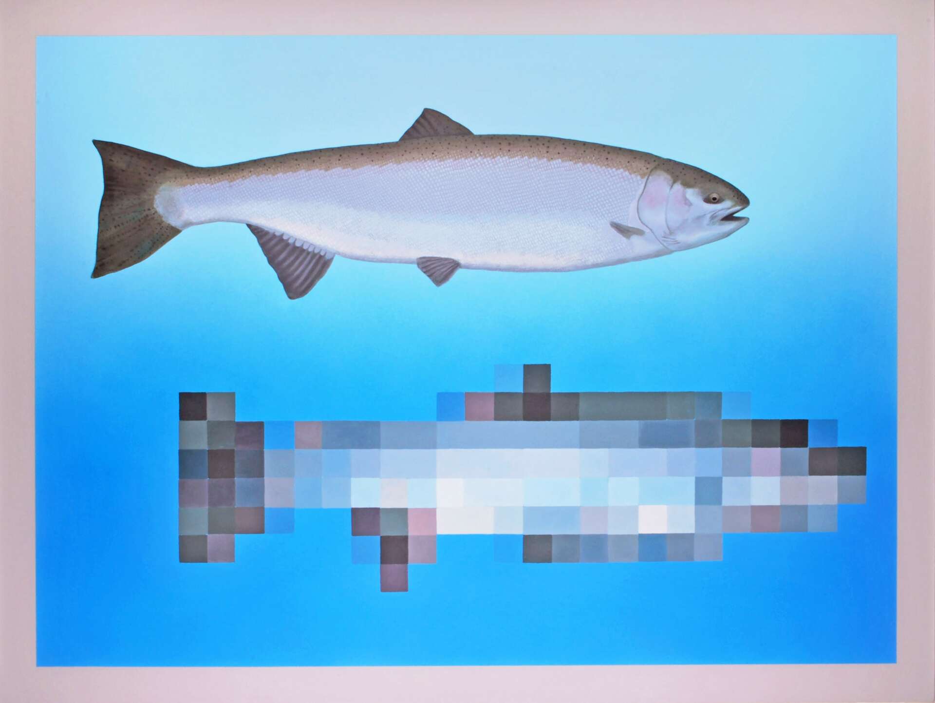 My current ongoing series, Quest of the Steelhead, is a collection of paintings depicting scenes from an imaginary video game about sport fishing on the St. Joseph River of Indiana (and Michigan). The series is a blend of fantasy and reality. While some compositions represent actual ecological locations, others depict fictitious arrangements with nonnative fish species that are intended as metaphors for the complexities of human existence. In this aquatic world, pixelated images become symbolic of the intangible, questioning the nature of awareness and how one understands what one cannot physically perceive.
