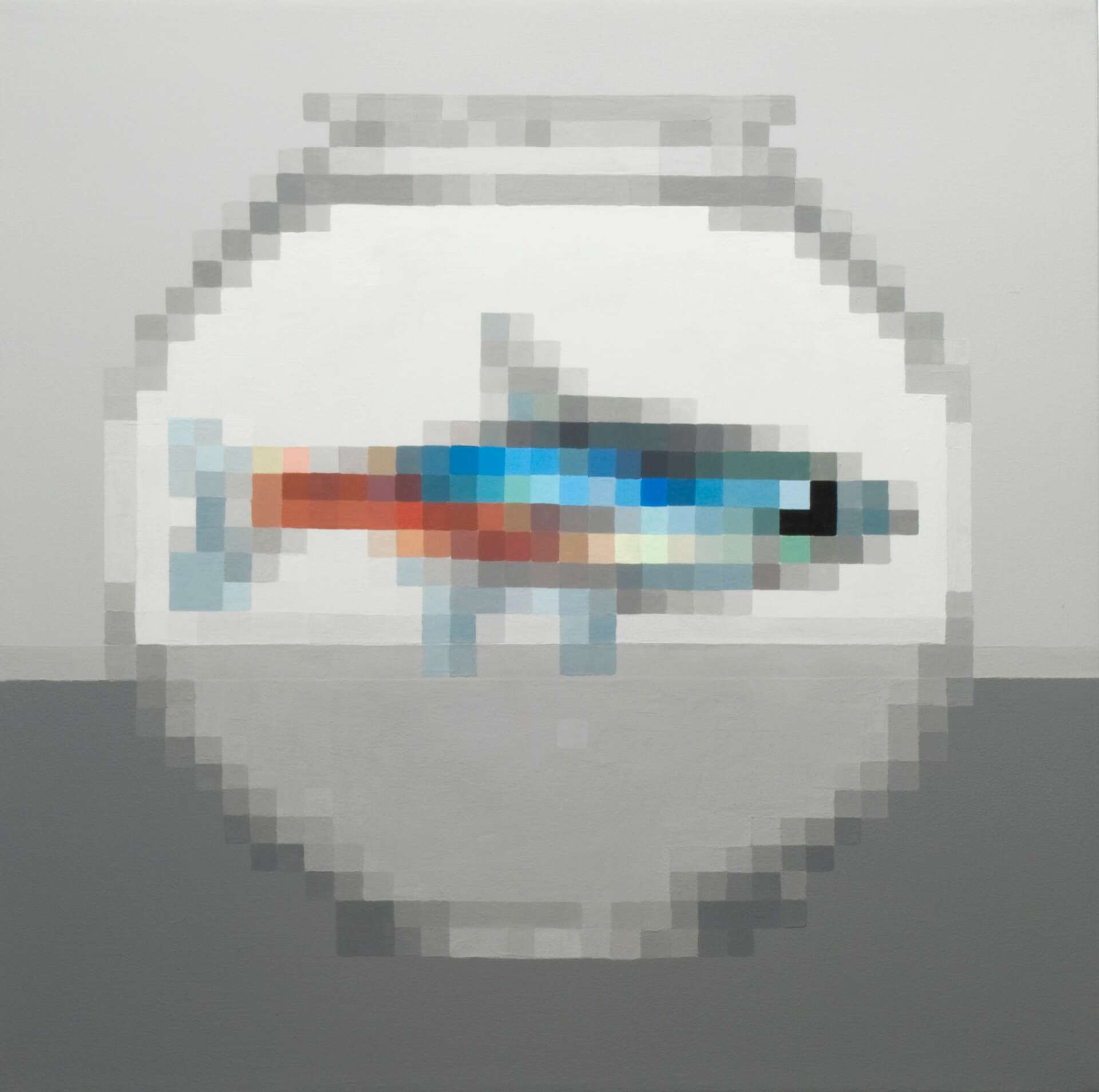 My work is an exploration of the pixel, turned pigment. The final images are rendered in paint, but they are a hybrid of both digital and analog processes. I create detailed digital sketches that are inspired by a combination of found imagery from the internet, vintage video games, and other forms of computerized visual communication. The preliminary digital sketches are then translated into physical paintings as a means of exploring one of the key characteristics of 21st-century life, the constant influence of digital technologies on the mind/body; a play between the virtual and physical, the tangible and intangible.