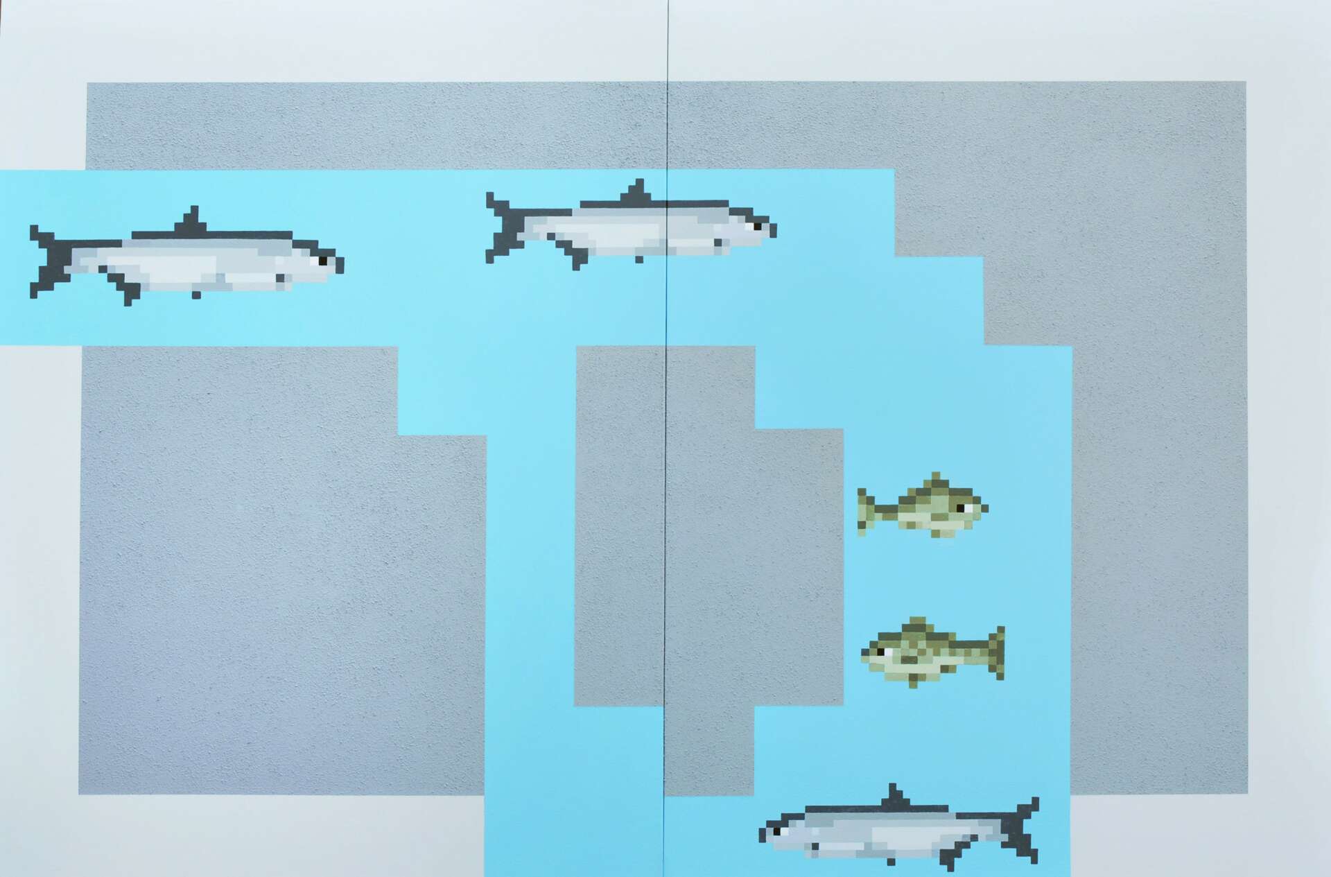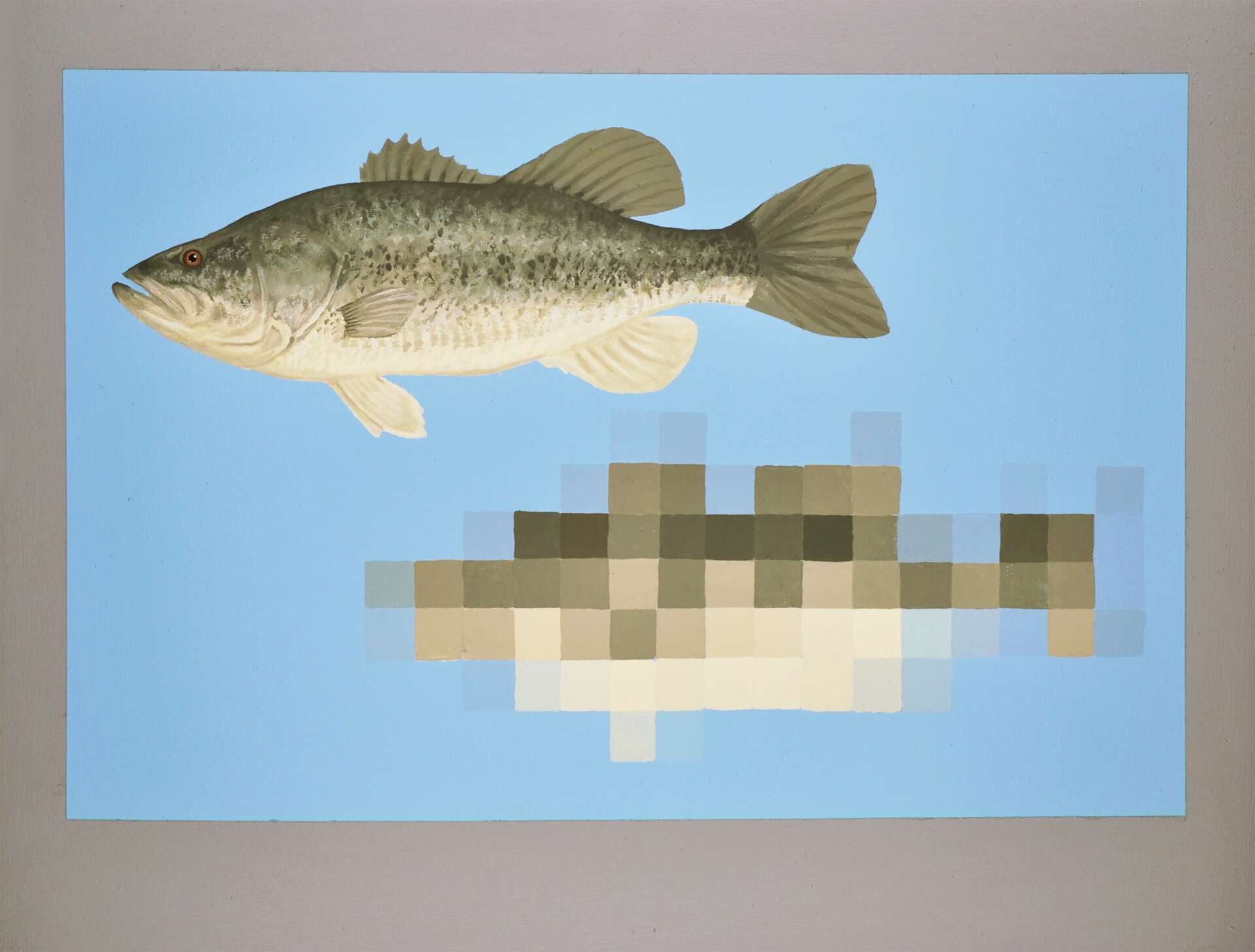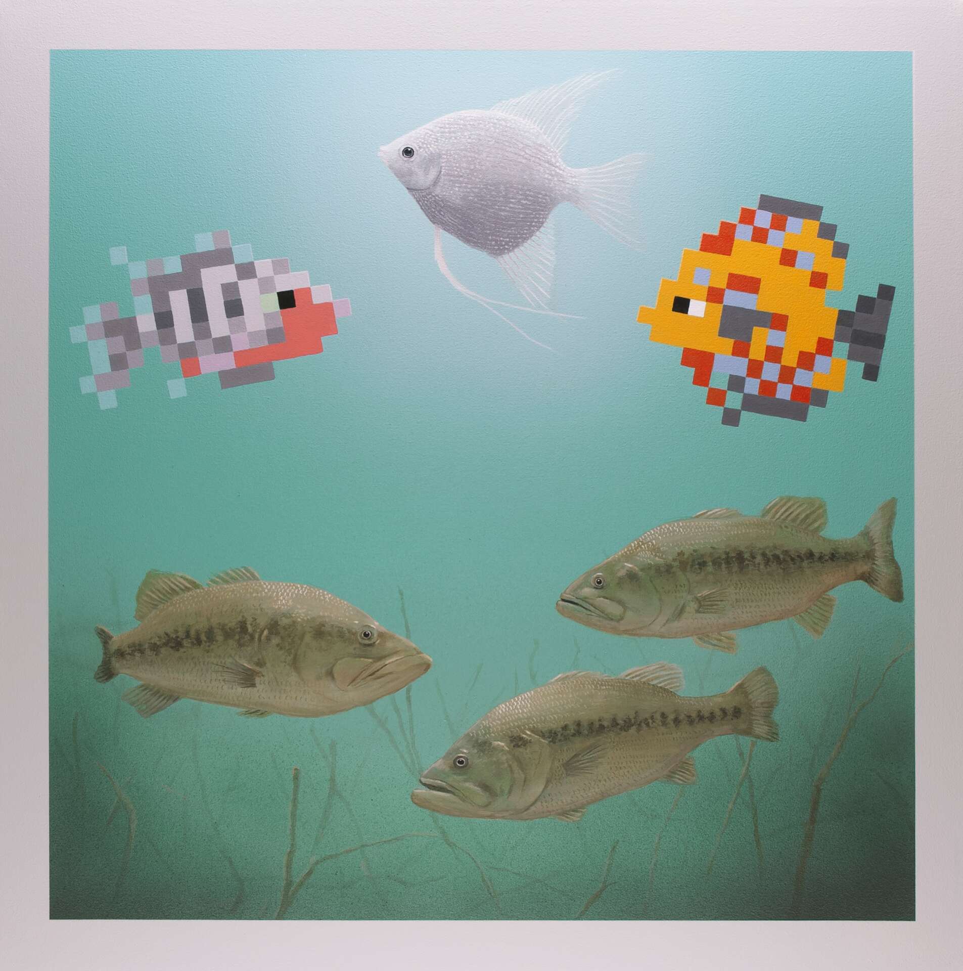 My current ongoing series, Quest of the Steelhead, is a collection of paintings depicting scenes from an imaginary video game about sport fishing on the St. Joseph River of Indiana (and Michigan). The series is a blend of fantasy and reality. While some compositions represent actual ecological locations, others depict fictitious arrangements with nonnative fish species that are intended as metaphors for the complexities of human existence. In this aquatic world, pixelated images become symbolic of the intangible, questioning the nature of awareness and how one understands what one cannot physically perceive.