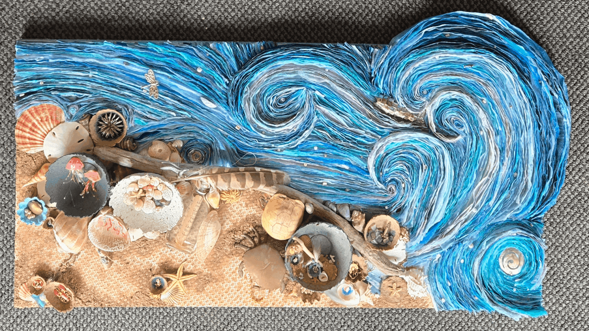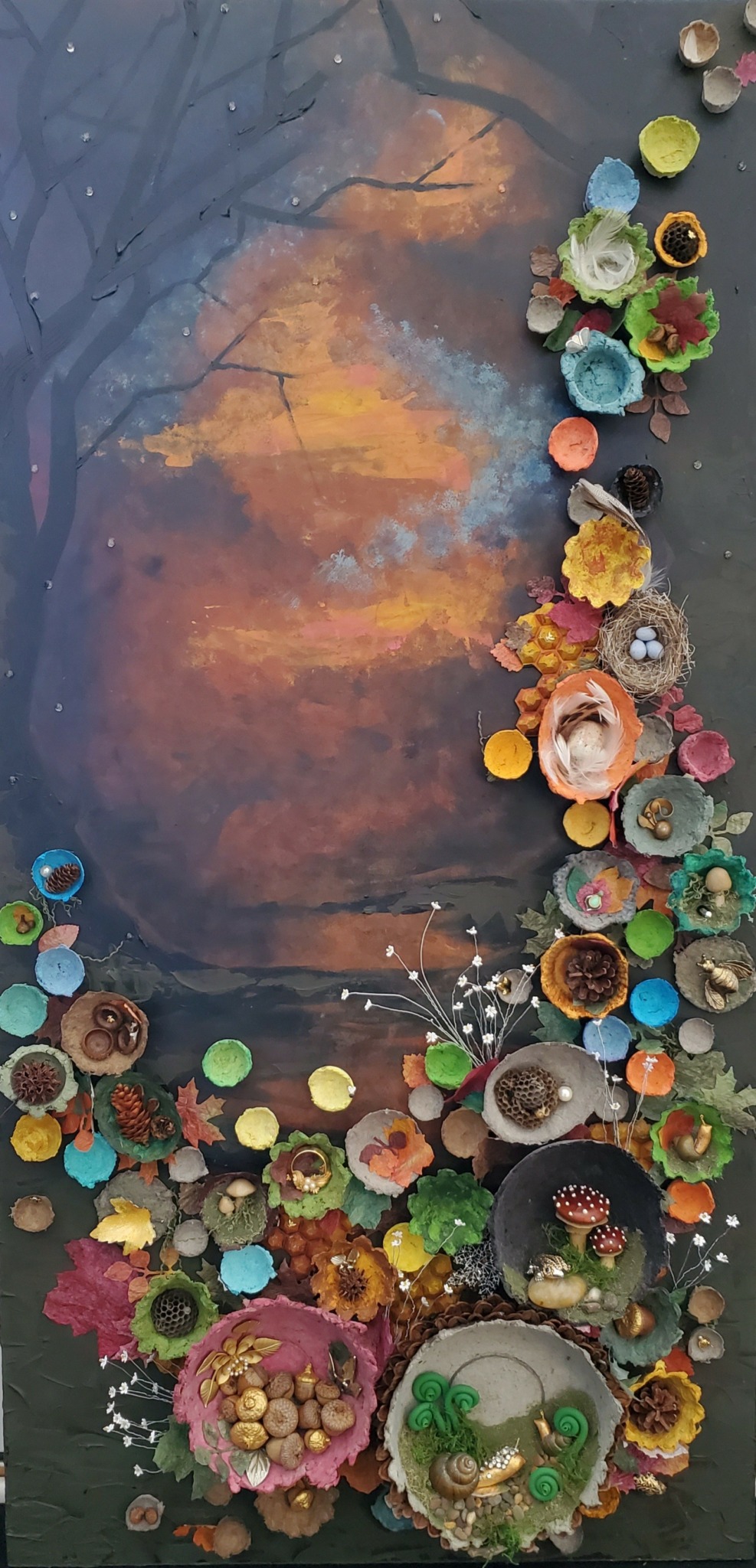 I think what sets me apart is the same thing that I am most proud of. I work collaboratively with my daughter and we have been able to keep patrons on their toes because our work is hard to categorize and different than many other artists. We upcycle 85% or more of each piece, finding beauty in things that others have cast aside while also paying homage to Mother Nature by incorporating nature, both literally and figuratively into our work. We are currently working on a moon series that will debut this fall.