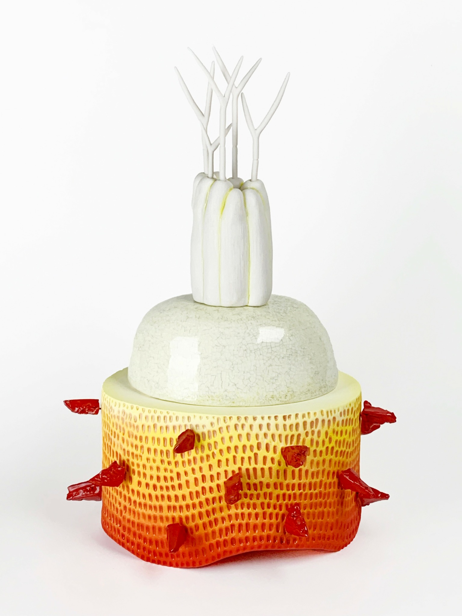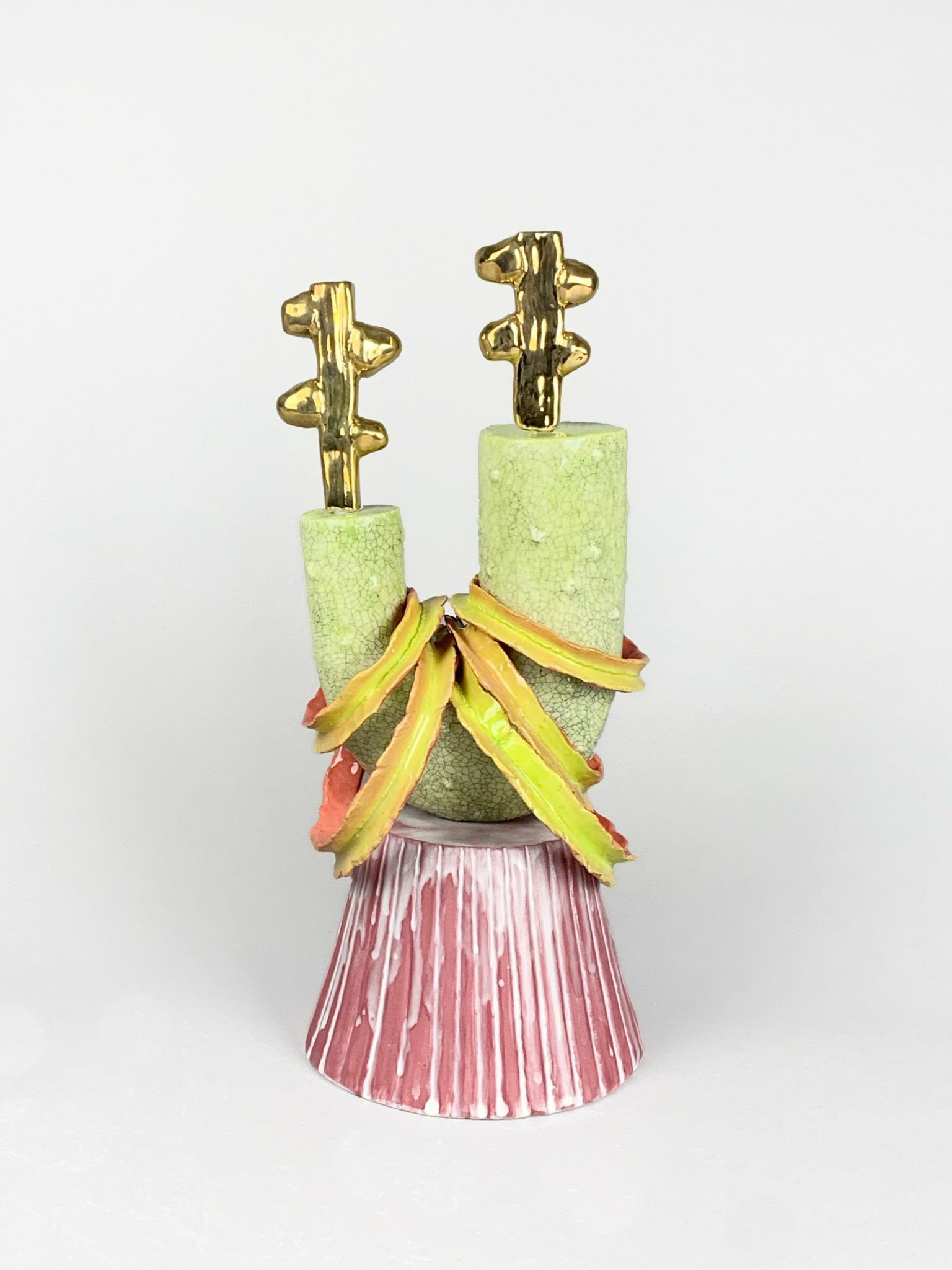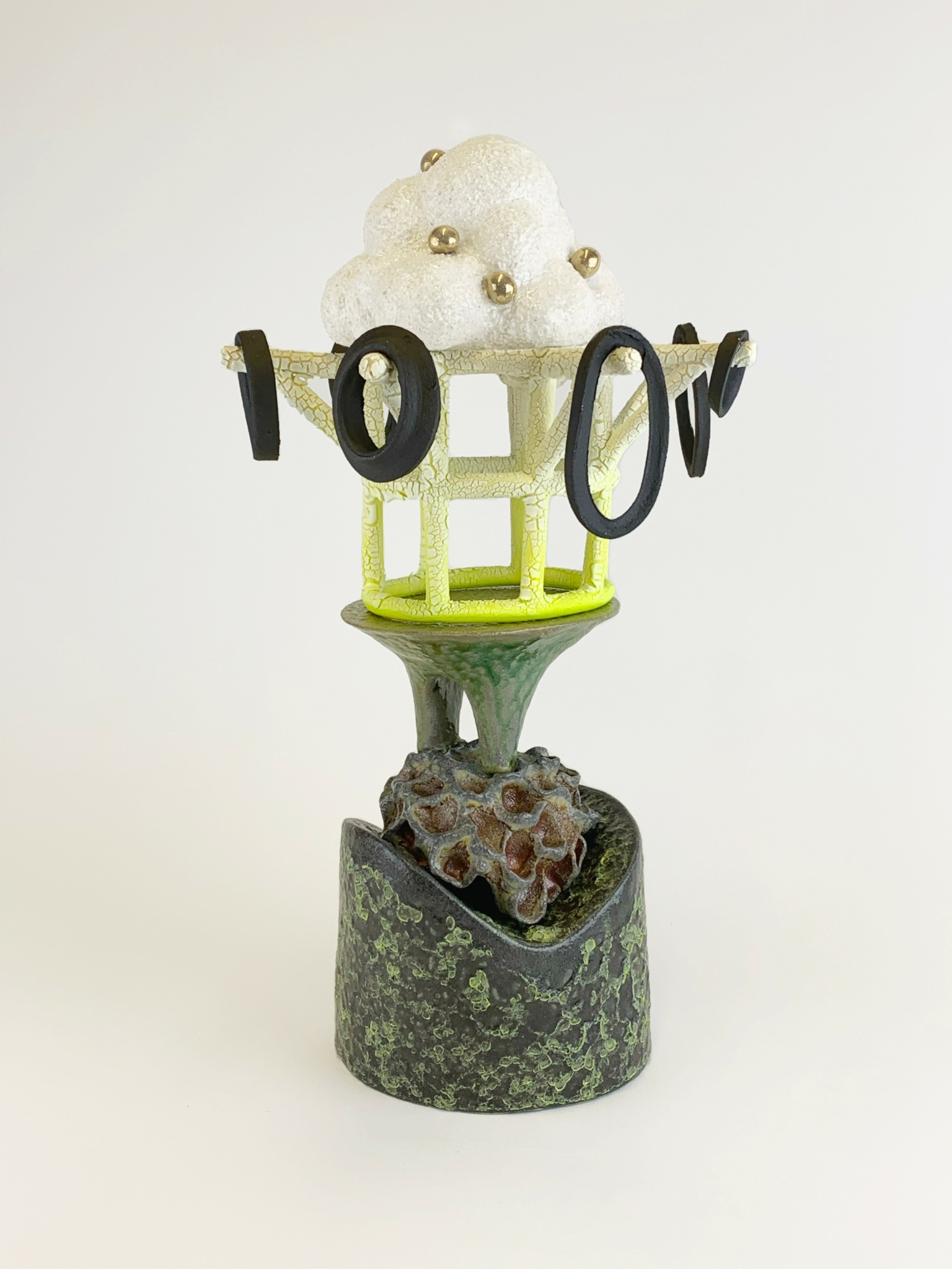 My most recent body of work, one I’ve been composing for a year and a half is centered around abstract ceramic stacked objects. This body of work, titled Trophies, is a slow accumulation of forms. I cultivate an idea and methodically feed it, drawing from the shapes and structures that surround me. Each element carries its own glaze, firing process, or clay body, creating layered relationships that shift between compositional formats. Spontaneity is central to my practice. I create structures that invite experimentation, trial and error, and unexpected contrasts of surface and silhouette. I use form as my language of expression, just as a poet uses words or a musician uses sound.